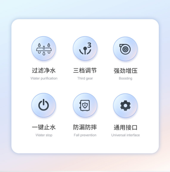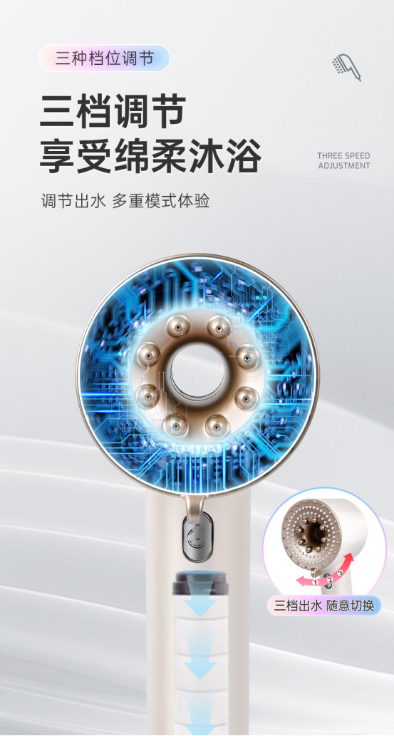 三档调节,享受绵柔沐浴。 调节出水,多重模式体验。