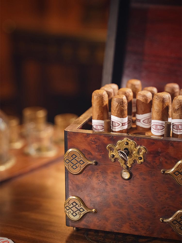 19世纪末20世纪初法国出品几何纹及古典肖像主题铜雕装饰胡挑木贴面雪茄盒