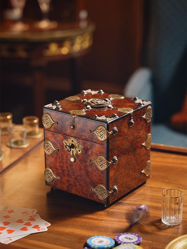 【已售】独角鹿西洋古董 19世纪末20世纪初法国出品几何纹及古典肖像主题铜雕装饰胡挑木贴面雪茄盒