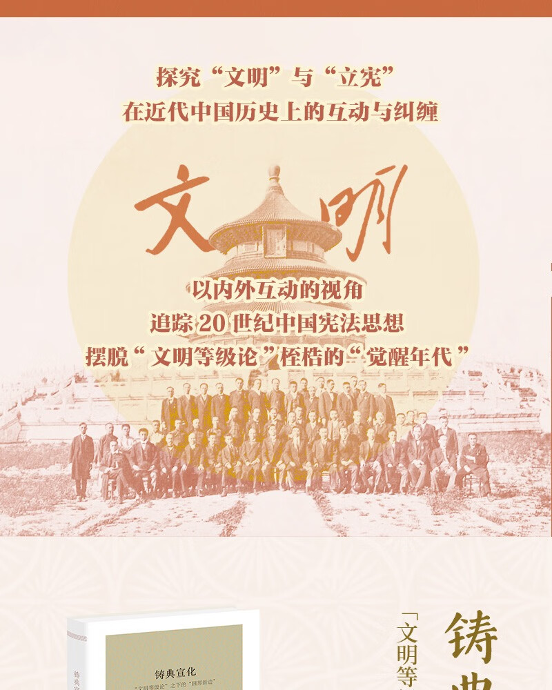 这本书偏重探讨近代中国宪制思想与“文明”观念的变迁,阐述中国宪制探索的文明史意义。通过梳理“文明”的话语体系与成文宪法的全球化传播,研究近代中国的“立宪”观念与道路,探讨“文明”的话语在“立宪”传播中所发挥的重要作用,帮助我们理解近代中国立宪改革背后的历史逻辑与思想渊源,把握国际体系与国内立宪改革间的深刻关系,思考中国近代政治的发展脉络。