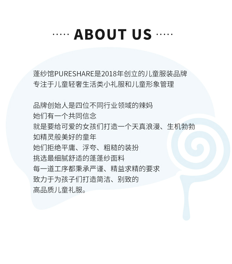 - PureShare蓬纱馆,2018年创立的儿童服装品牌,专注于儿童轻奢生活类小礼服,主张“让孩子做最独特的自己”的品牌理念,为孩子们提供时尚简洁、优雅而又不失童真的生活类礼服。