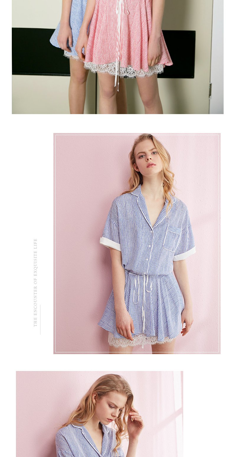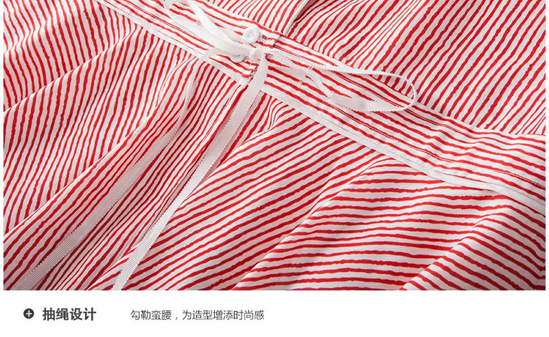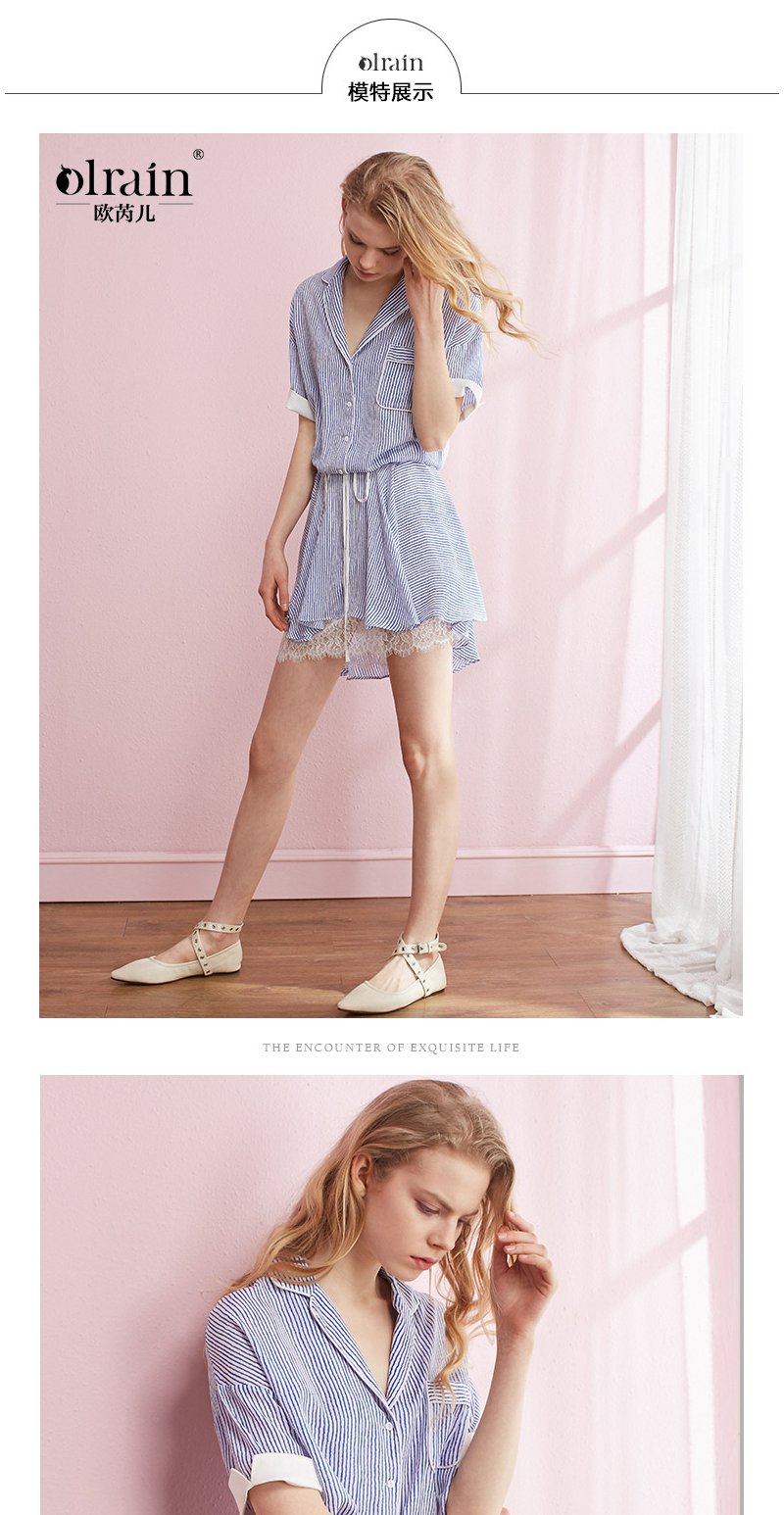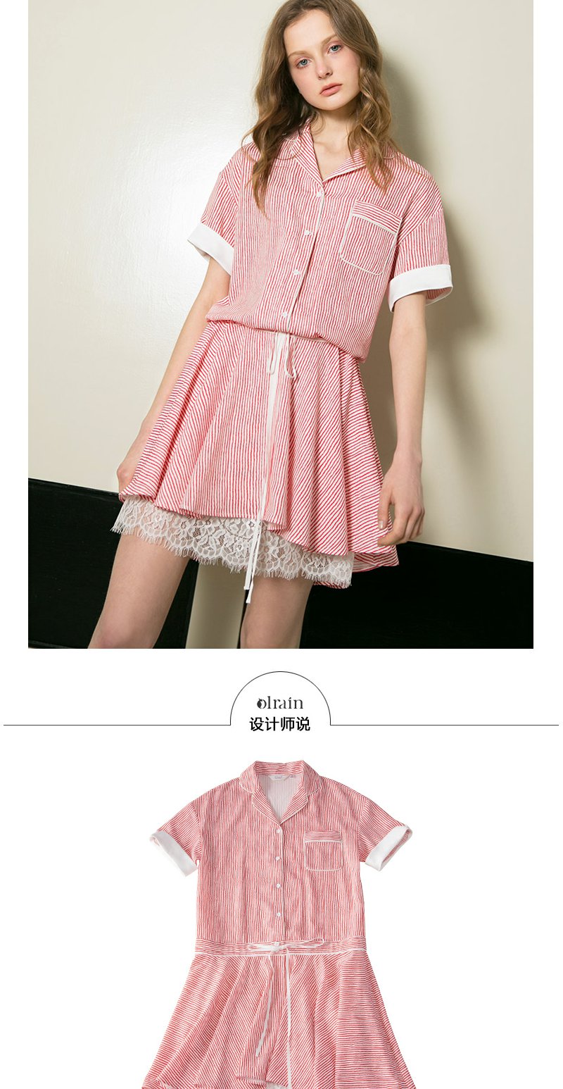 欧芮儿条纹衬衫裙女蕾丝系带收腰连衣裙女夏中长07XLB3100