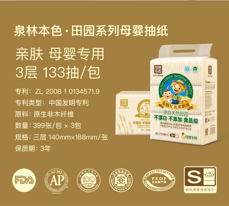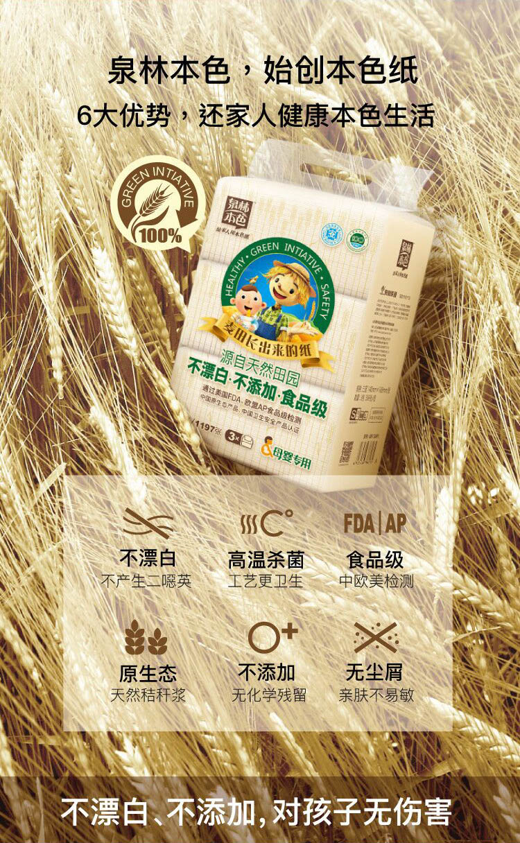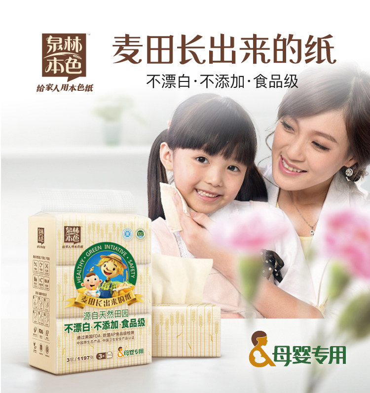 泉林本色抽纸 不漂白母婴3层133抽软抽*3包(无二噁英残留 本色卫生面巾抽纸巾)