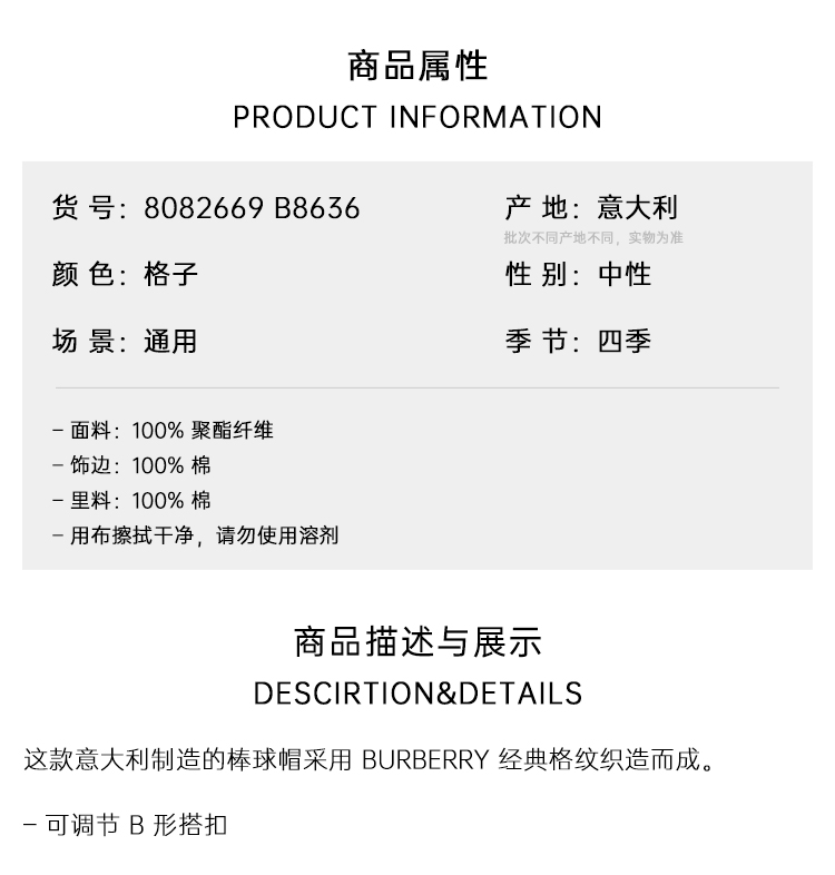 BURBERRY 巴宝莉 中性格纹棒球帽 格子 8082669 B8636