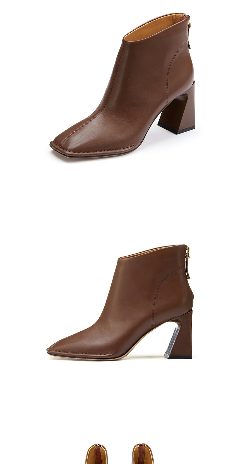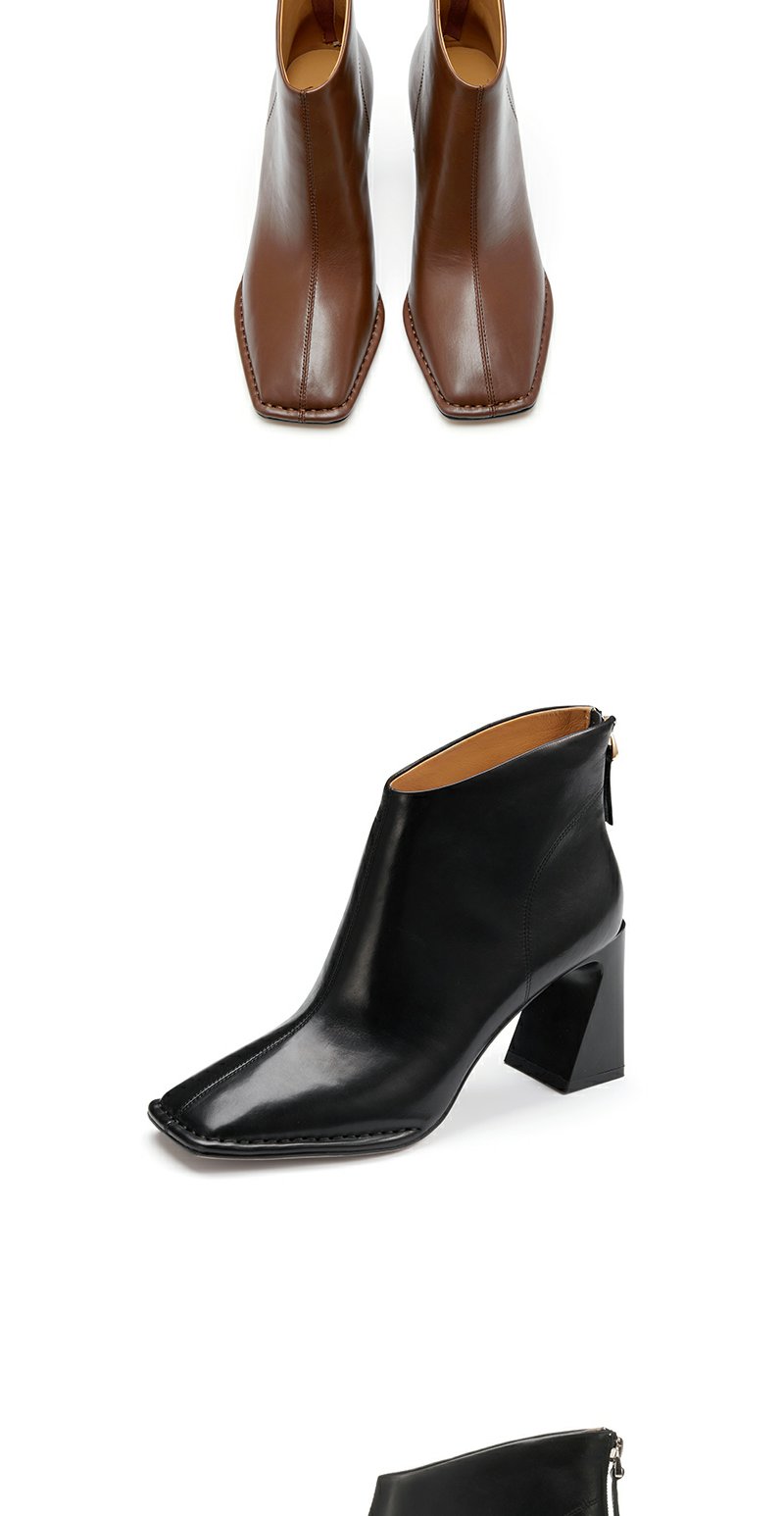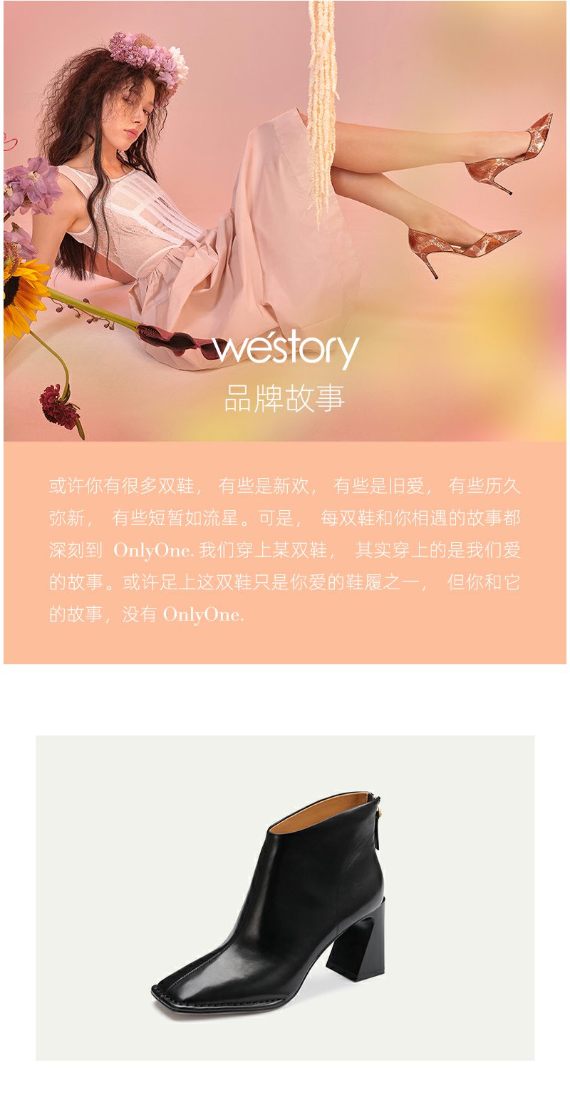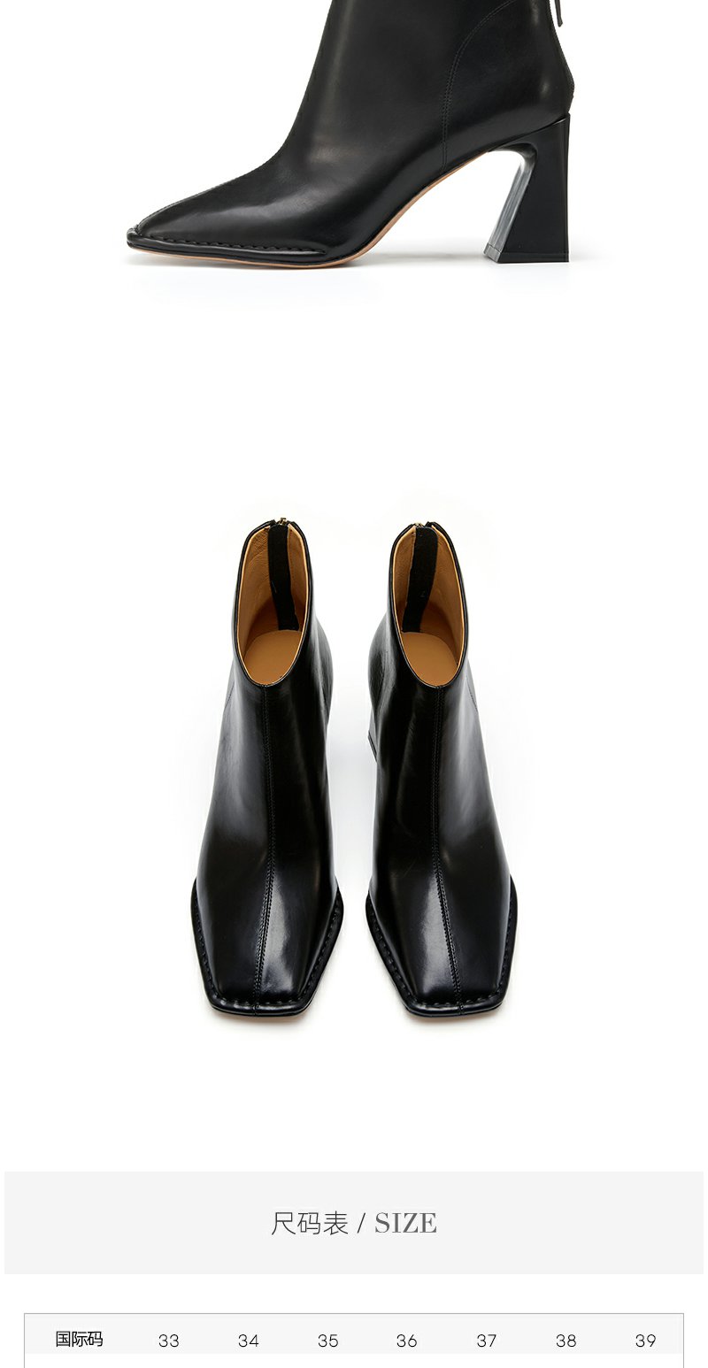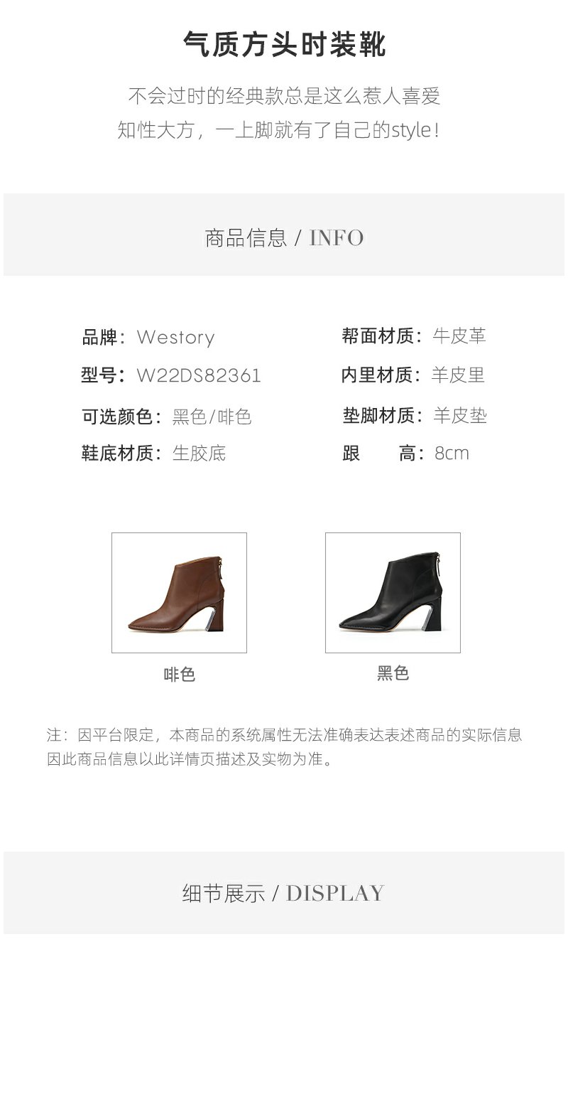 westory秋冬新款方头中缝线纯色粗高跟时装短靴小众82361