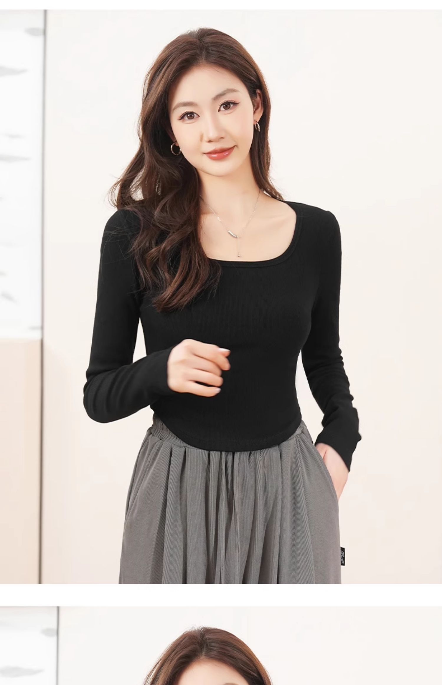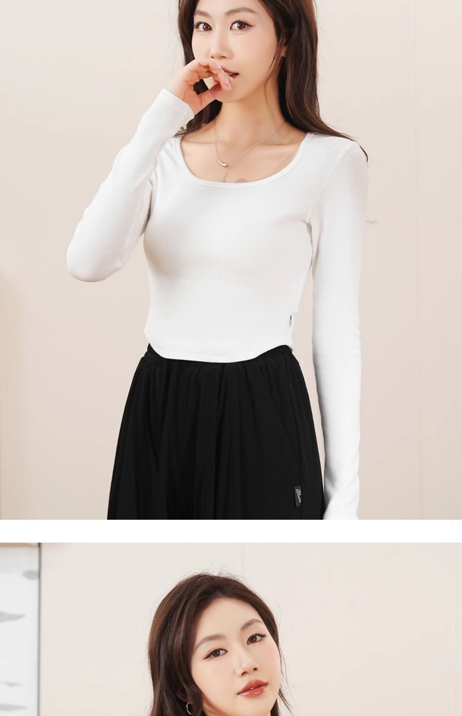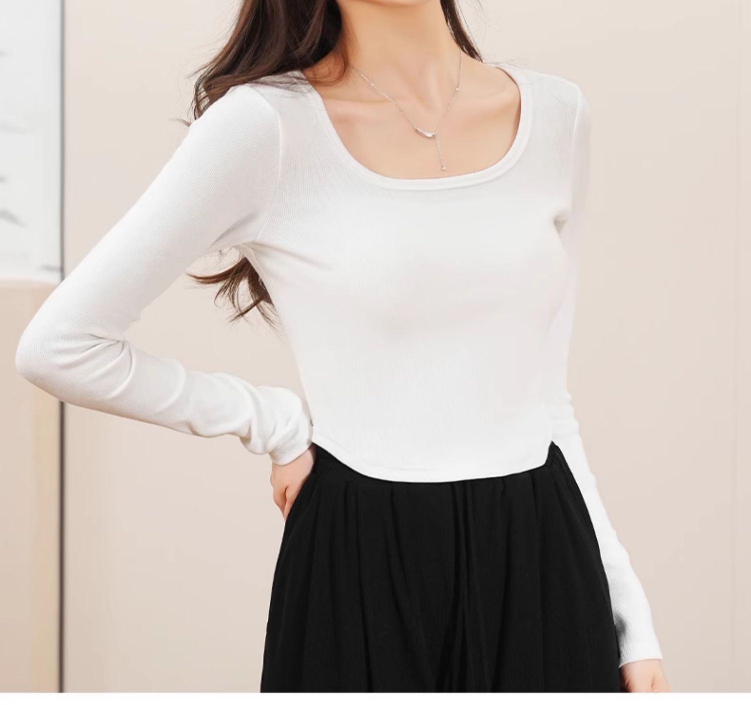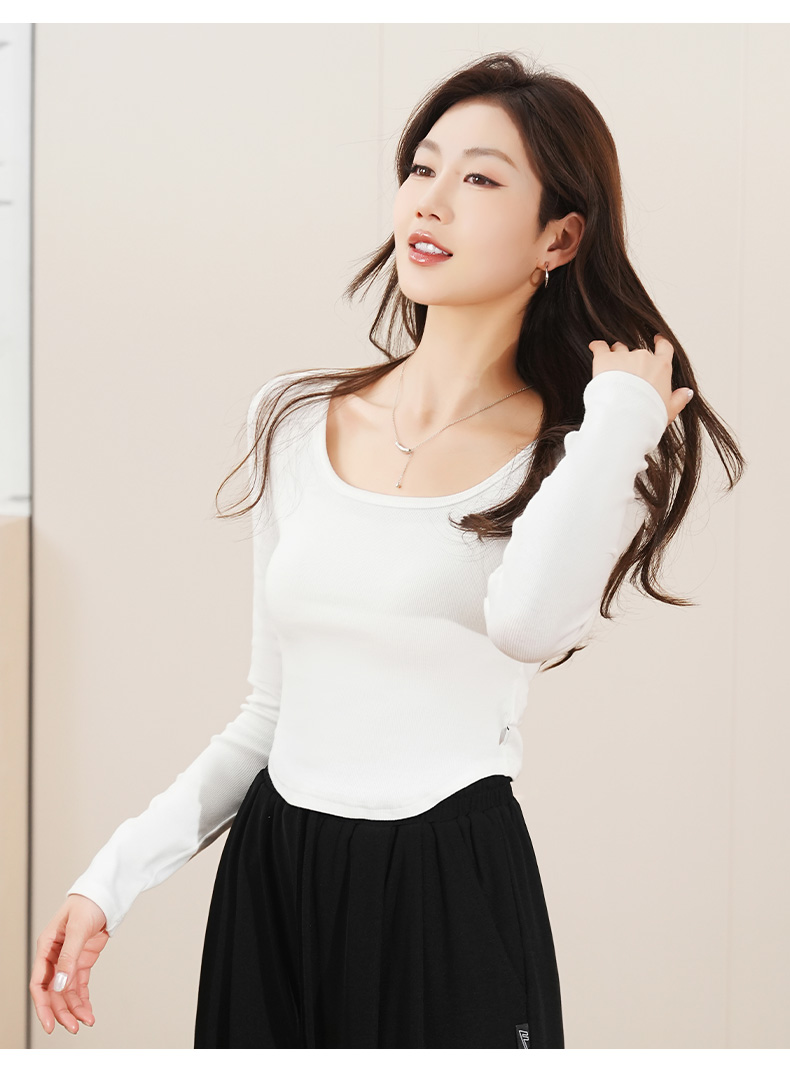 回力白色内搭打底衫女2025春秋夏款上衣修身短款方领纯棉长袖T恤