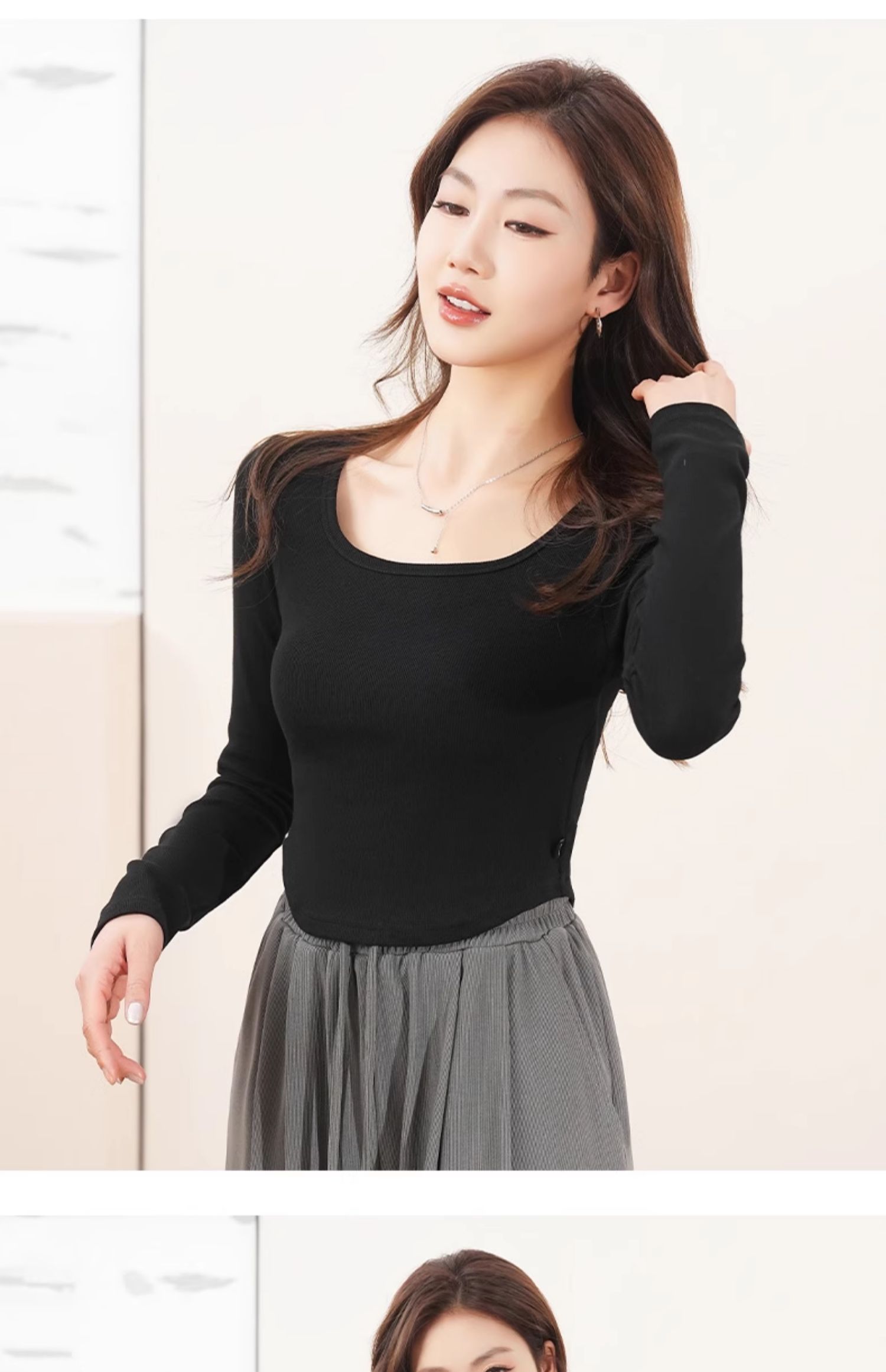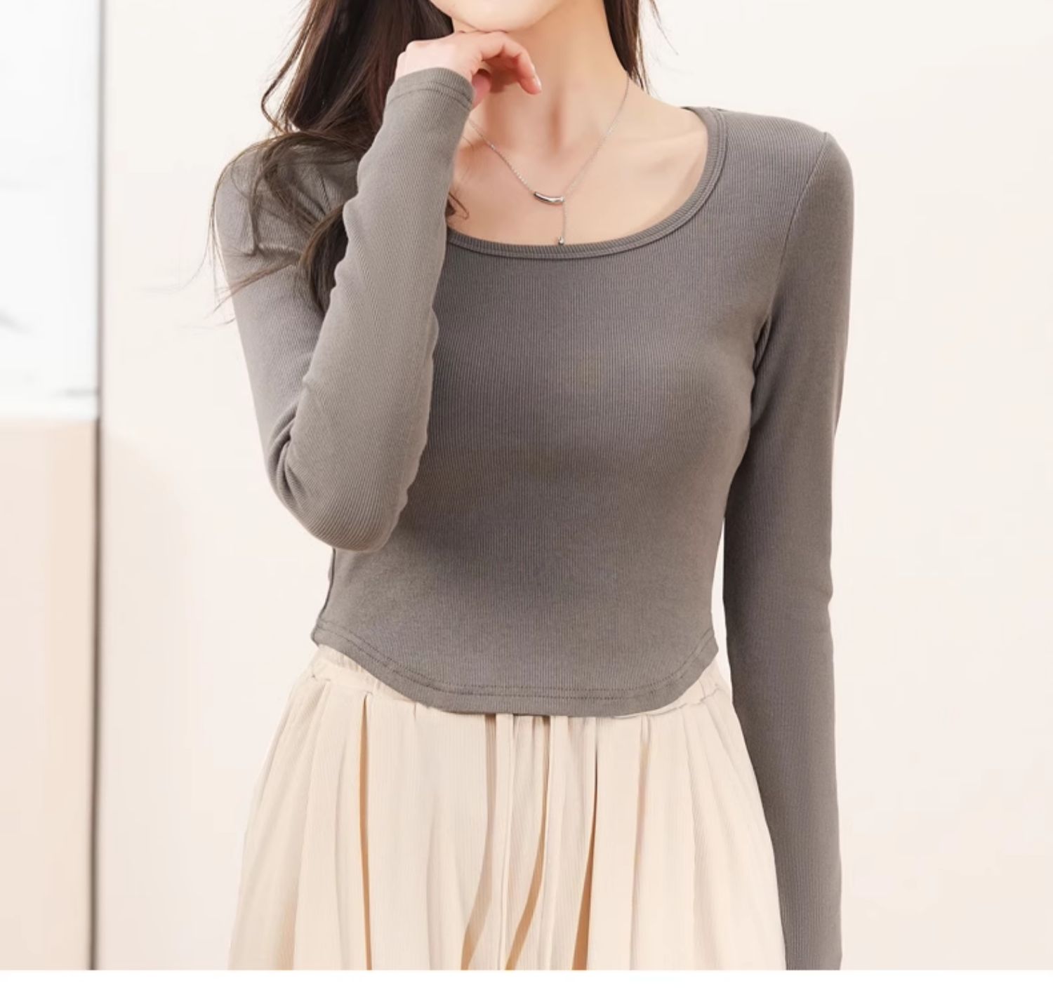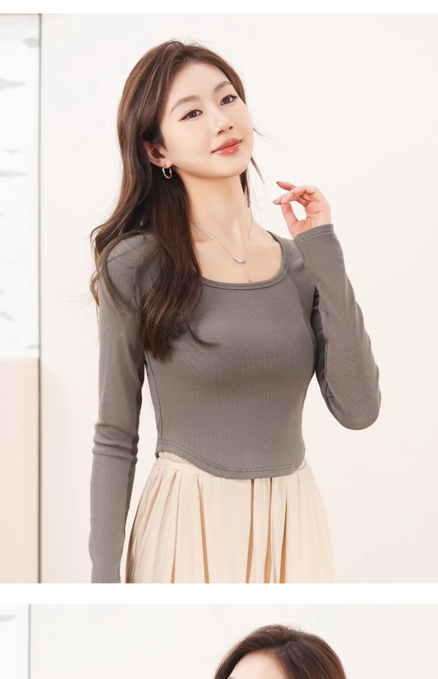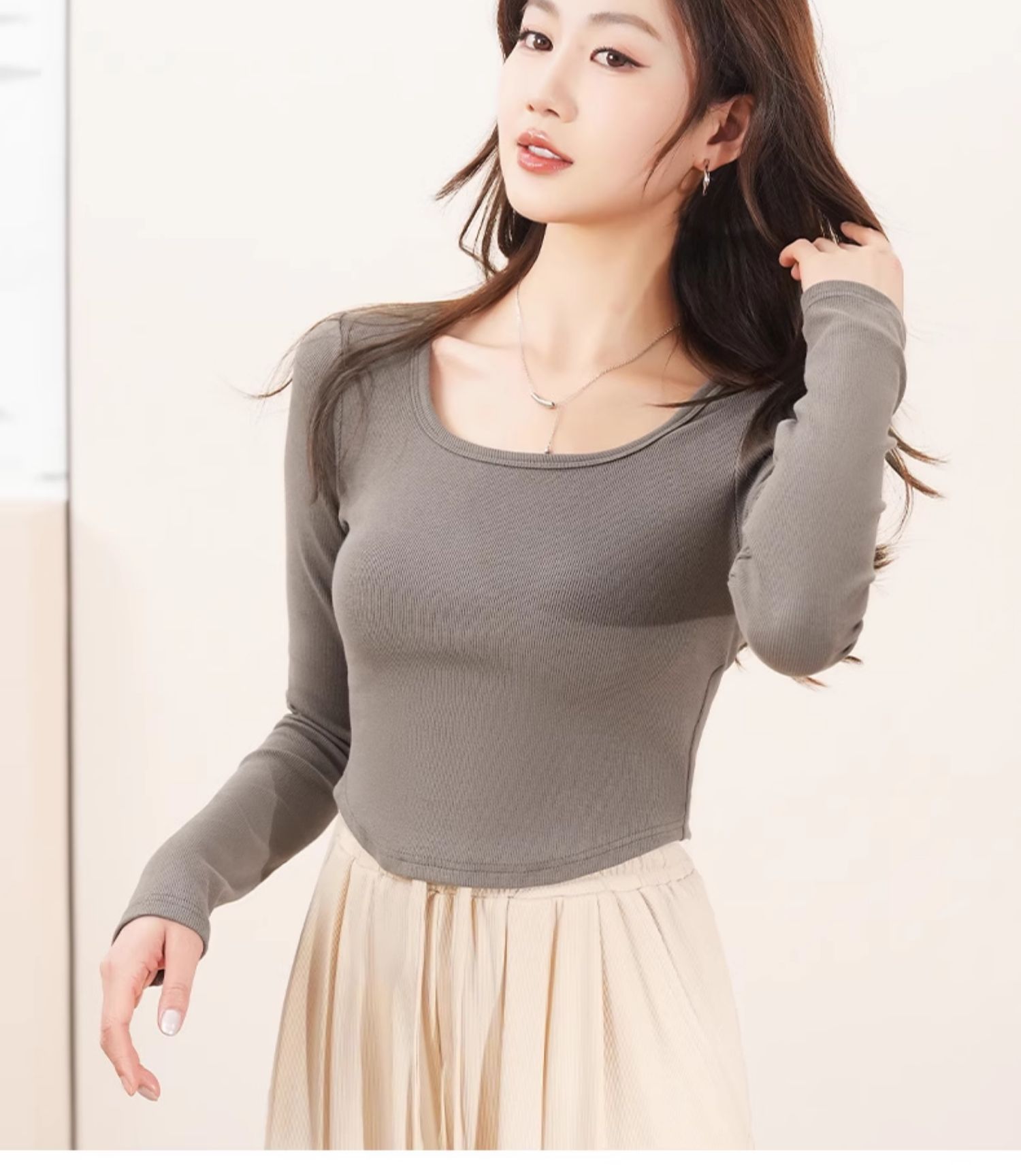回力白色内搭打底衫女2025春秋夏款上衣修身短款方领纯棉长袖T恤