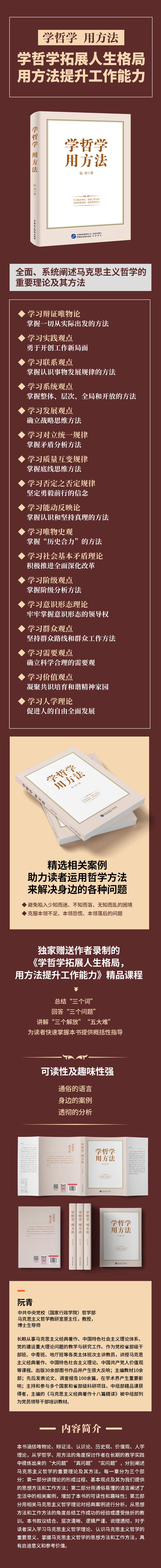 本书涵括唯物论、辩证法、认识论、历史观、价值观、人学理论,从学哲学、用方法的角度探讨作者在长期的教学实践中提炼出来的“大问题”“真问题”“实问题”,分别阐述马克思主义哲学的重要理论及其方法。每一章分为三个部分:第一部分讲理论的形成过程、基本观点及其为我们提供的思想方法和工作方法;第二部分用通俗易懂的语言阐述了生活中的相关案例,增加了本书的可读性和趣味性;第三部分用相关马克思主义哲学理论对经典案例进行分析,从思想方法和工作方法的角度总结工作成功的经验或遭受挫折的教训。本书叙议结合、层次清晰、逻辑严谨、说理透彻,对于读者深入学习马克思主义哲学理论、认识马克思主义哲学的重要意义、掌握马克思主义哲学的思想方法和工作方法,具有启迪意义和参考价值。