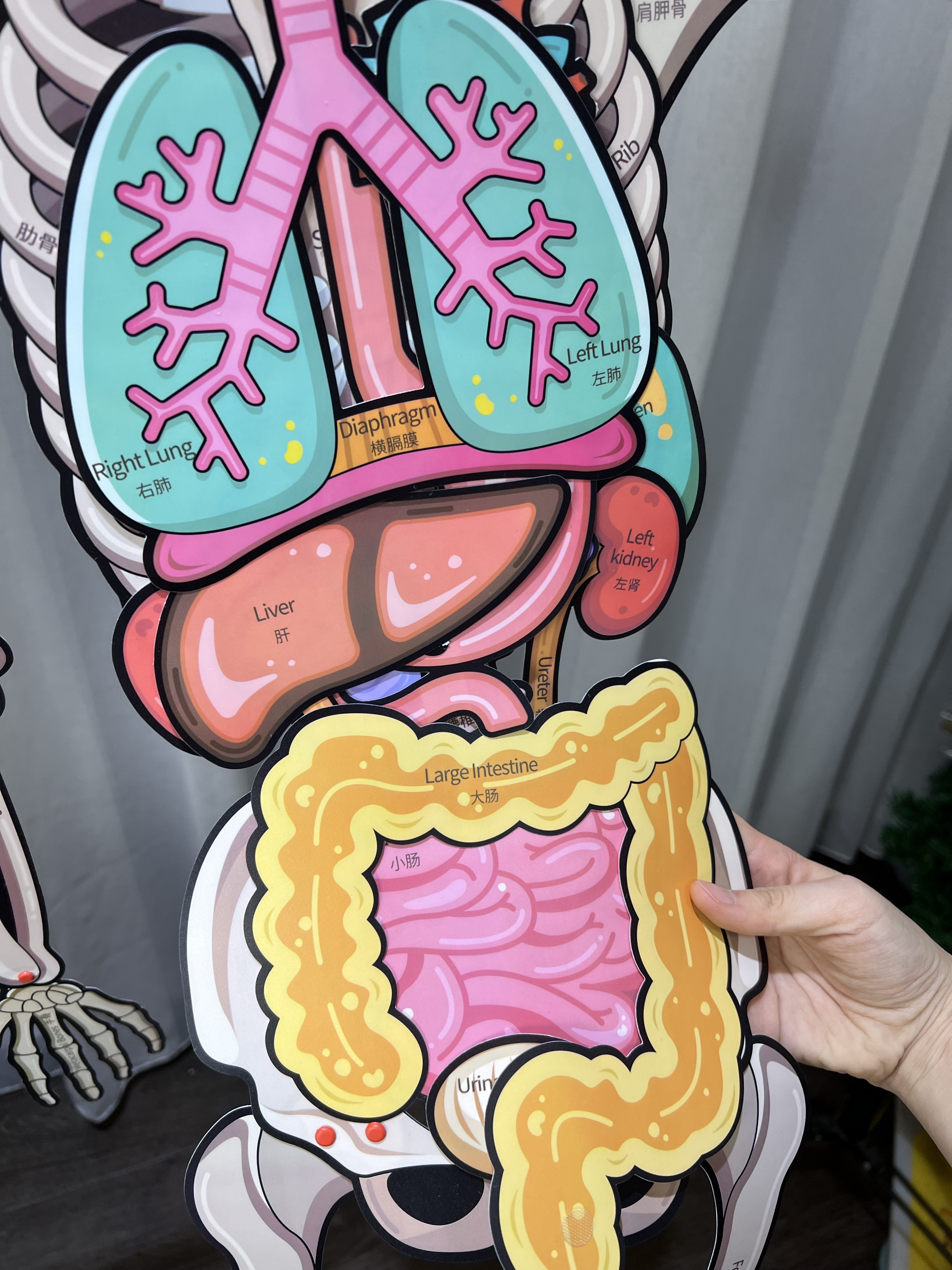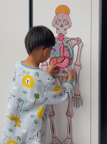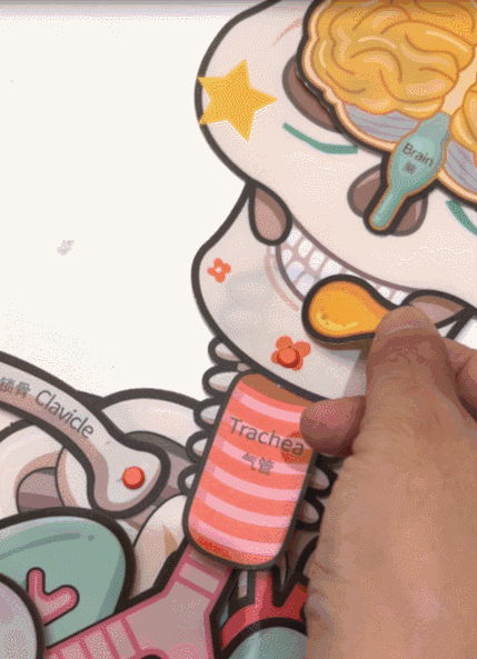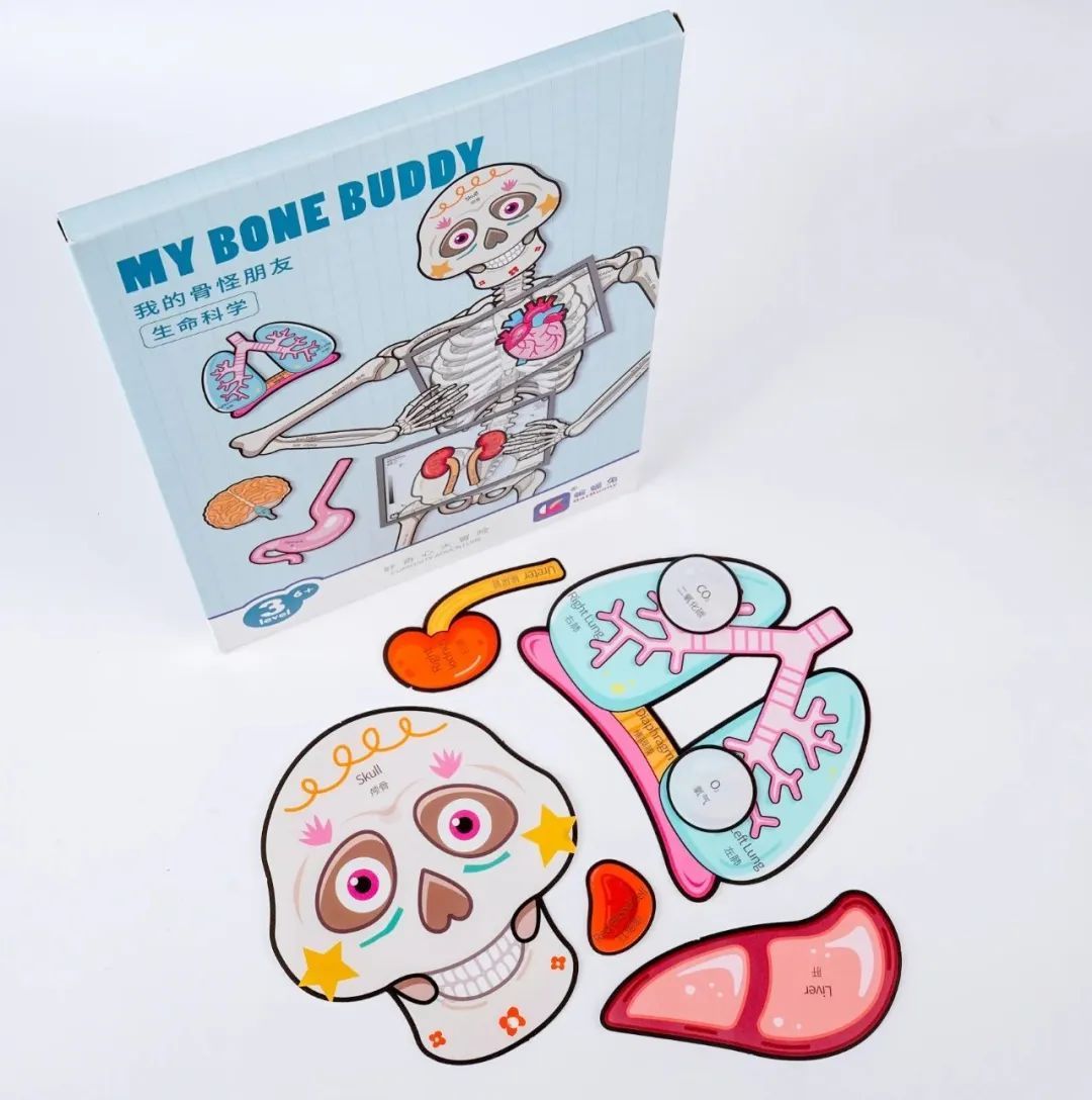 别看它有点“搞笑”😂,科普上可是相当严谨的: 一套骨骼拼图里有13个器官和9个功能片, 每一个部位都有对应的中英双语学名👍, 下次娃哪里疼哪里痛,都能轻松说出名字啦!