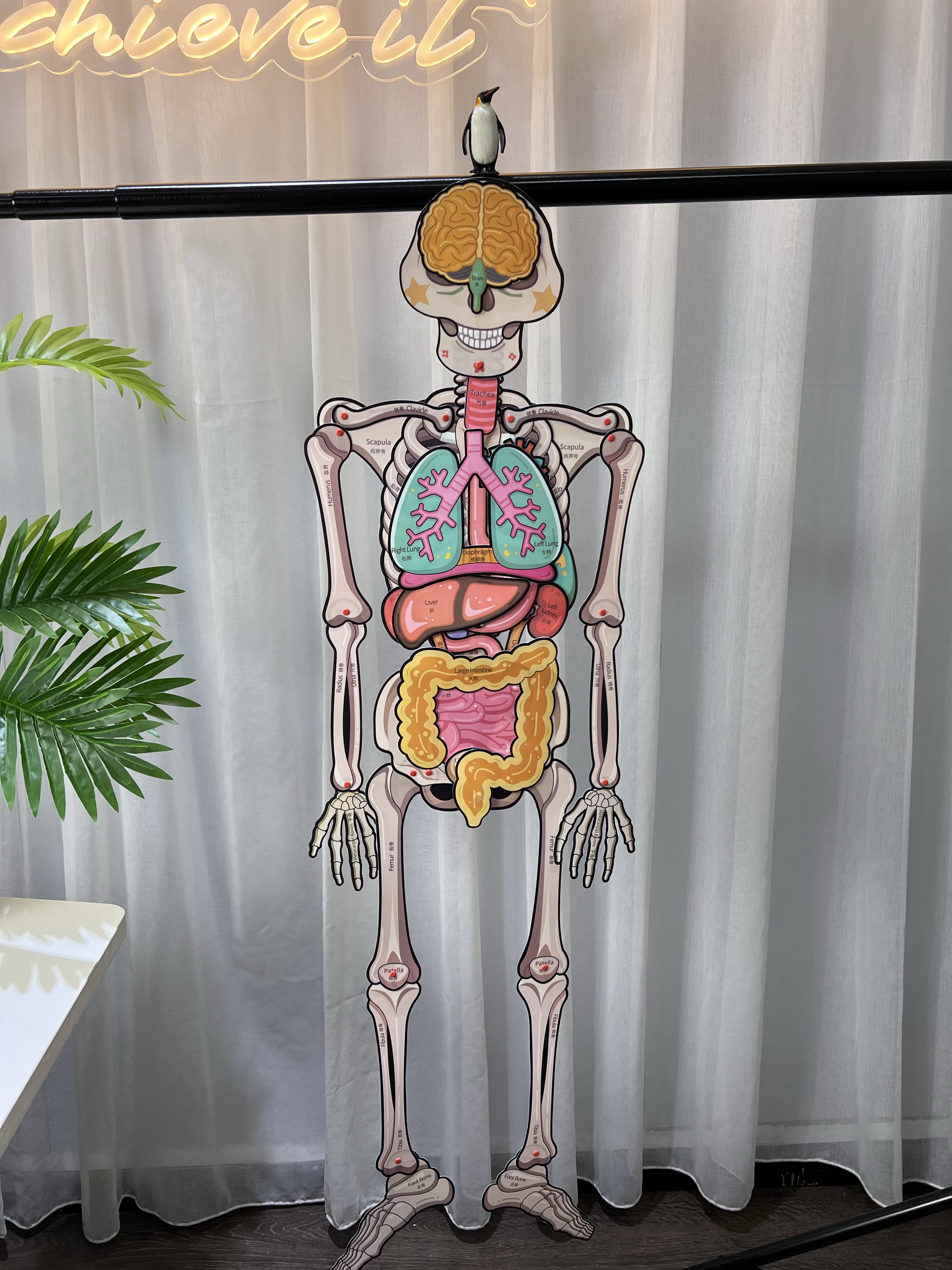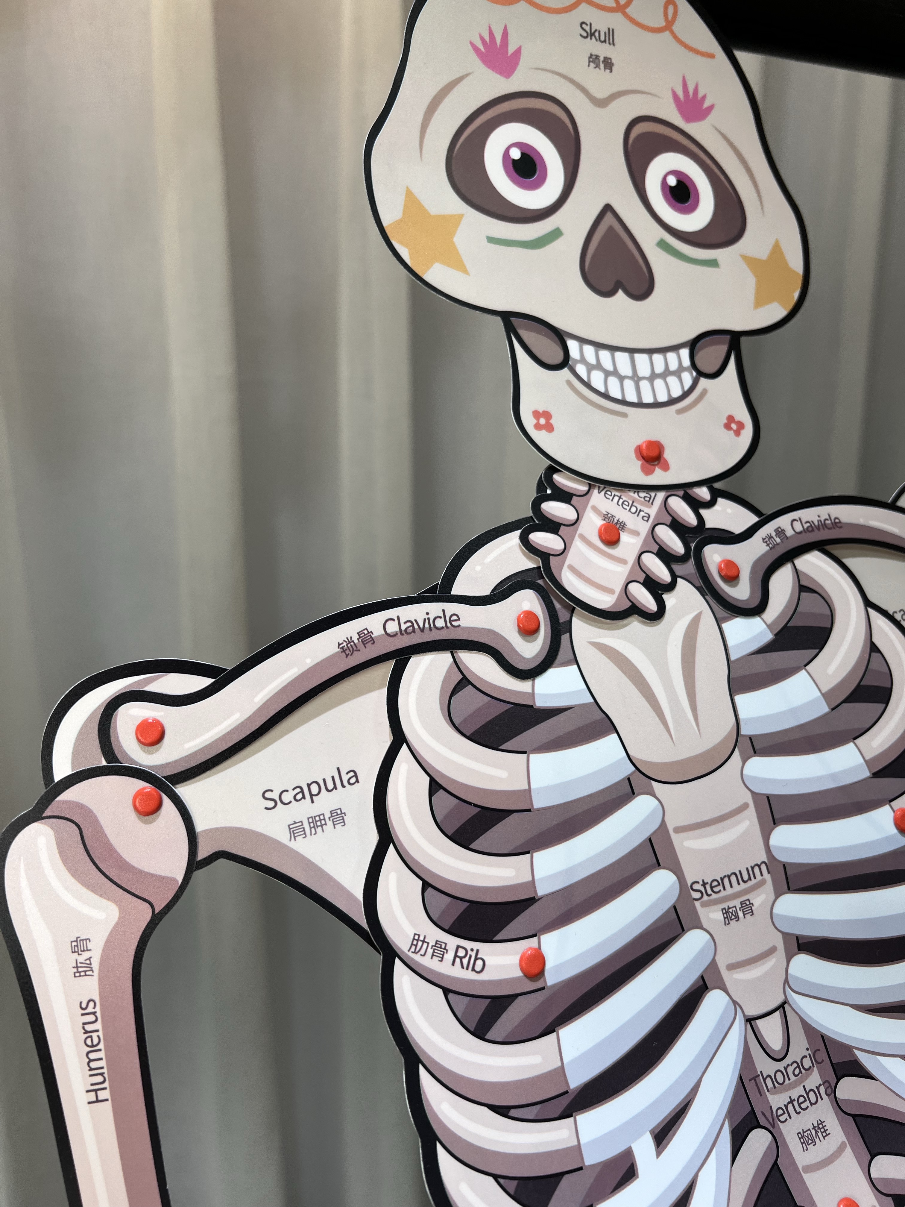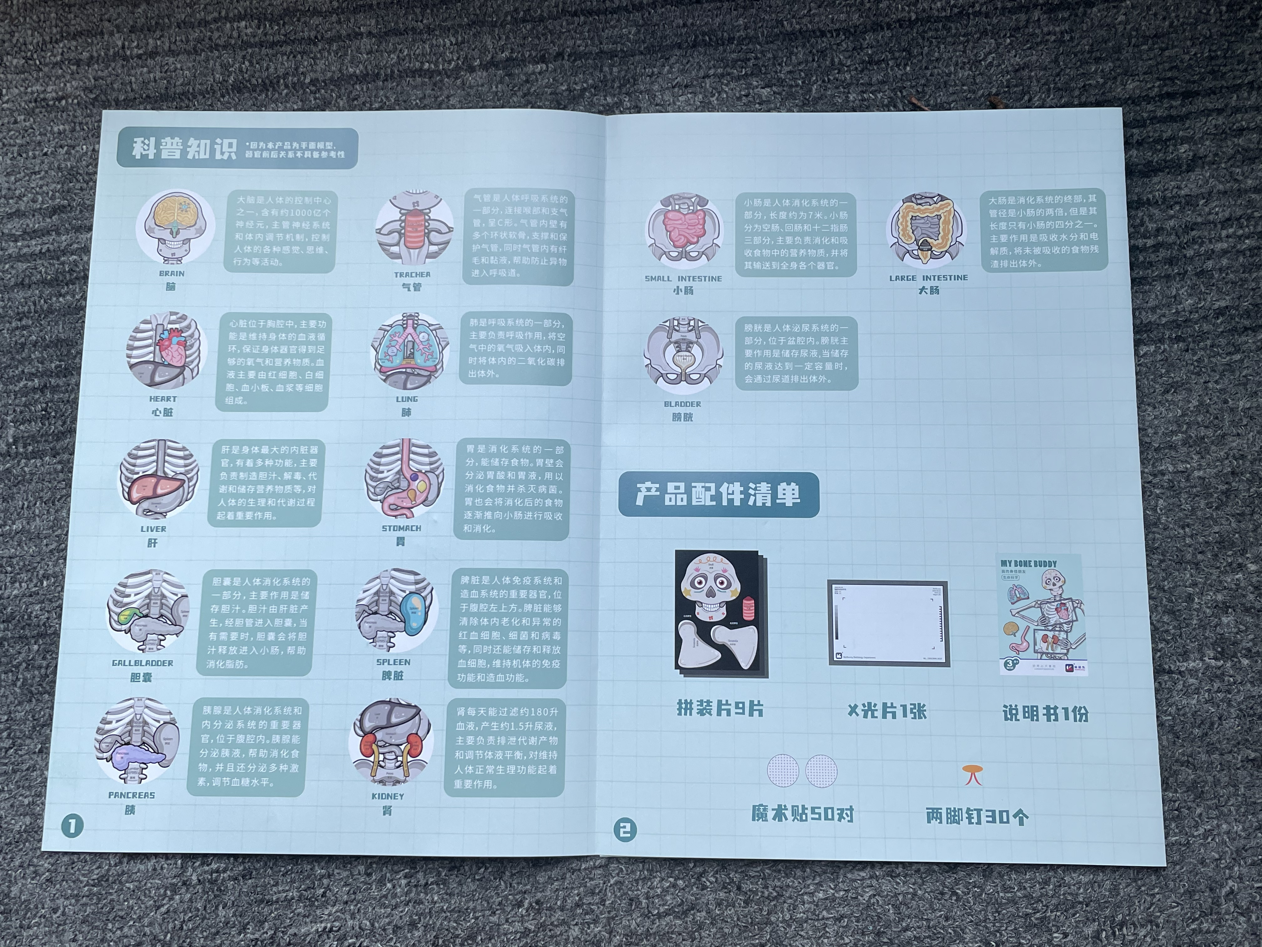 别看它有点“搞笑”😂,科普上可是相当严谨的: 一套骨骼拼图里有13个器官和9个功能片, 每一个部位都有对应的中英双语学名👍, 下次娃哪里疼哪里痛,都能轻松说出名字啦!
