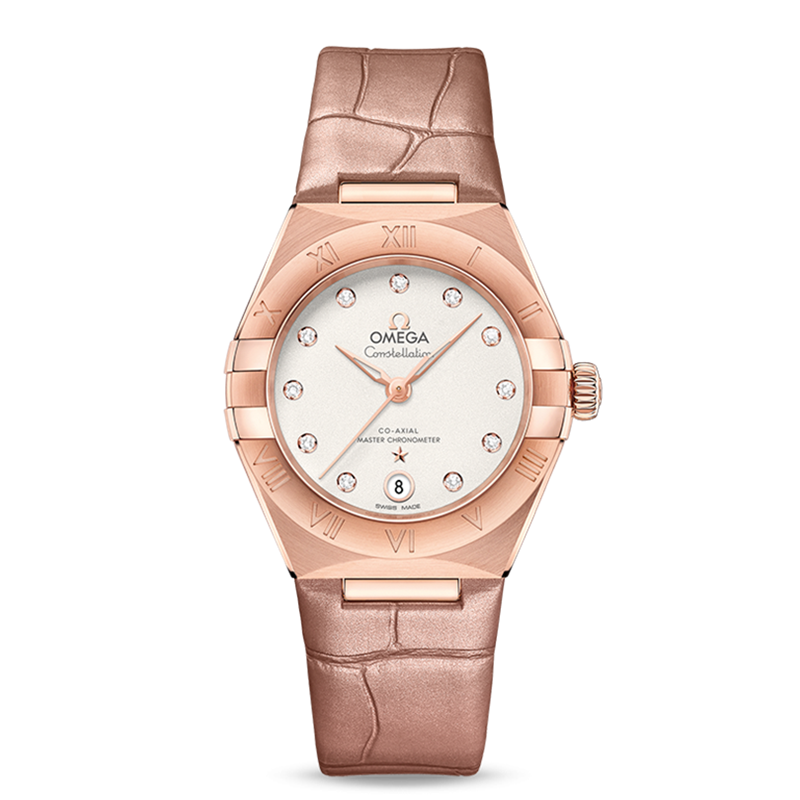镜面材质 | 蓝宝石水晶玻璃 | 表盘 | Sedna 18K表壳 表圈镌刻罗马数字时标,冰霜银色表盘饰有钻石小时刻度,6点位设有日历窗。 指针、欧米茄品牌标识、星徽标志以及钻石托槽亦采用Sedna 18K金制成。 |