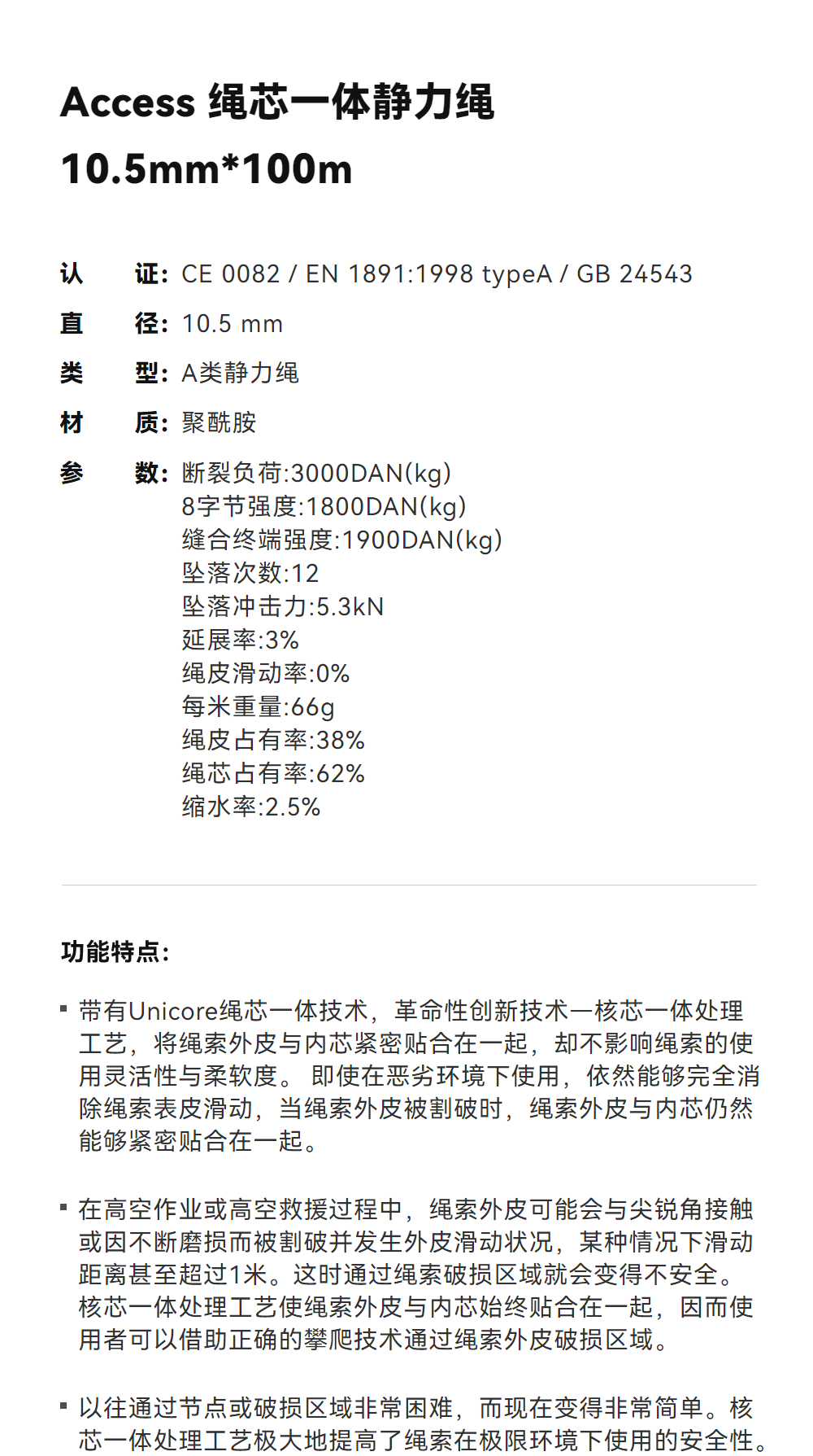 KAILAS凯乐石 Access 绳芯一体 静力绳 10.5mm*100m ER213A【Z】