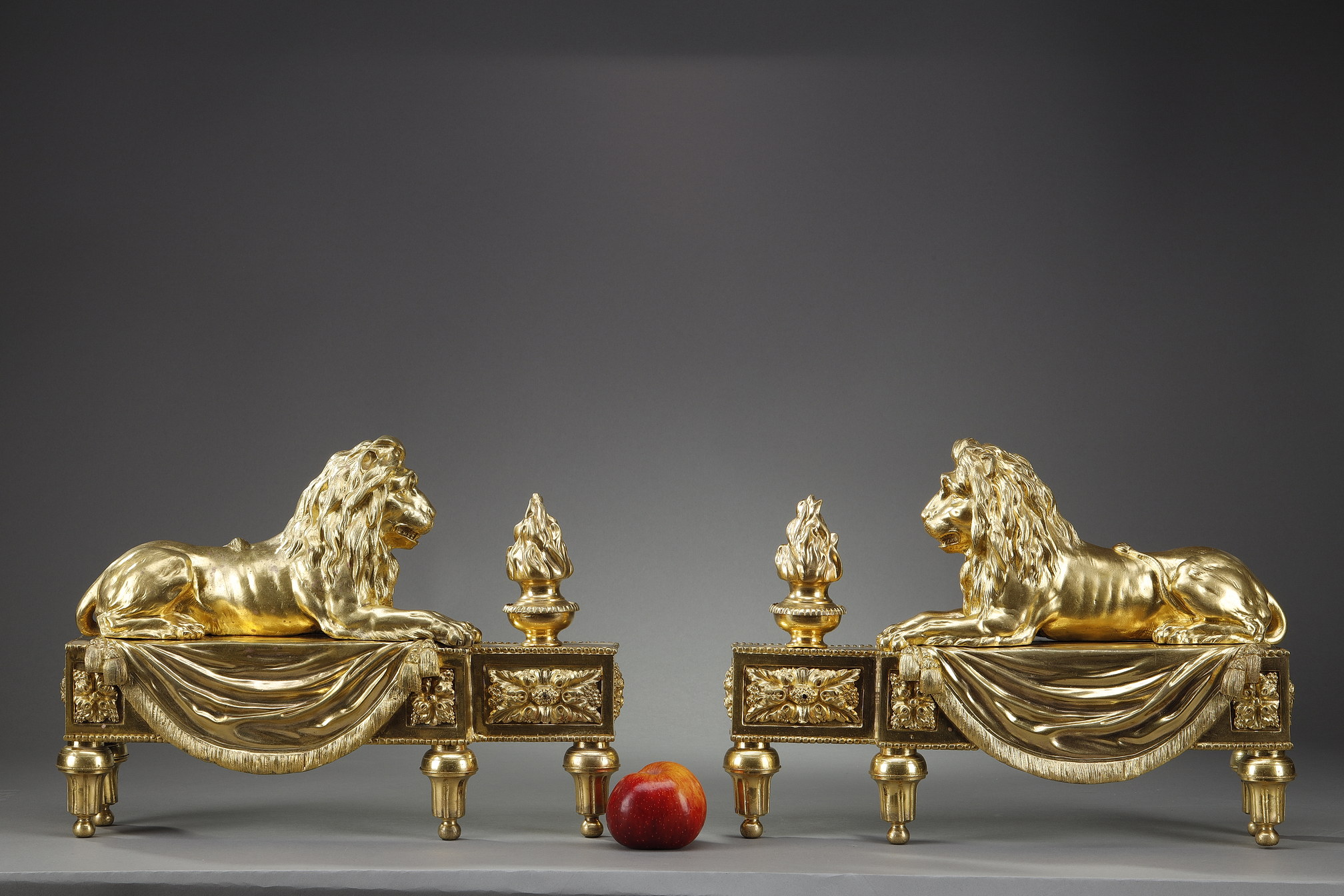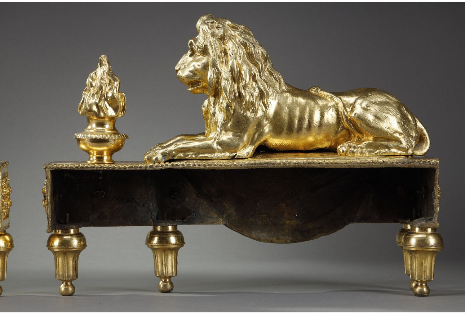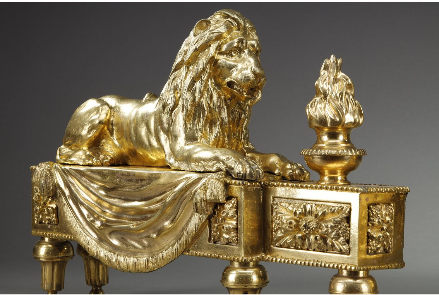 独角鹿西洋古董拿破仑三世时期路易十六风格卧狮铜鎏金壁炉柴架
