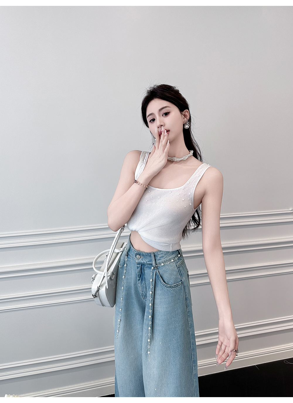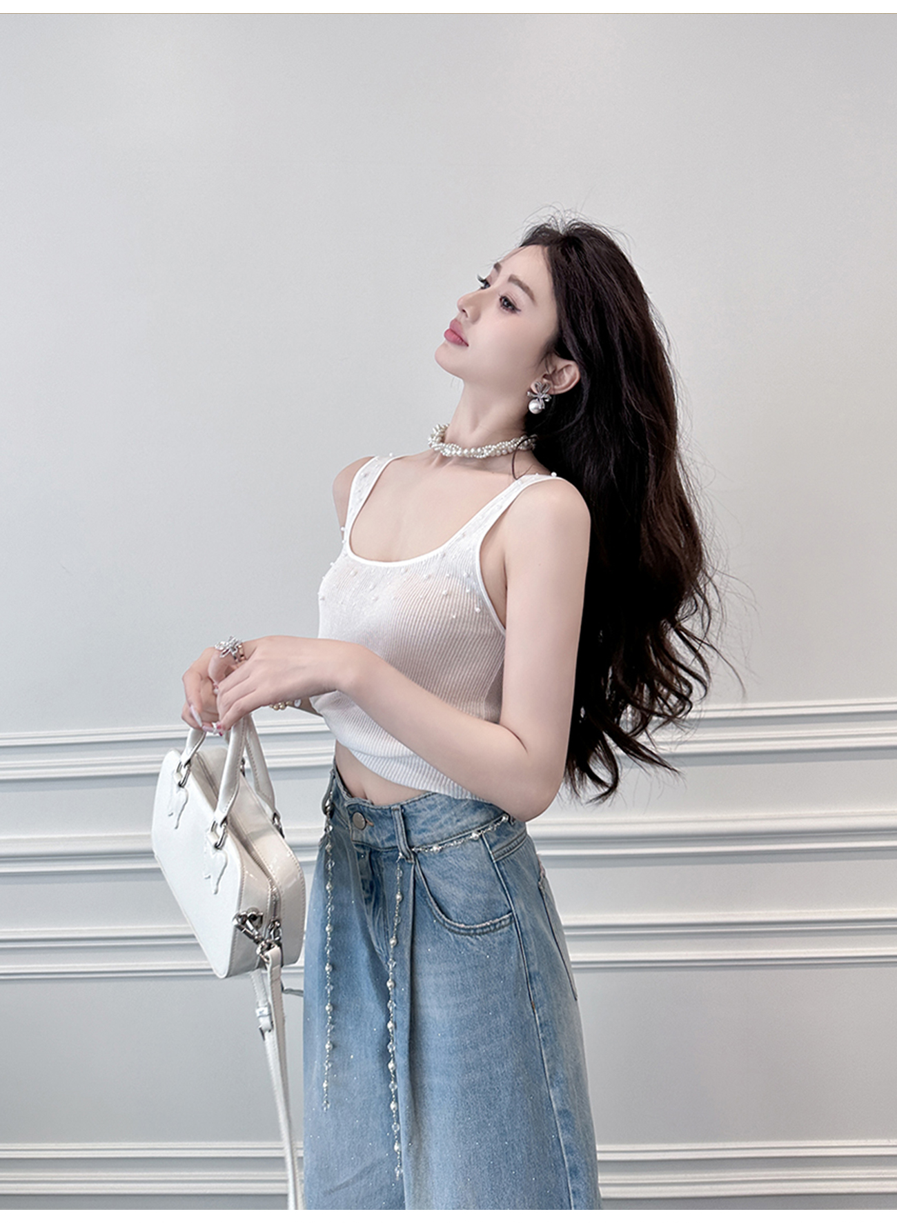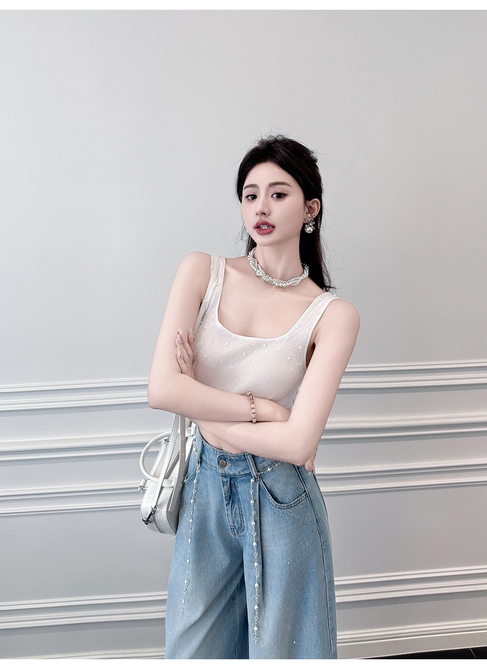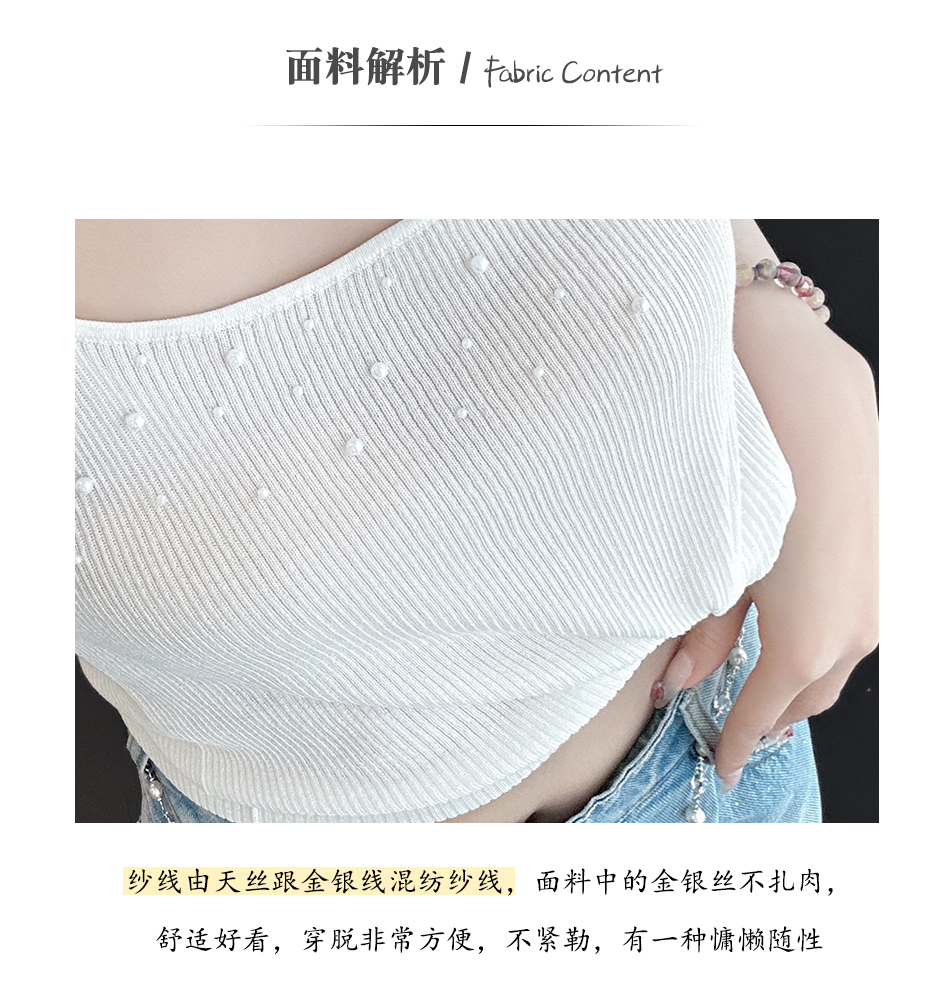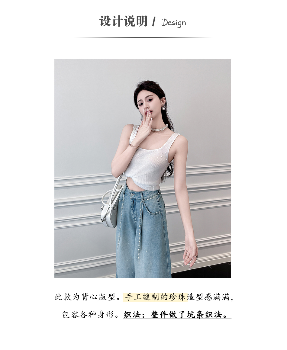 BeQueenStory【珍珠白巧】透气时尚手工缝珠百搭舒适天丝坑条背心