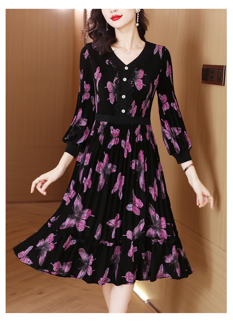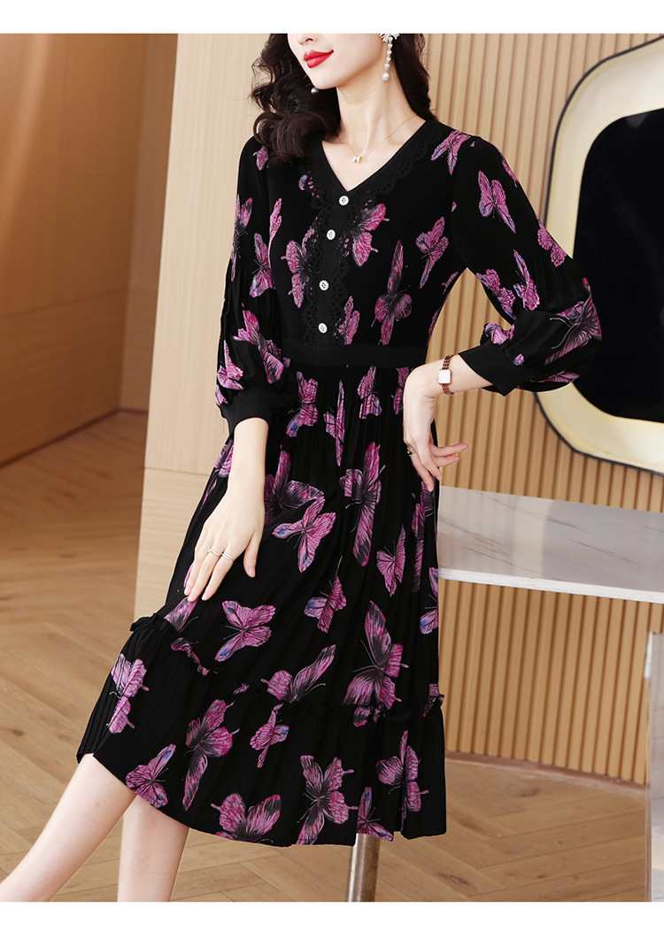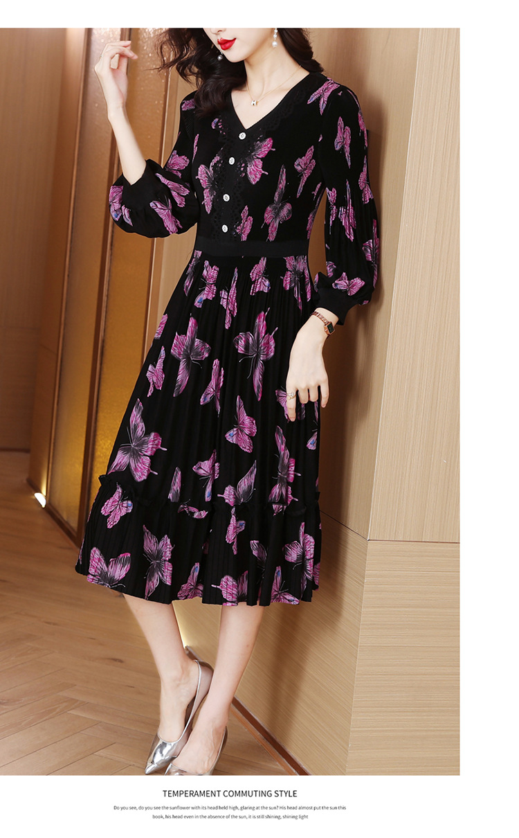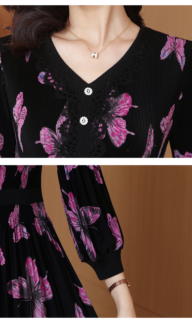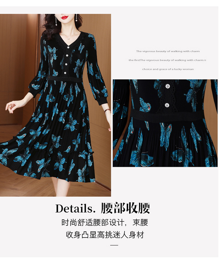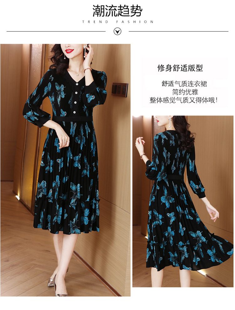 法式复古,秋季新款修身气质显瘦女神范V领百褶裙印花连衣裙AHM-msfs9057