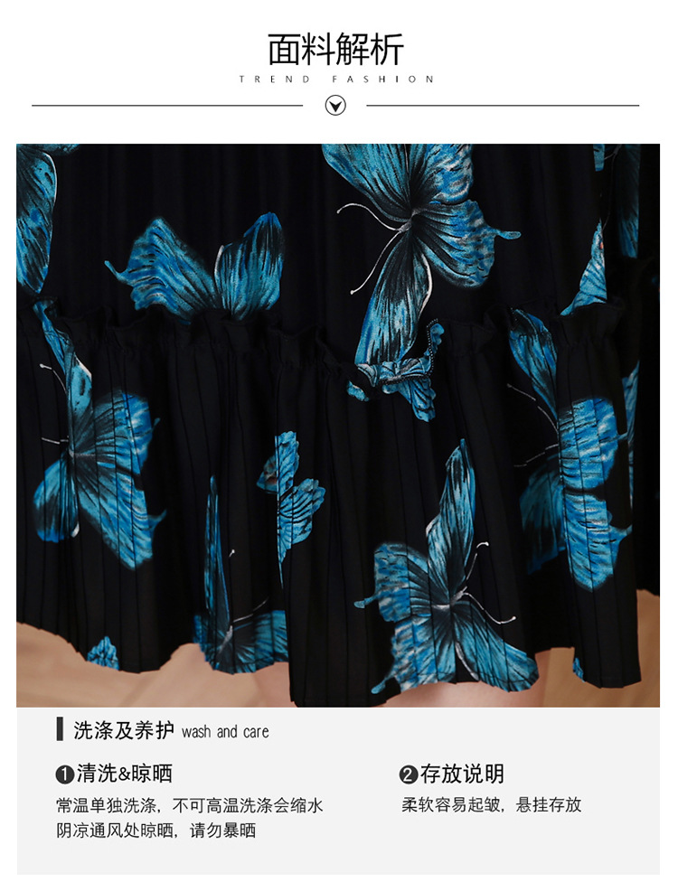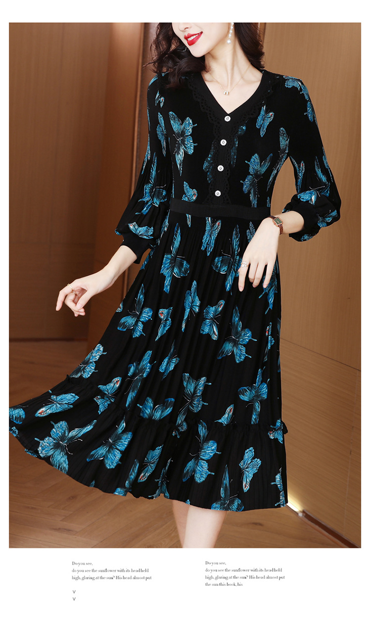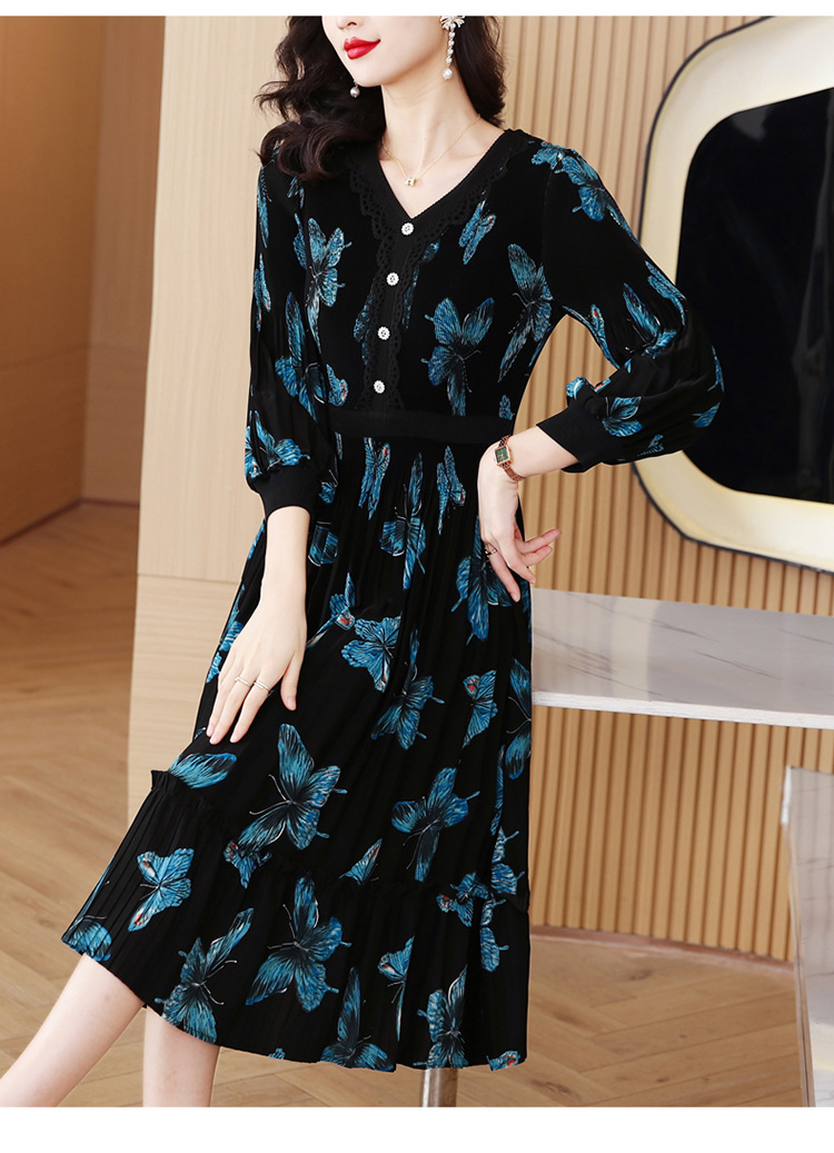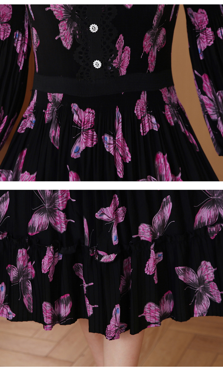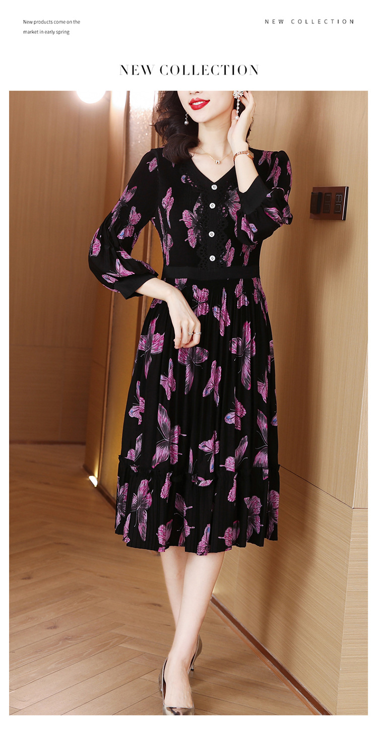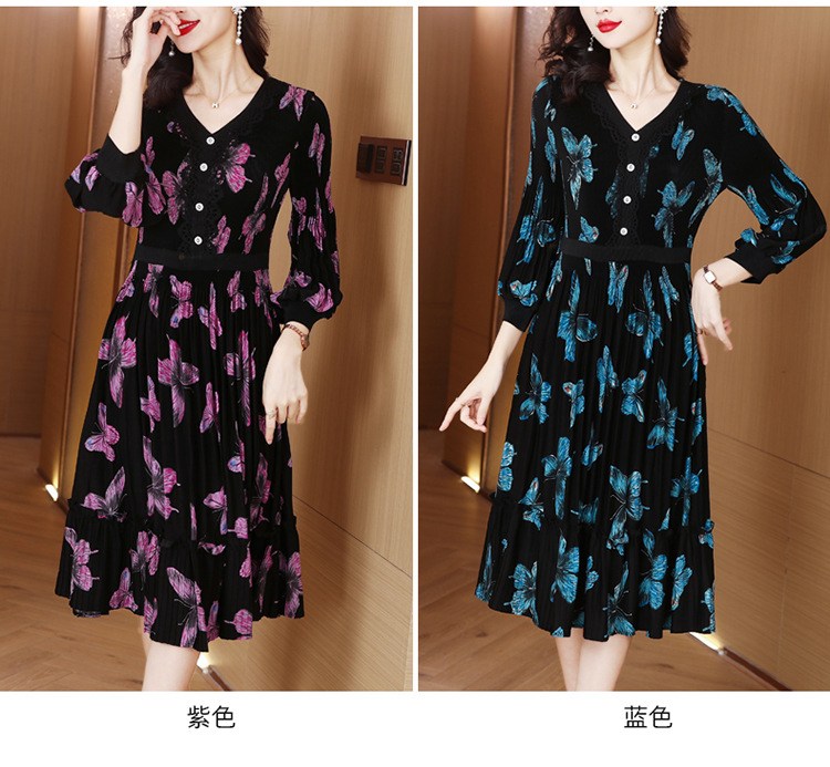 法式复古,秋季新款修身气质显瘦女神范V领百褶裙印花连衣裙AHM-msfs9057