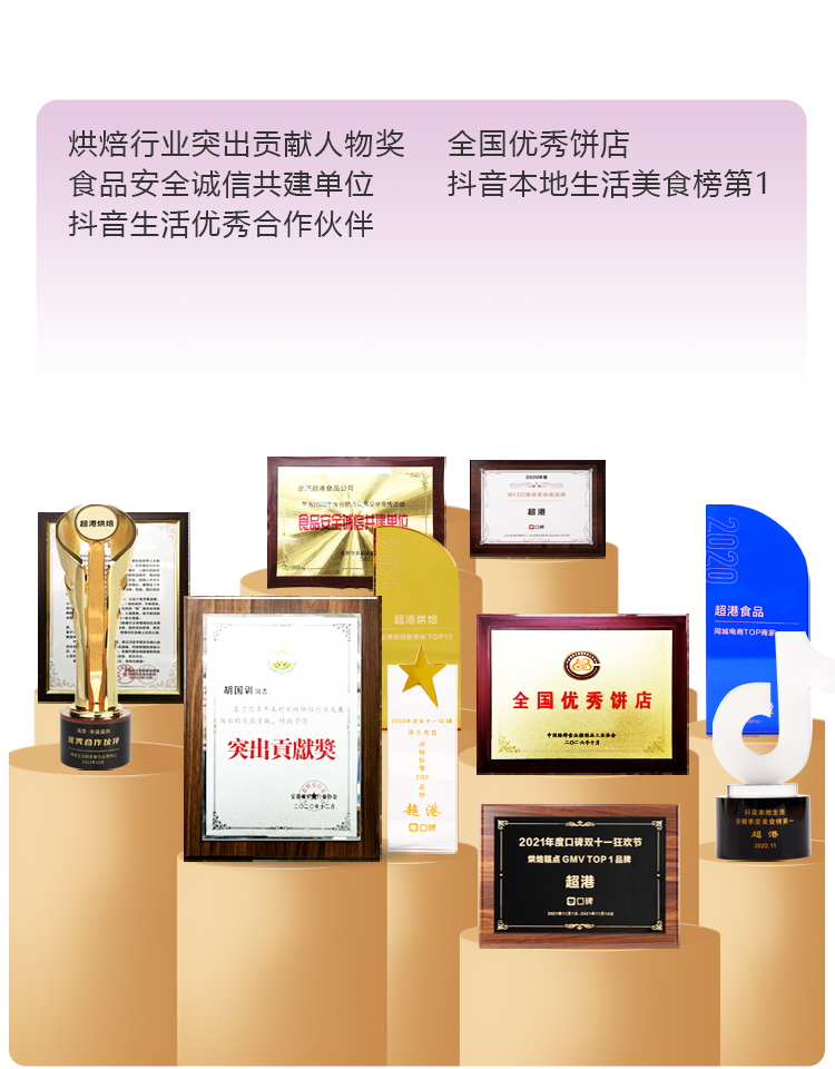 超港创立于1992年,是一家集生产销售面包、蛋糕、传统糕点、中西点于一体的全国性连锁烘焙企业,拥有百余家直营门店。超港以“玩味烘焙、文创美学”为经营理念。