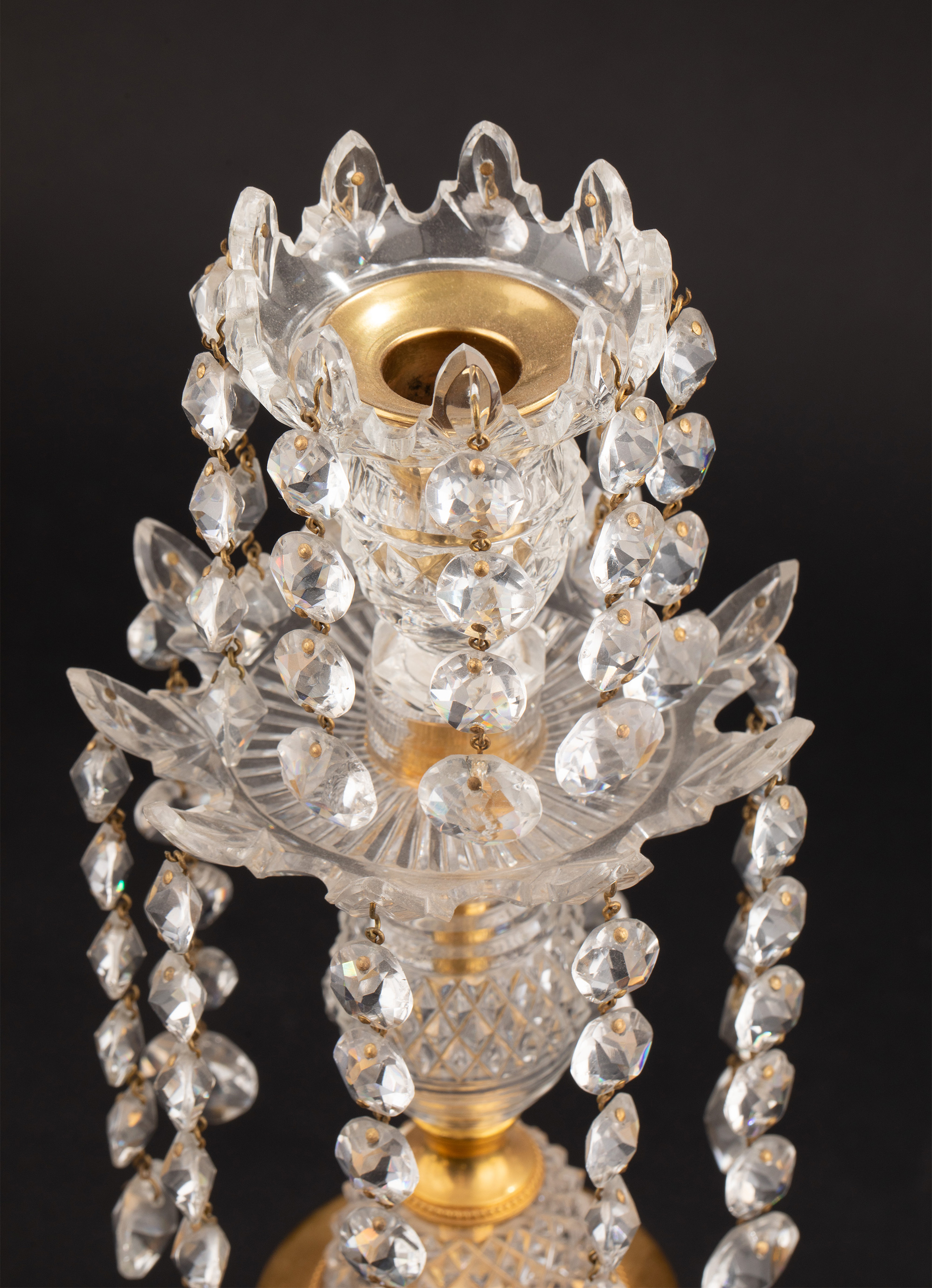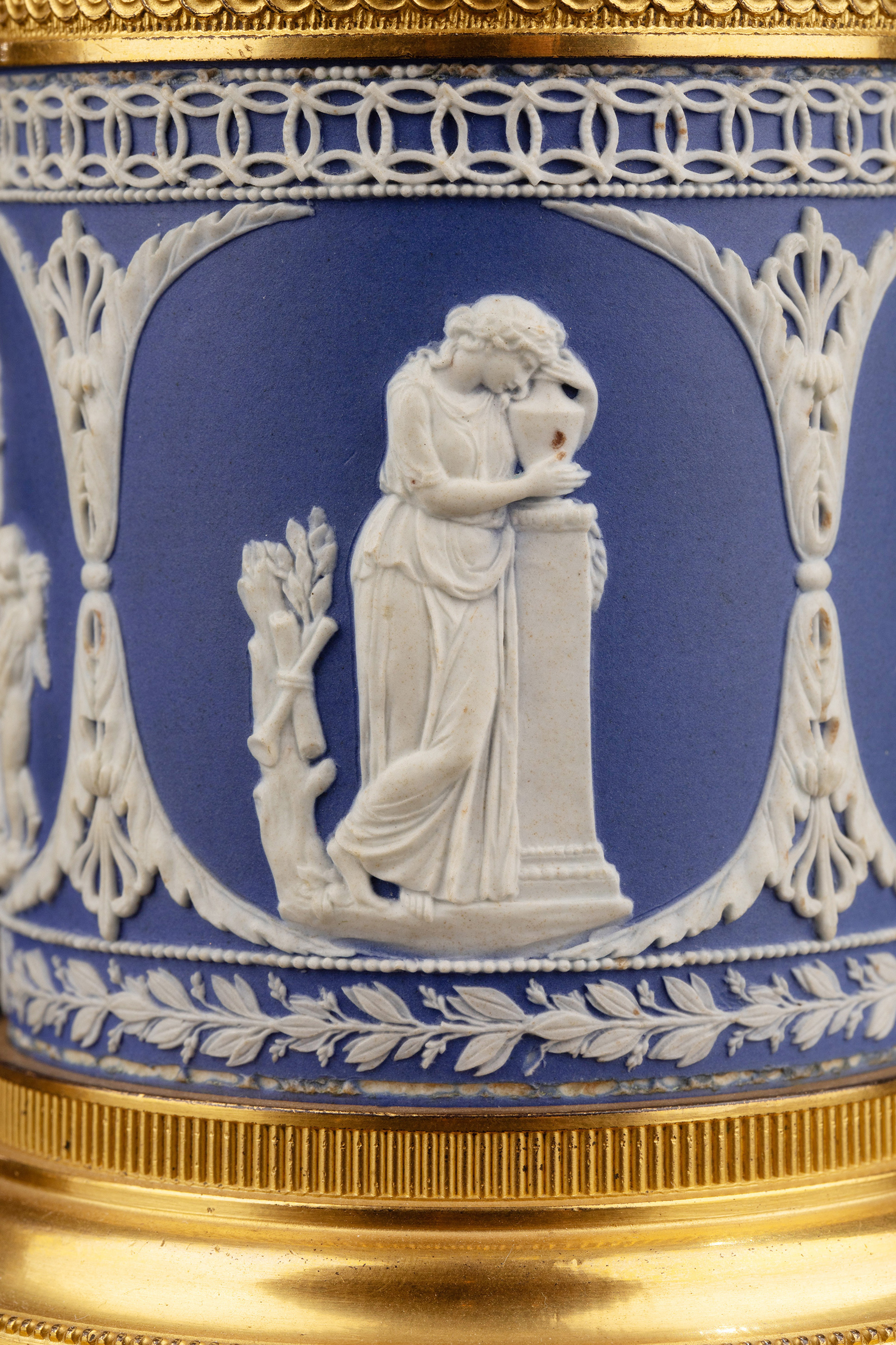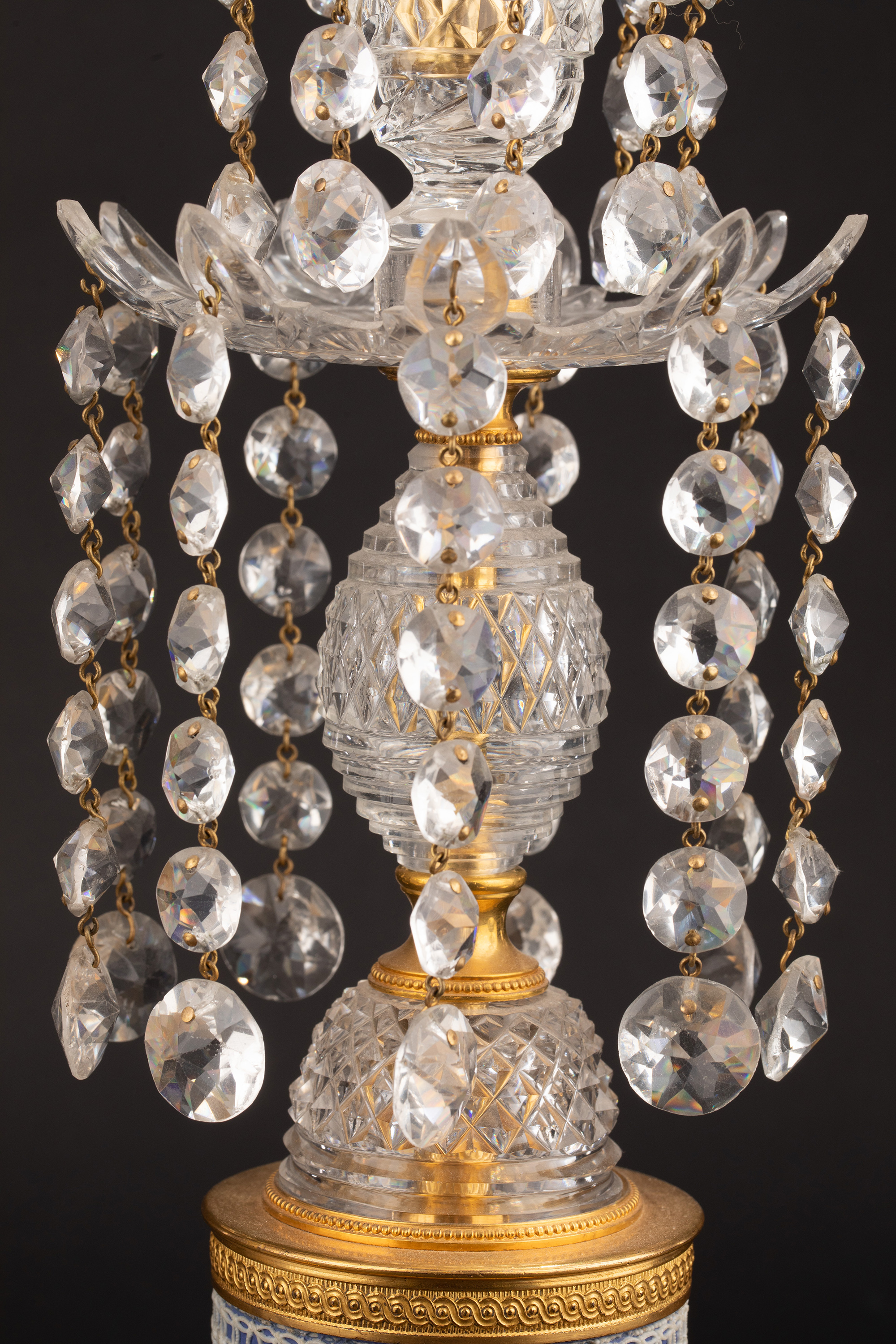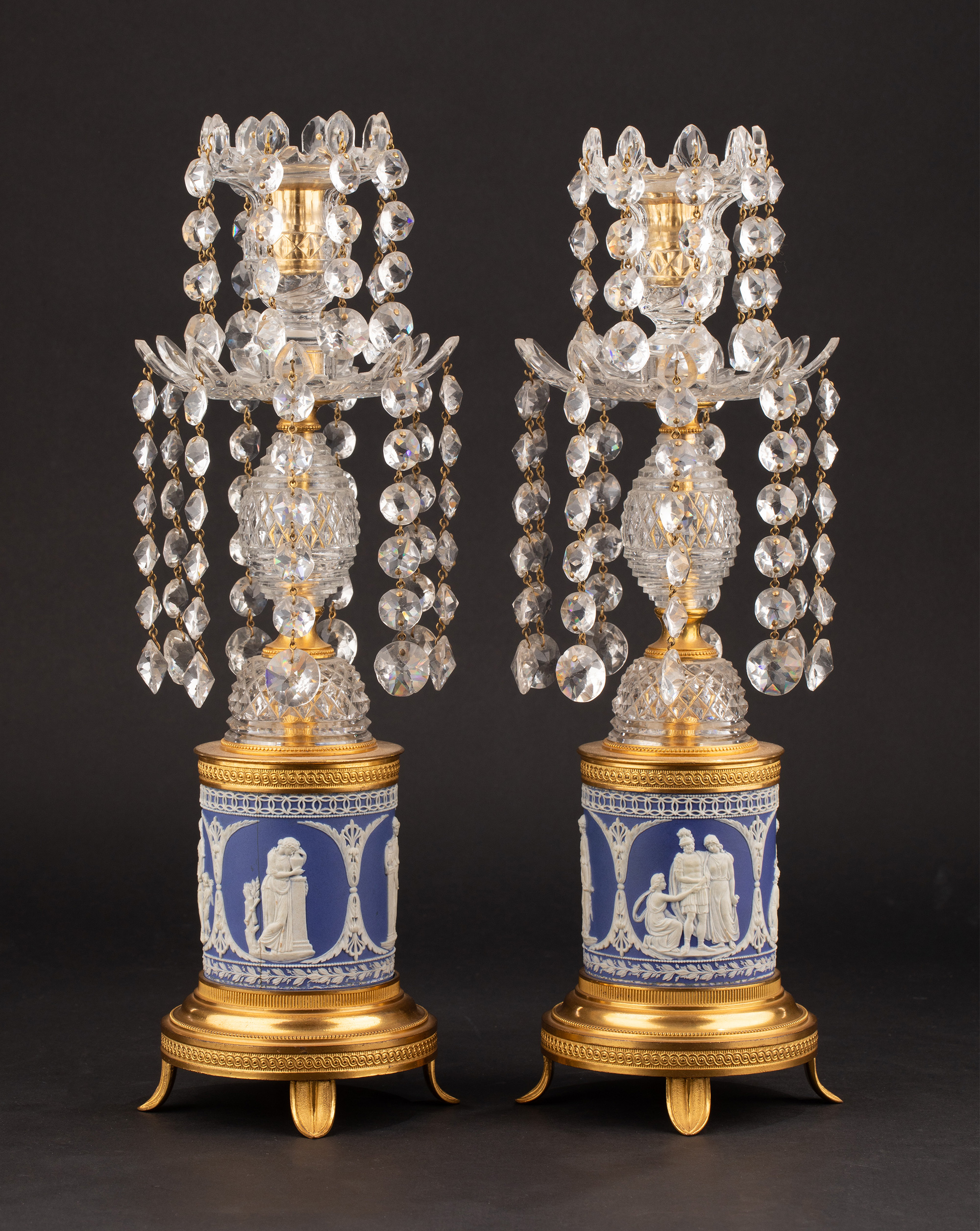 19世纪英国Wedgwood工坊出品铜鎏金精雕水晶垂饰蓝色浮雕陶瓷烛台一对