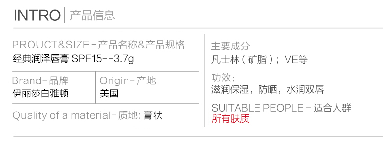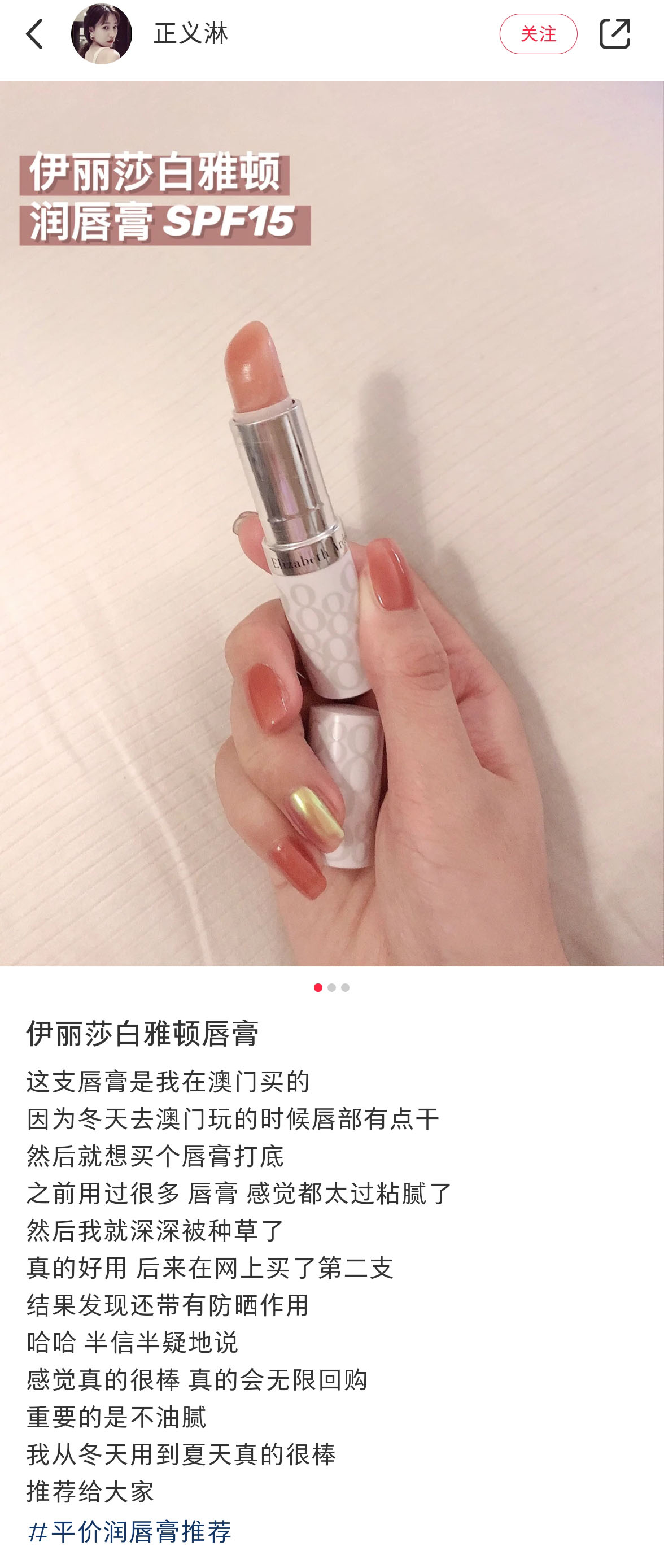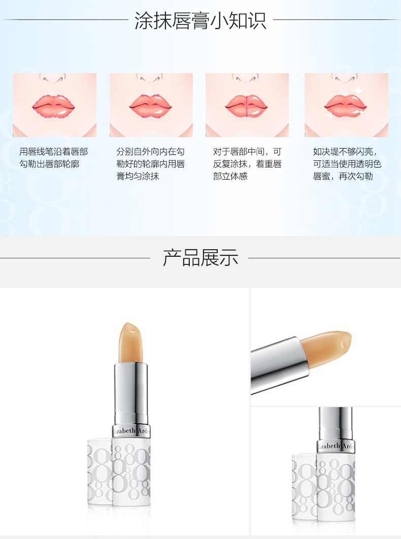 并且蕞重要的一点是它具有SPF15防晒指数,满足唇部脆弱肌肤防晒需求,抵御紫外线对唇部脆弱肌的伤害,有效在唇部形成一层保护膜,减少唇部肌肤所受刺激,再次强调唇部防晒真的很重要。
