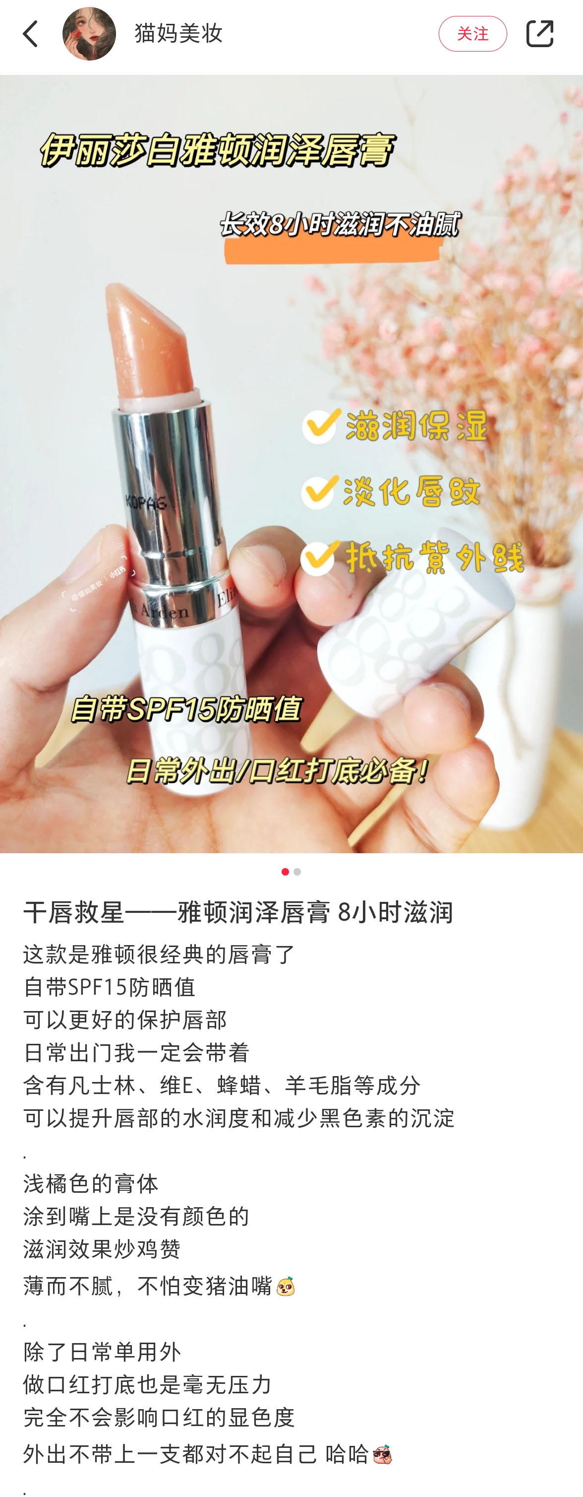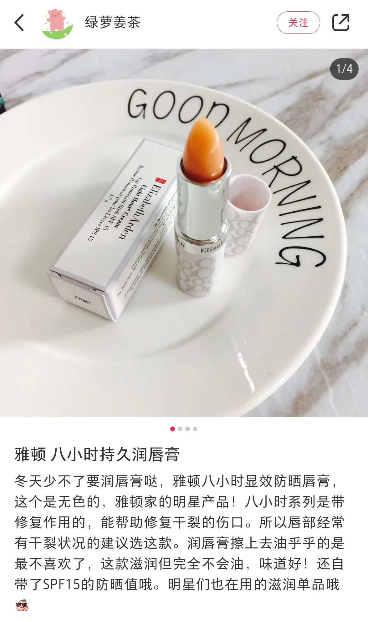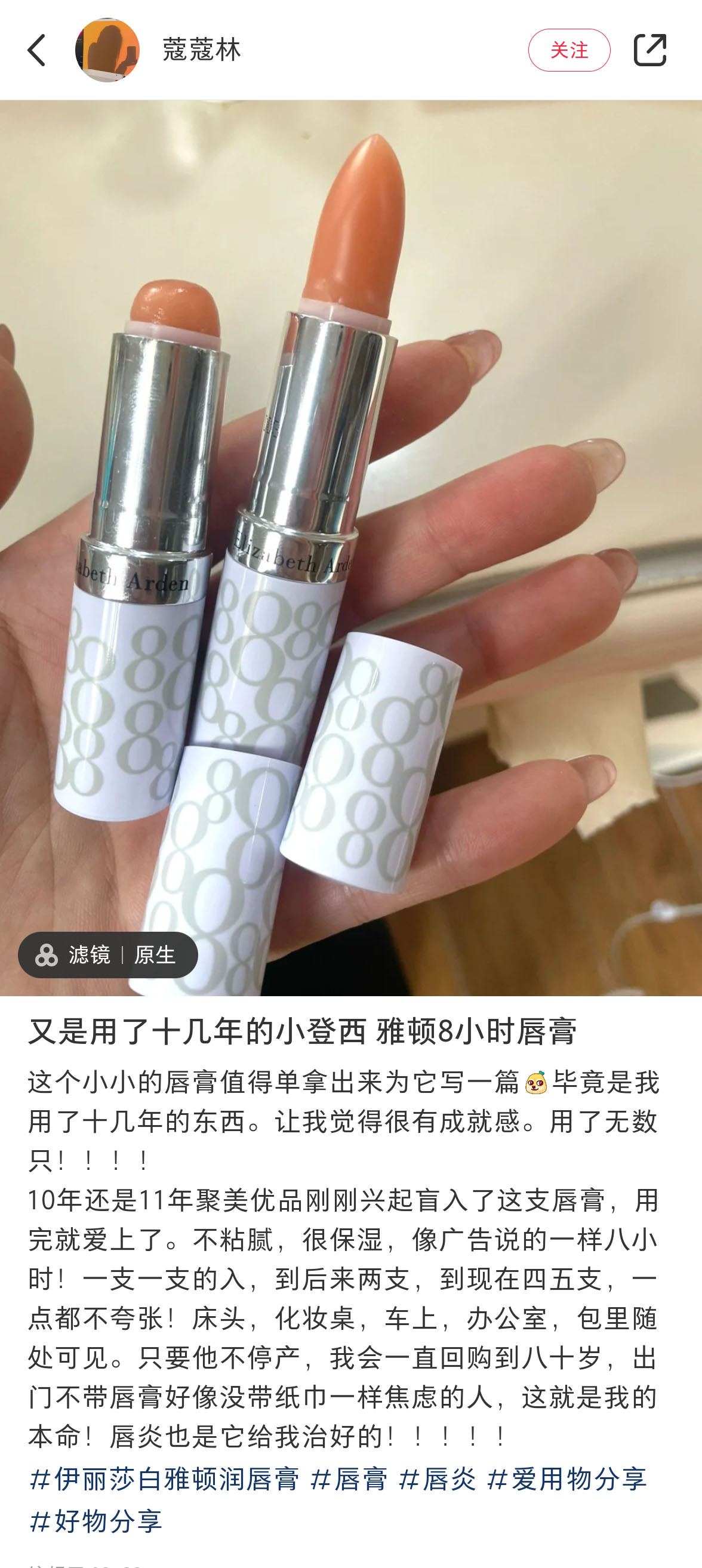 雅顿8小时润泽唇膏,“润”就一个字!轻薄滋润就是它的代名词,上唇仿若无物,涂后嘴唇柔柔嫩嫩,舒适感非常棒!不会泛油光,还带防晒值防护,能迅速舒缓干燥带来的唇部不适,深入底层修护,加速愈合干裂的唇纹,长达8小时持续润泽,唇部干燥起皮、纹路严重的姑娘一定要get~