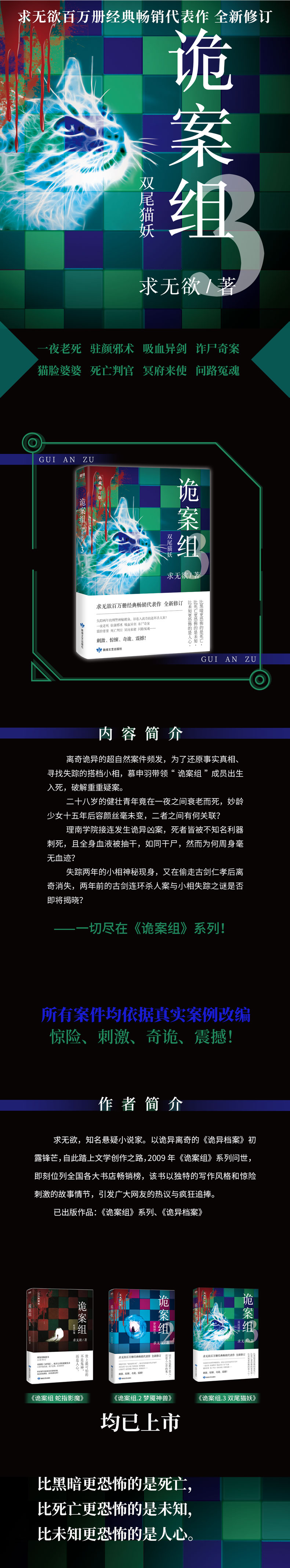 ★悬疑小说经典口碑之作,创作灵感均来源于真实事件,比虚构的故事更加惊险、刺激、奇诡、震撼! ★一夜老死、驻颜邪术、吸血异剑、诈尸奇案、猫脸婆婆、死亡判官、冥府来使、问路冤魂……悬疑推理+灵异奇诡,一宗宗“超自然”的案件背后,到底隐藏着怎样的真相?一系列看似无关的事件背后,又有什么惊天谜团? ★比黑暗更恐怖的是死亡,比死亡更恐怖的是未知,比未知更恐怖的是人心。