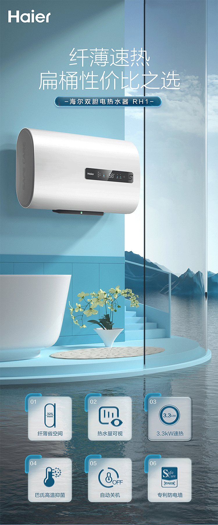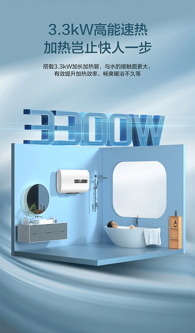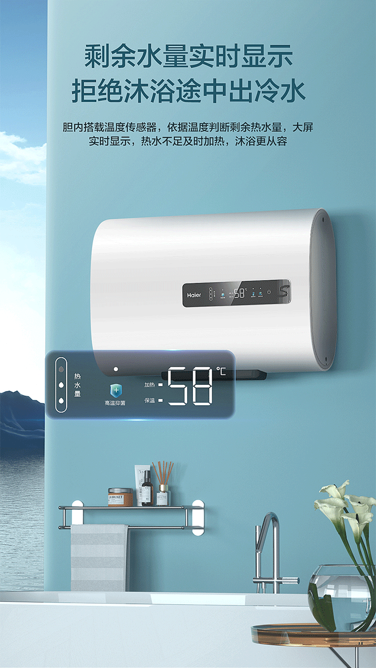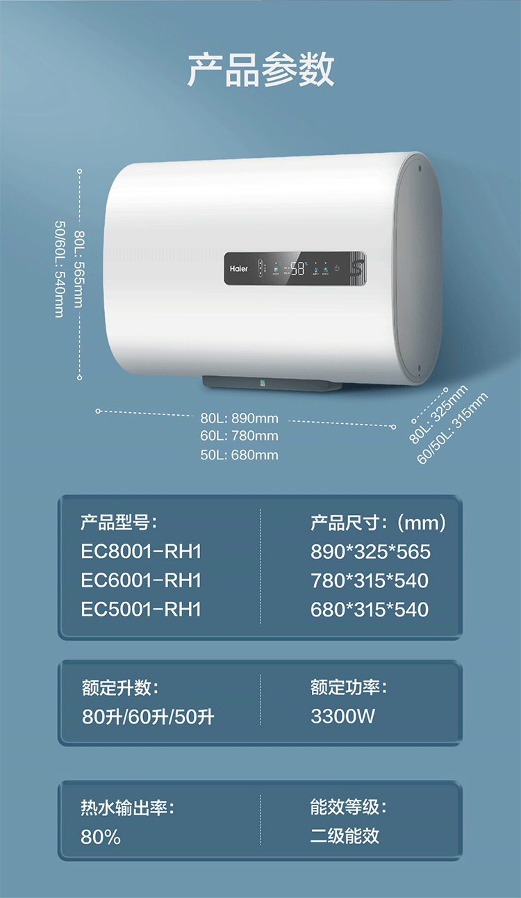 海尔(Haier)EC6001-RH1 扁桶型 60升家用电热水器 3300W大功能速热 二级能耗省电