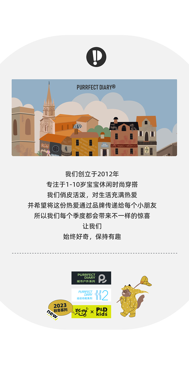 Purrfect-Diary专注于贴近自然随性的穿着概念,轻奢平价的童装文化传播,在产品设计上更加注重婴童穿着的舒适性、安全性、更出众的国际化品牌,将欧美的育婴文化在中国进行深入的传播与推广。