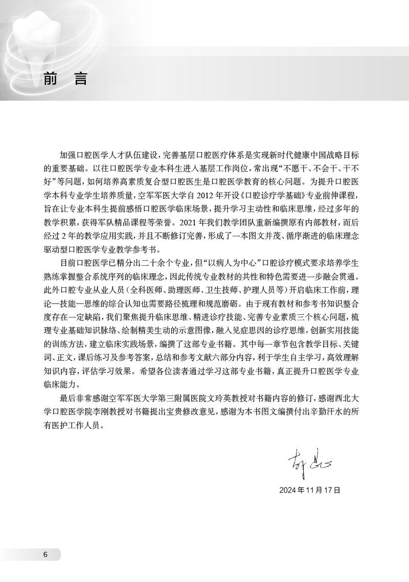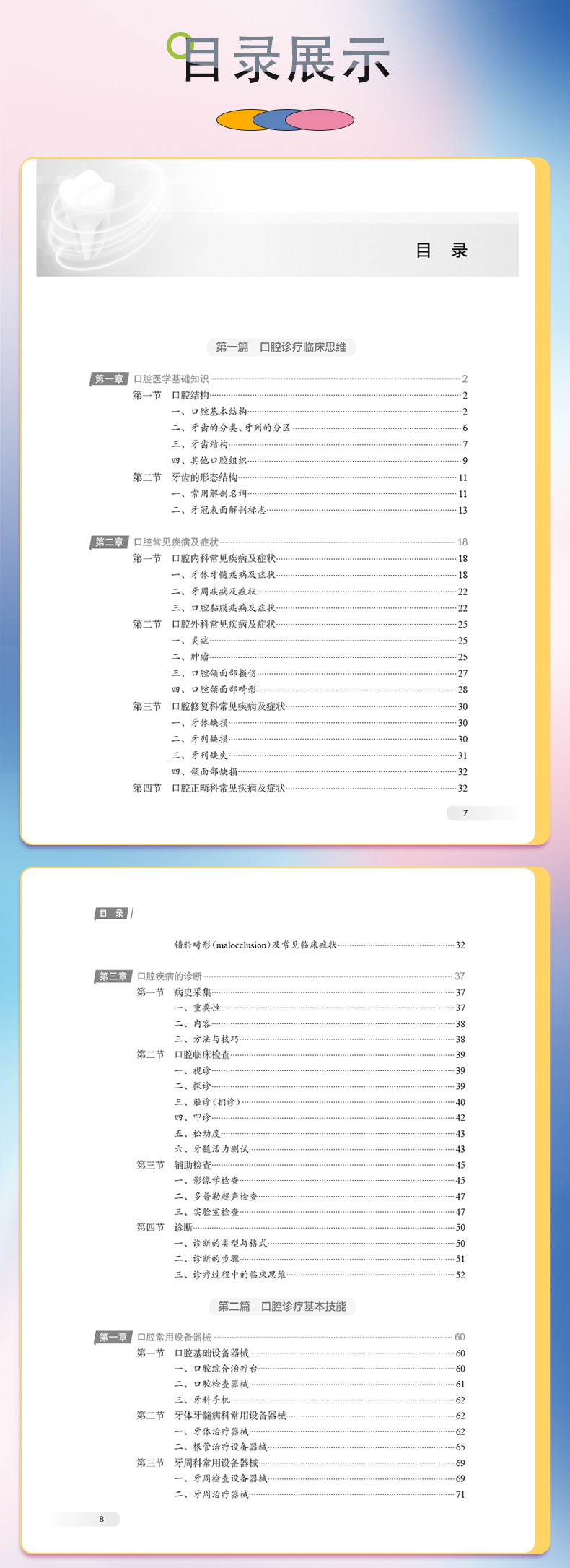 全书分为口腔诊疗临床思维,口腔诊疗基本技能和口腔诊疗专业素质三大篇。内容包括口腔医学基础知识,口腔常见疾病和症状,口腔常用设备器械认识,口腔临床诊疗的规范化操作,精细化操作训练,口腔诊疗中的人文关怀,感染控制,口腔健康教育和专科基本技能。本教材在每章教学内容始端明确教学目标和关键词,在每章末端提供学习重点难点思维导图引导学生高校学习,并给出重点内容测试题及答案以利于评估学习效果,同时提供参考文献。