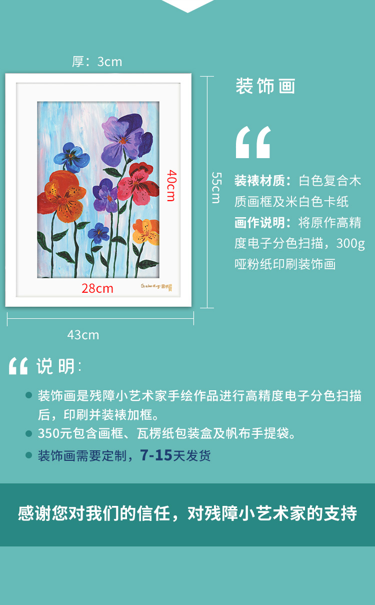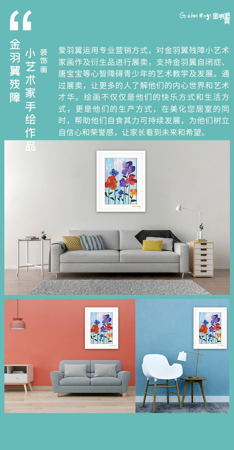 - 金羽翼将艺术与心理治疗相结合,用艺术教育的形式帮助残障青少年体现自身价值、提高生活质量、实现艺术梦想,并将绘画作品开发成衍生品销售,收入扣除成本后,20%返还给学员家庭,80%用于金羽翼艺术康复教学。