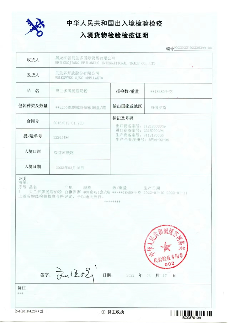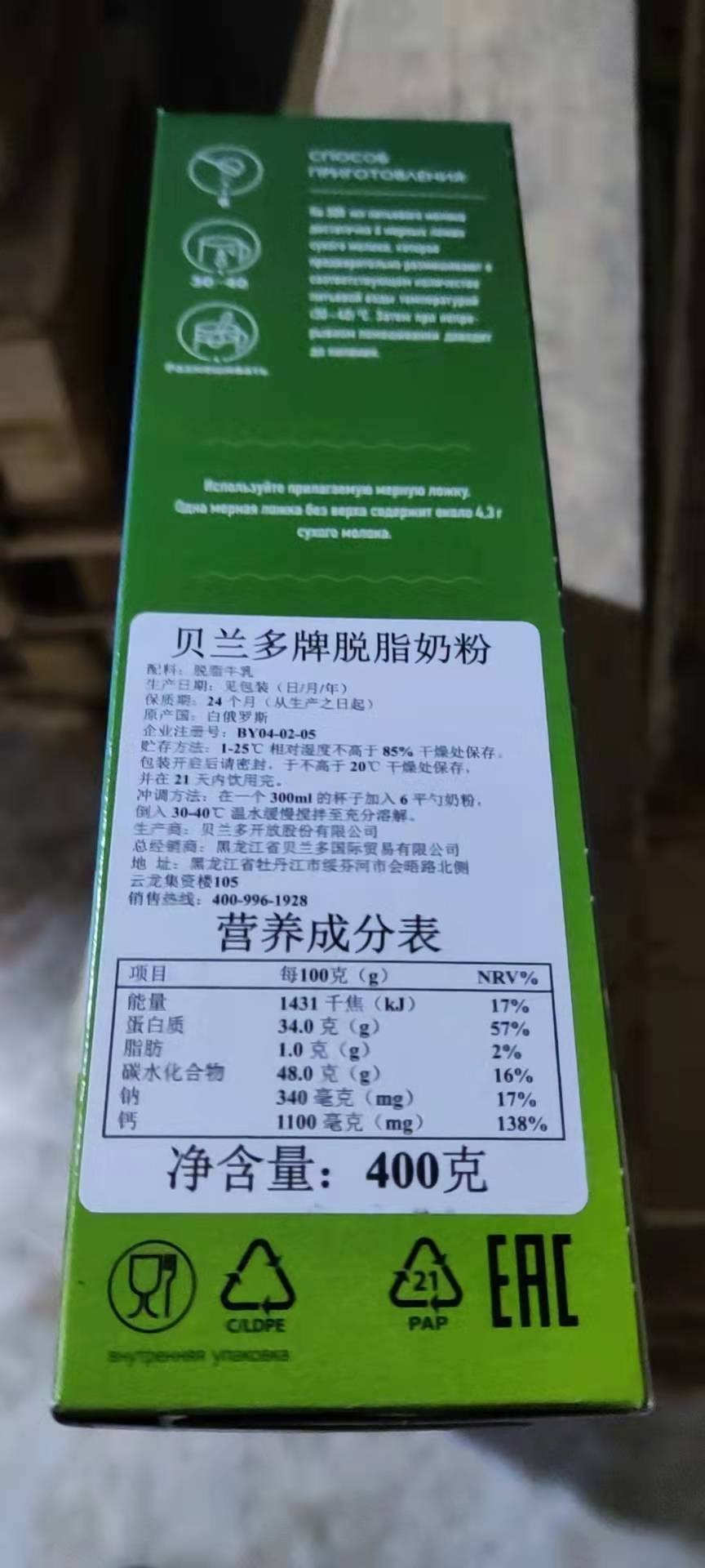 【中欧班列精选】俄罗斯贝兰多牌脱脂奶粉乳粉400克/袋