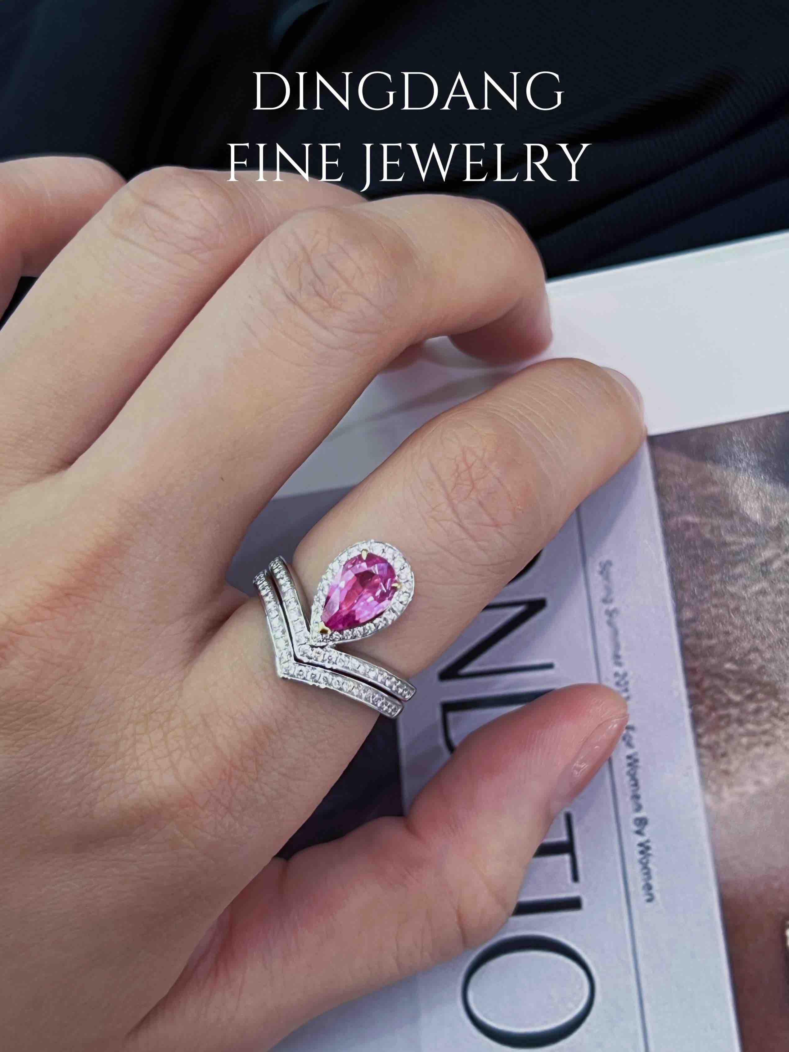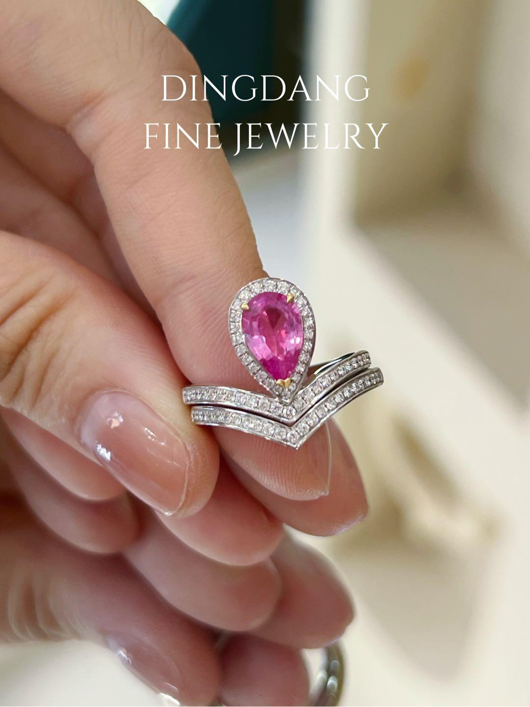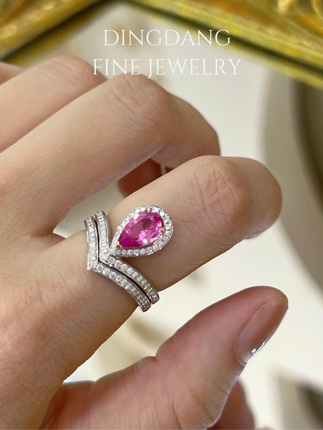 1.18ct水滴粉蓝宝,斯里兰卡,无烧粉紫色,玻璃体精切,颜色饱满,d0. 32ct 很浪漫的颜色,叠带设计配合尚美造型,女王范十足
