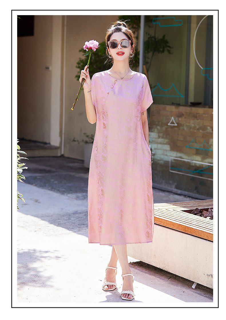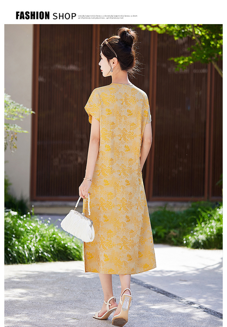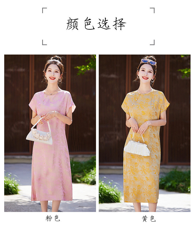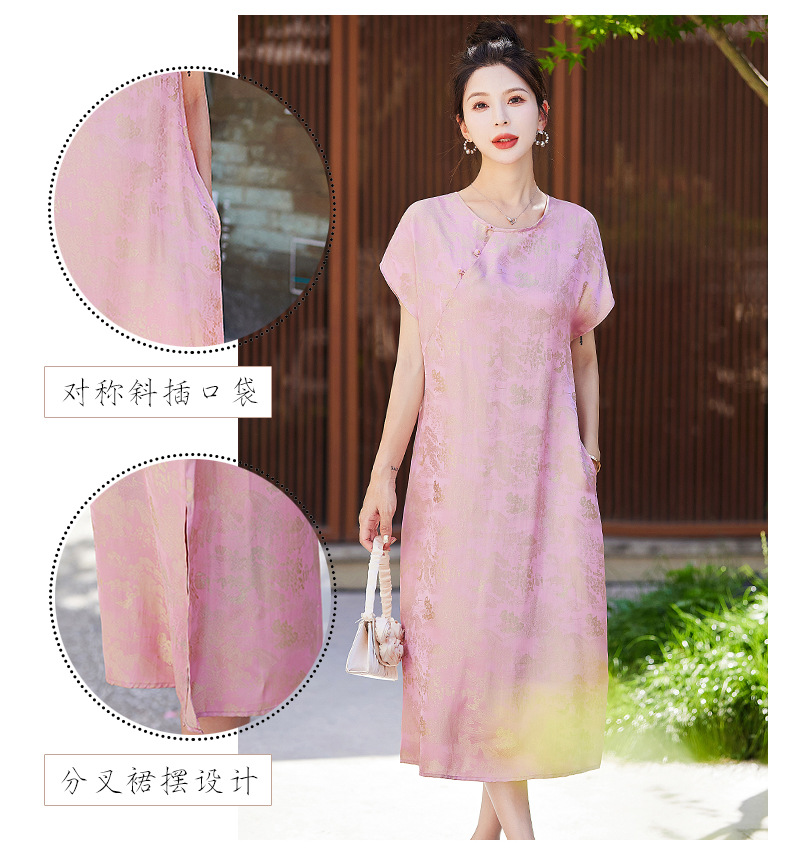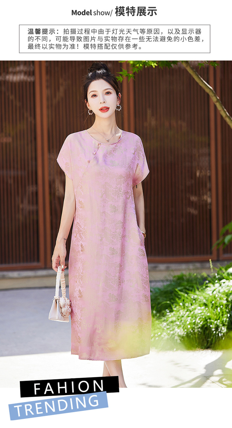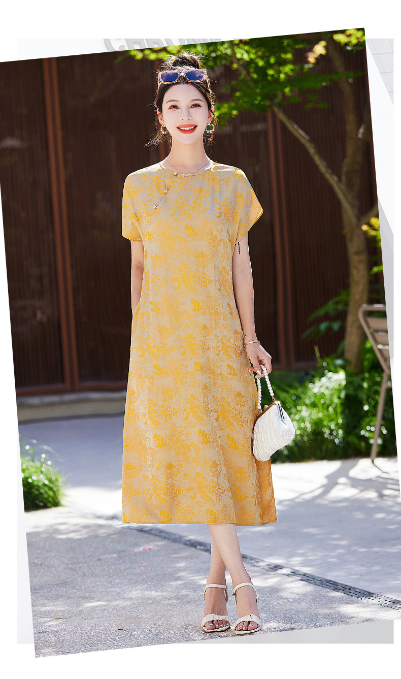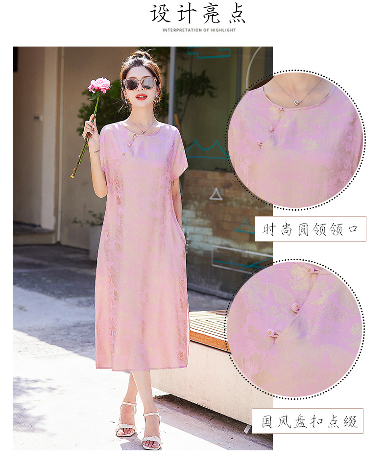 短袖新中式2024年夏季织锦缎提花圆领真口袋中长款连衣裙XYSP6016