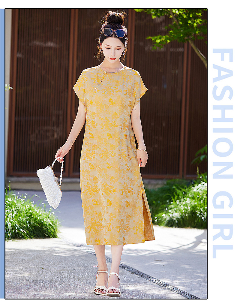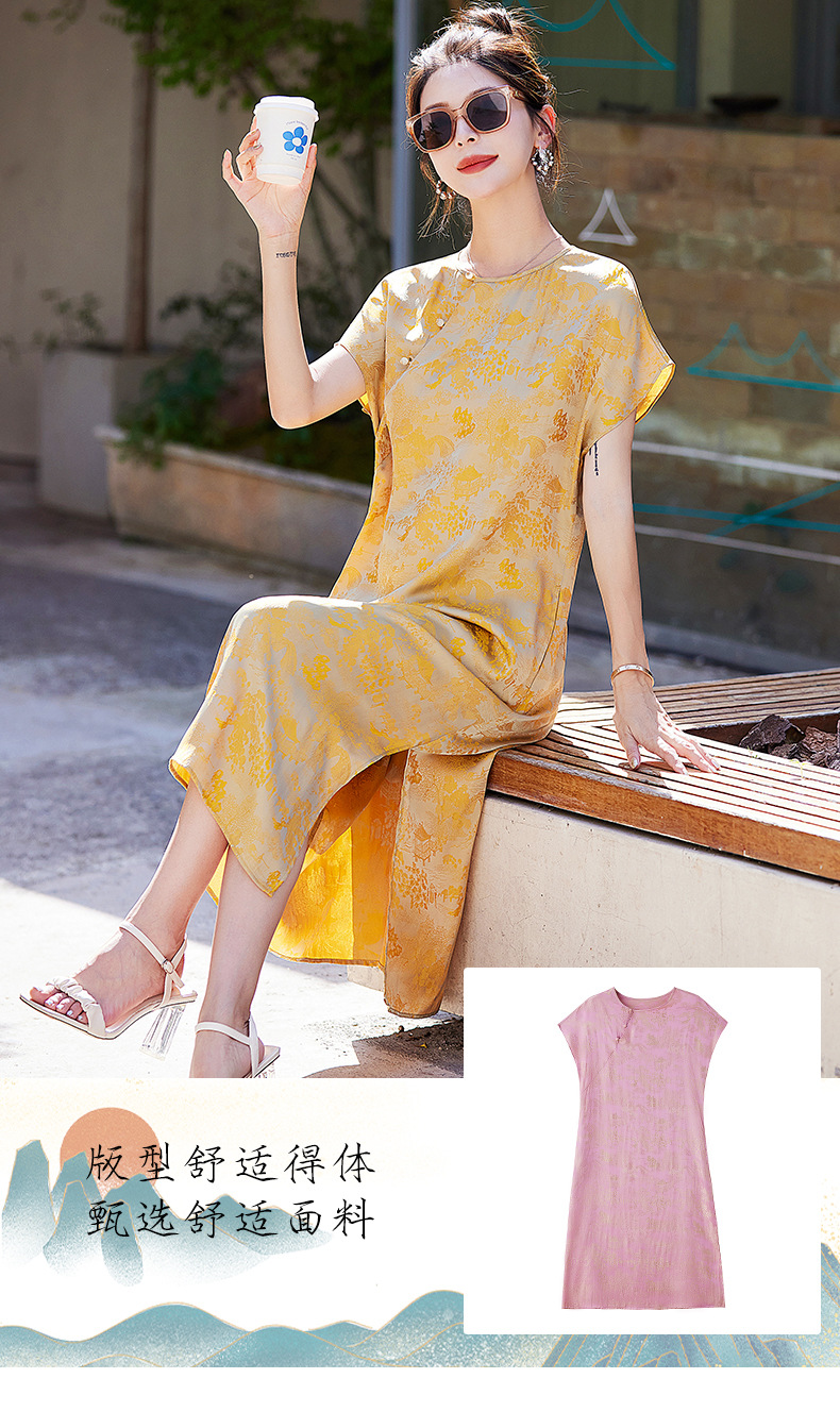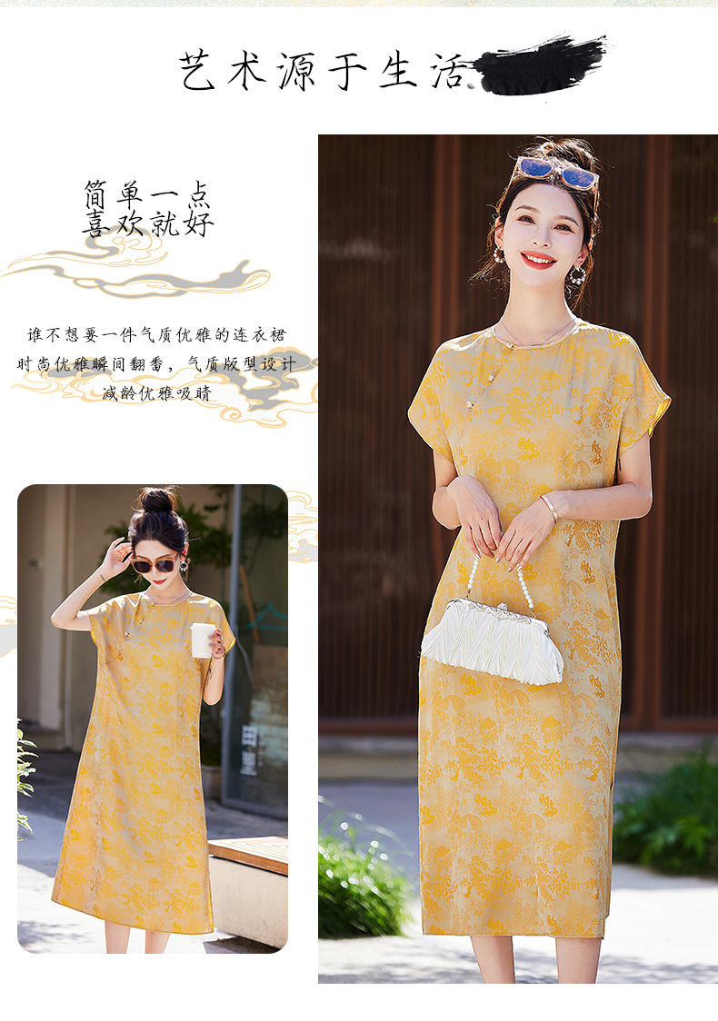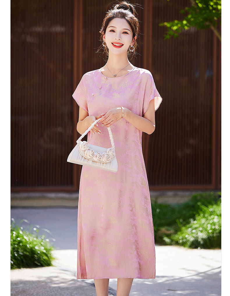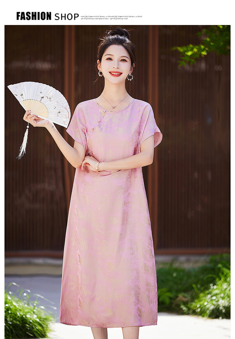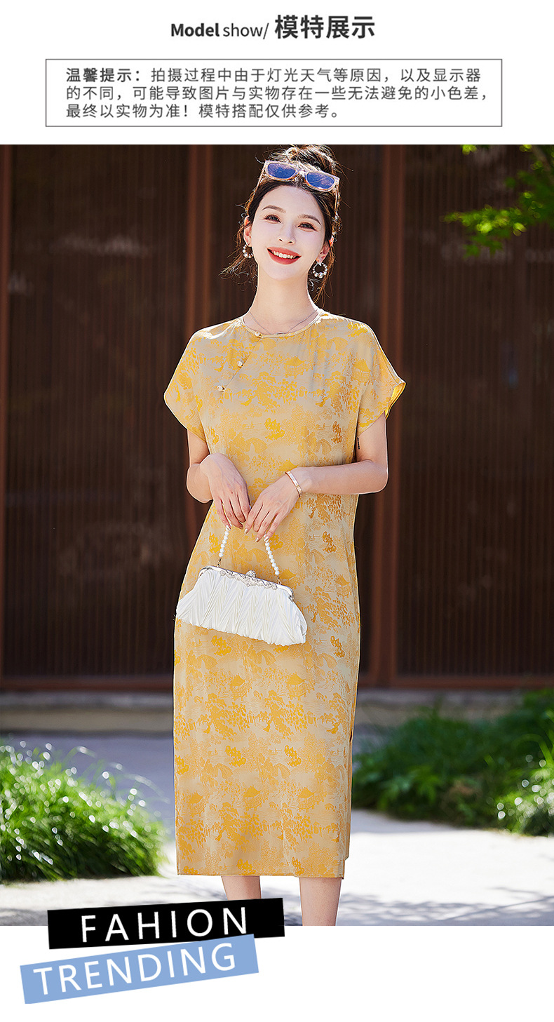 短袖新中式2024年夏季织锦缎提花圆领真口袋中长款连衣裙XYSP6016