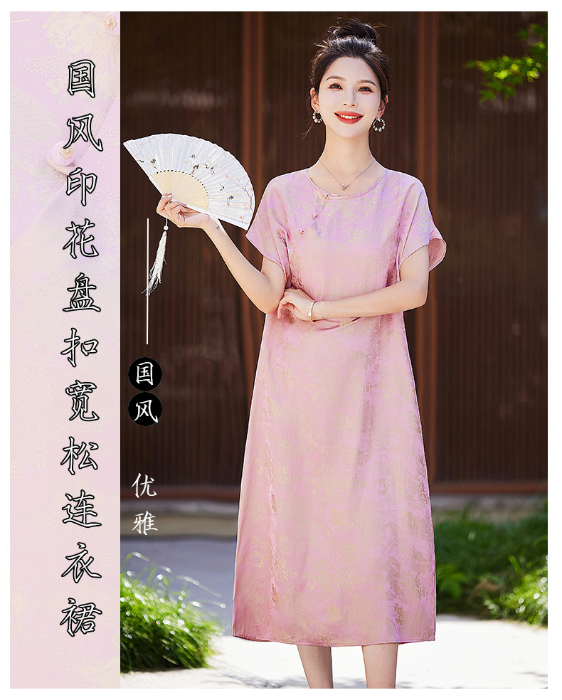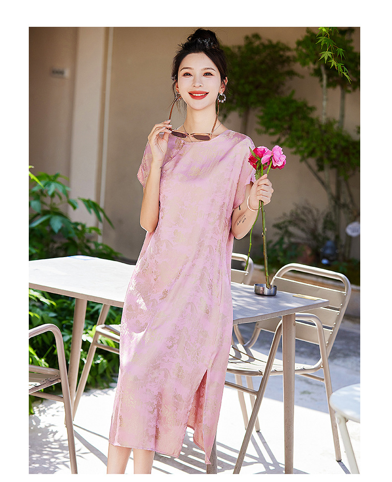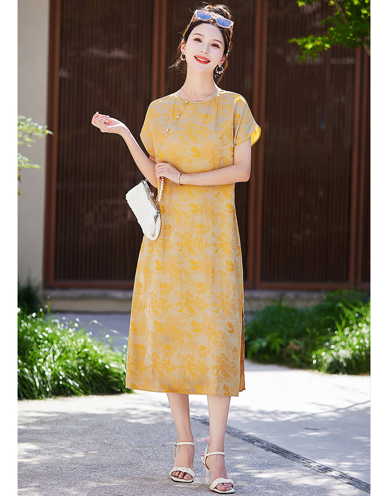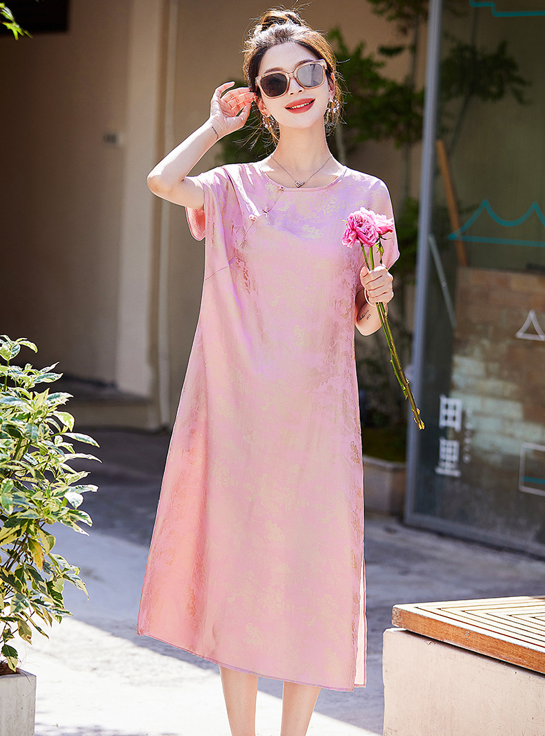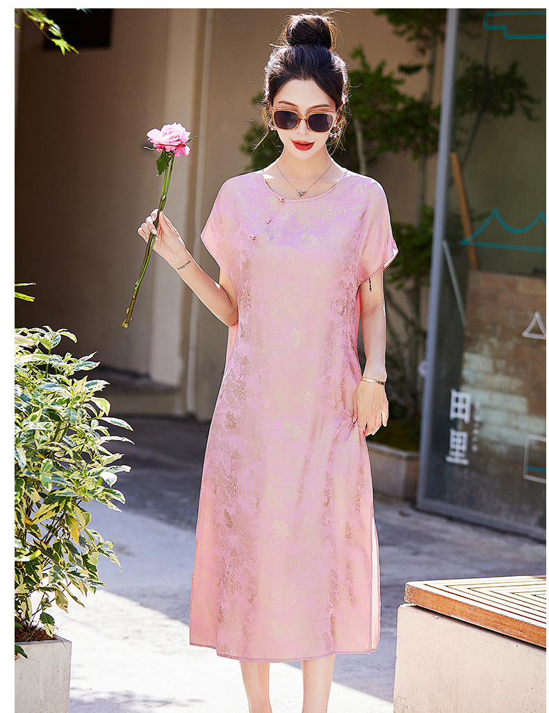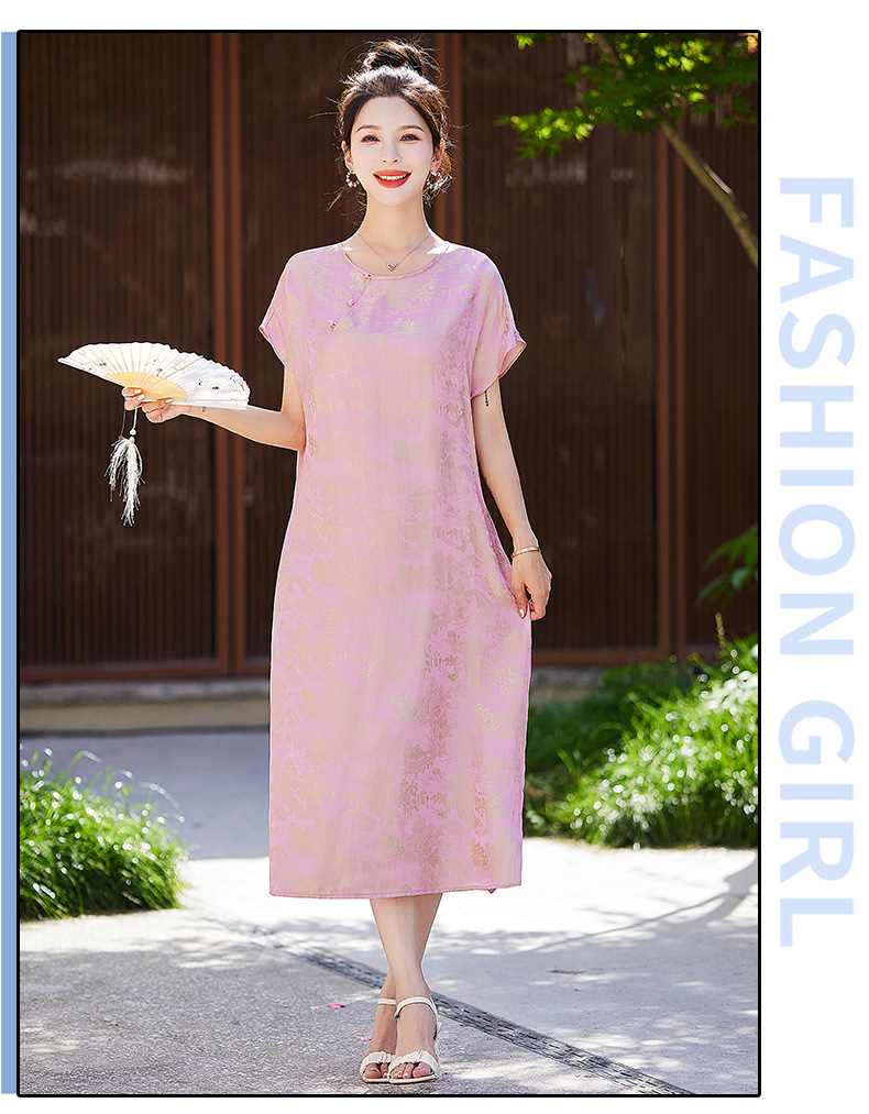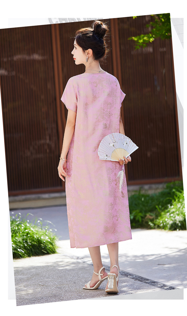短袖新中式2024年夏季织锦缎提花圆领真口袋中长款连衣裙XYSP6016