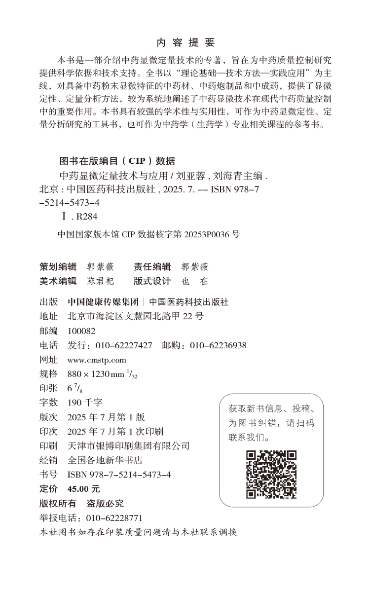 中药显微定量技术与应用 刘亚蓉 刘海青 主编 可作为中药学(生药学)专业相关课程的参考书 9787521454734 中国医药科技出版社