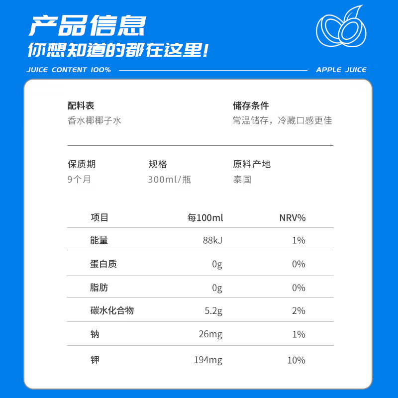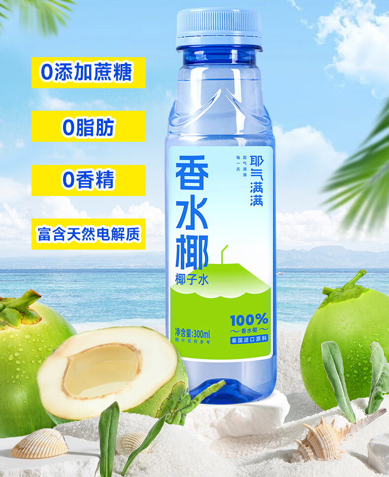 耶气满满 100%香水椰椰子水 300ml/瓶
