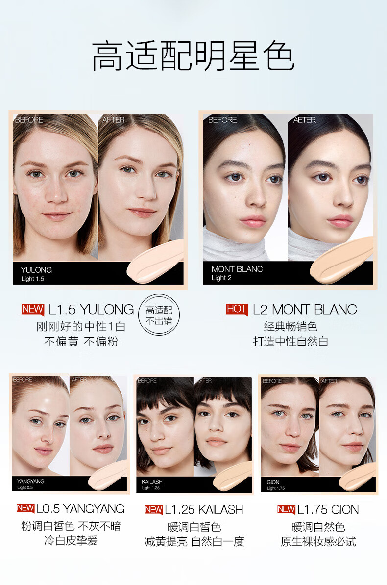 L3(黄调1.5白):适合橄榄、冷黄偏白肤色