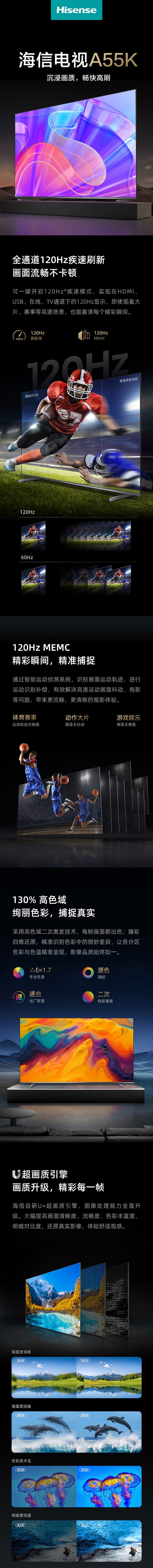 海信(912681)(Hisense)电视 A55K系列 4K MEMC U+超画质引擎 DTS V-X音效 远场语音 64GB大存储 130%色域 平板电视 75英寸 75A55K