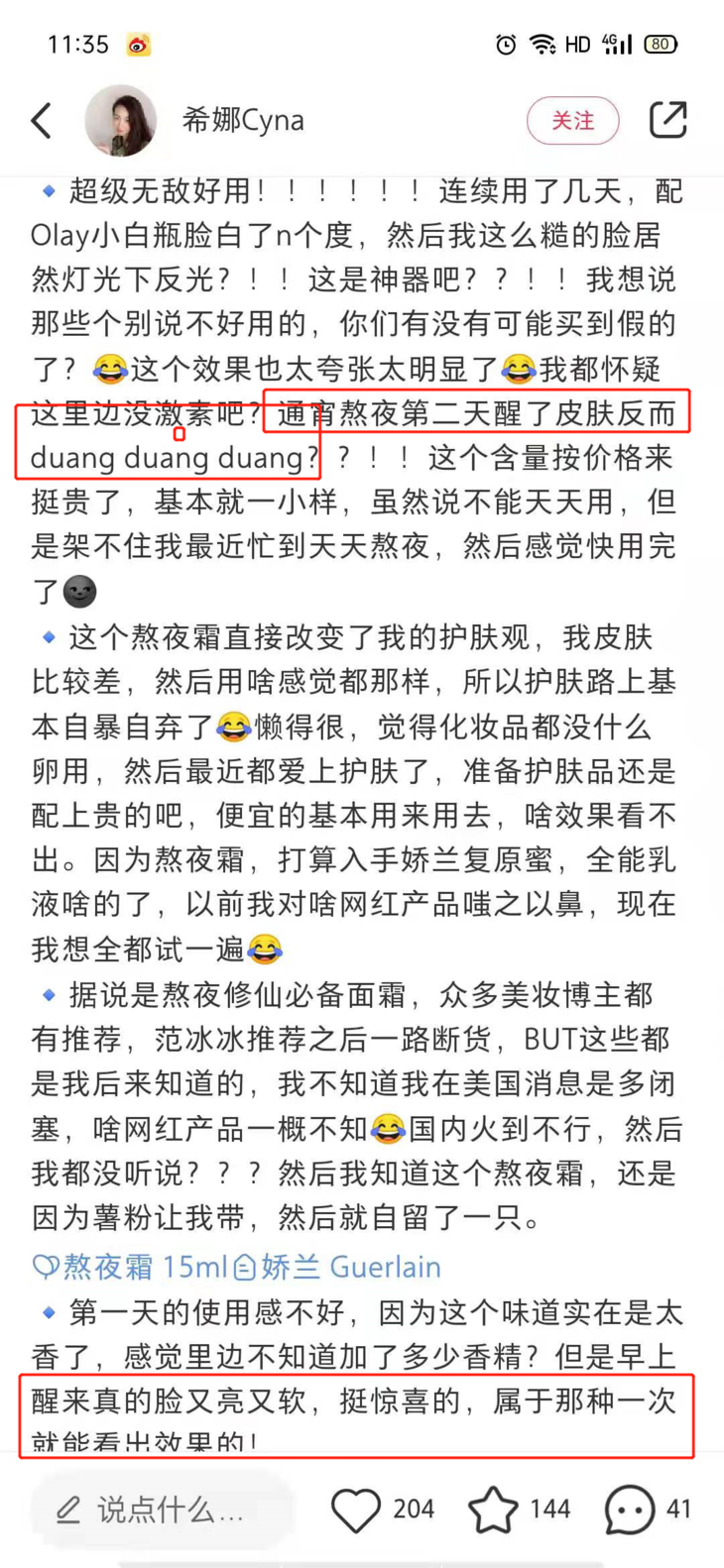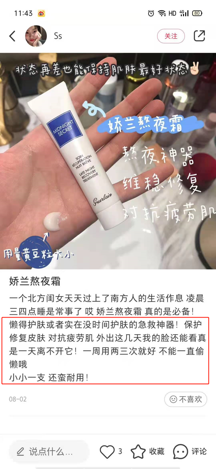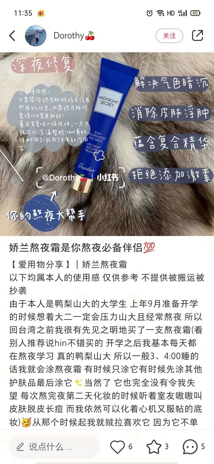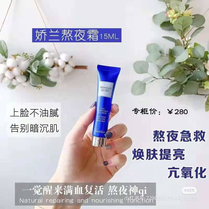熬夜一时爽,一直熬夜一只爽,平时无法避免的熬夜,或者出去玩了一天太累了不想护肤,娇兰熬夜霜真的,它的质地会偏乳液,不厚重,吸收挺快的,不油腻,不过效果也没有那么夸张,但最起码不会熬夜黄!去黄提亮效果超级好,第二天依旧白白嫩嫩,没有一点黄气!