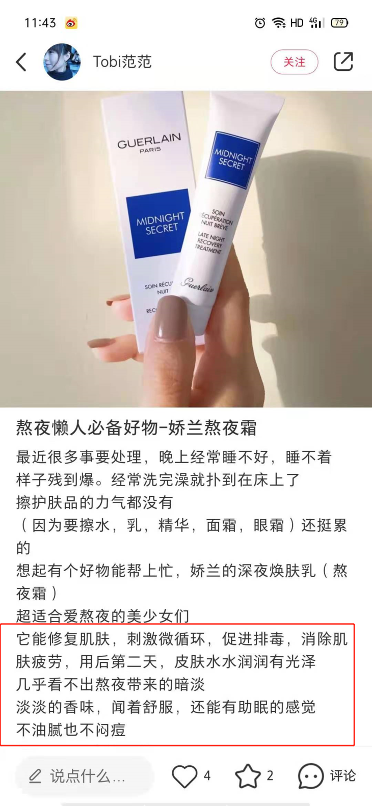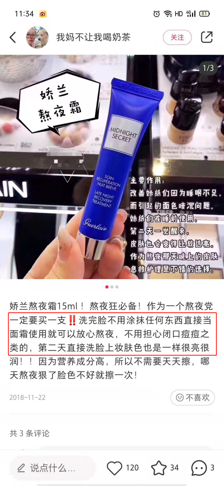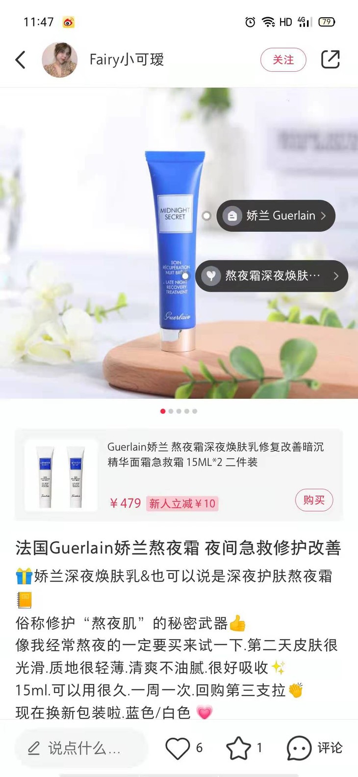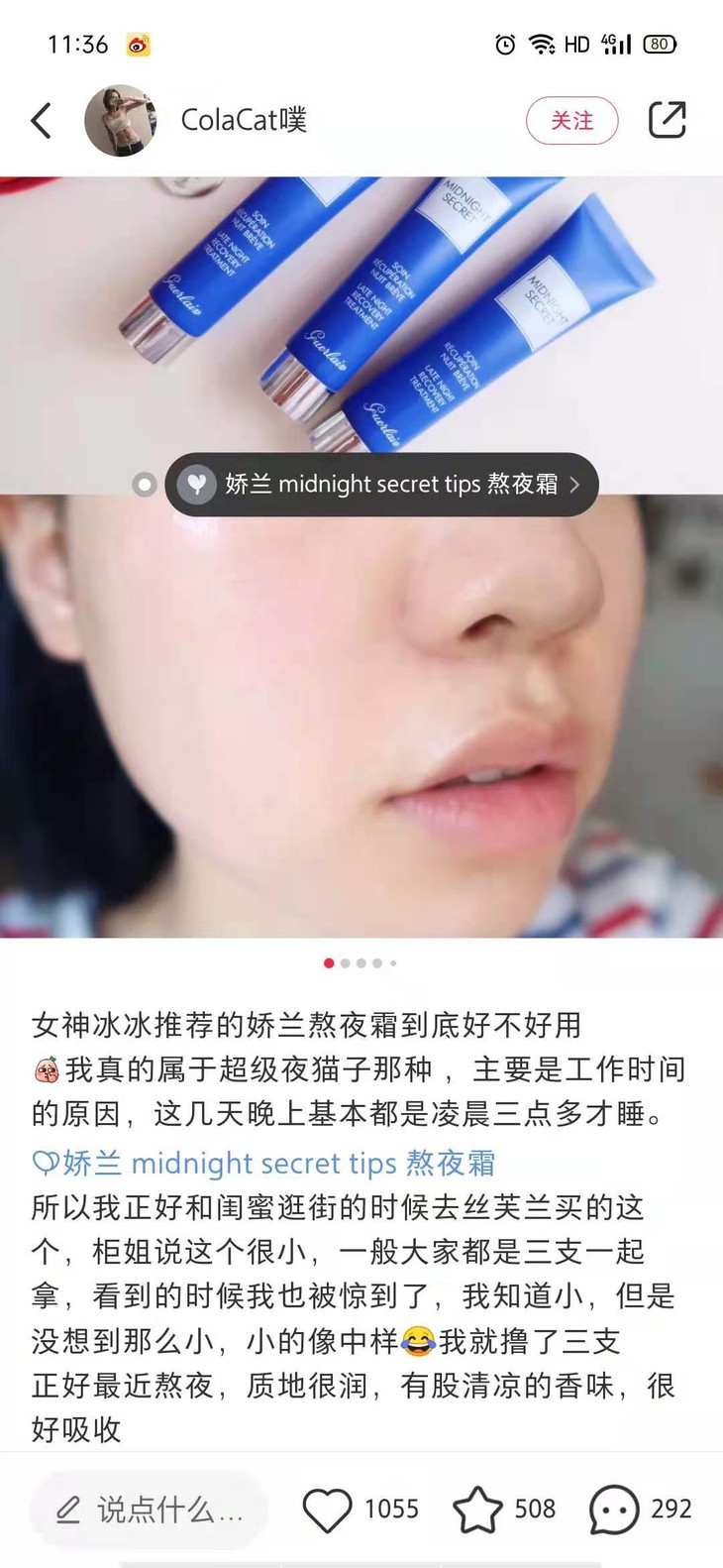 熬夜一时爽,一直熬夜一只爽,平时无法避免的熬夜,或者出去玩了一天太累了不想护肤,娇兰熬夜霜真的,它的质地会偏乳液,不厚重,吸收挺快的,不油腻,不过效果也没有那么夸张,但最起码不会熬夜黄!去黄提亮效果超级好,第二天依旧白白嫩嫩,没有一点黄气!