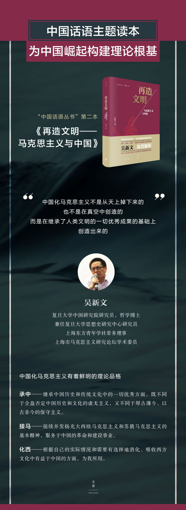 《再造文明——马克思主义与中国》的特点在于从马克思主义与中华文明不断融合、相互激发和提升的角度理解马克思主义中国化的历程,揭示马克思主义中国化的内在逻辑,理解中国特色社会主义道路的丰富性、复杂性与正当性。