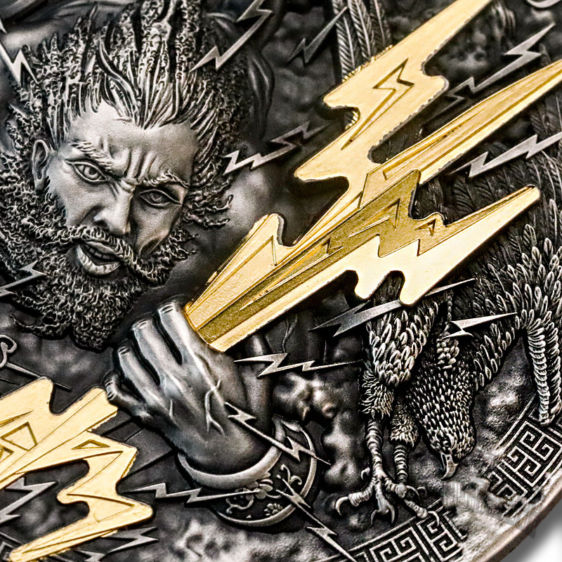 这枚币延续了系列的高浮雕,刻画细腻,立体感十足,宙斯手持闪电,这里还采用了局部镀金!