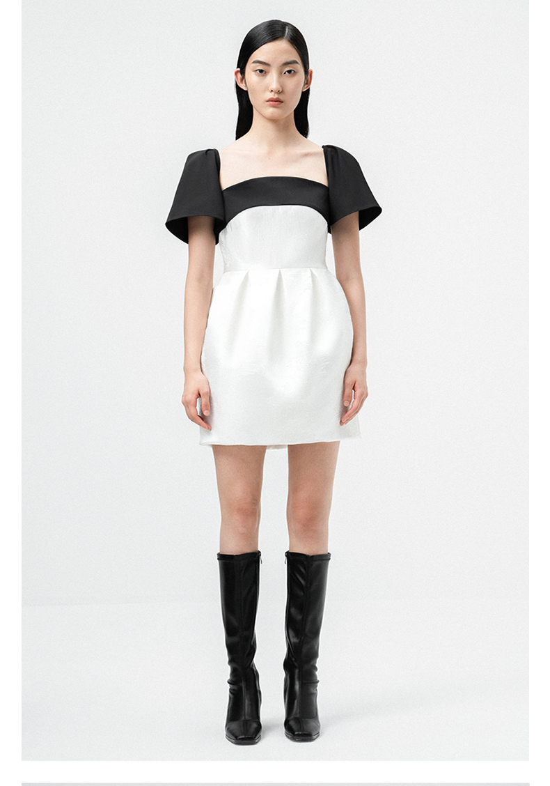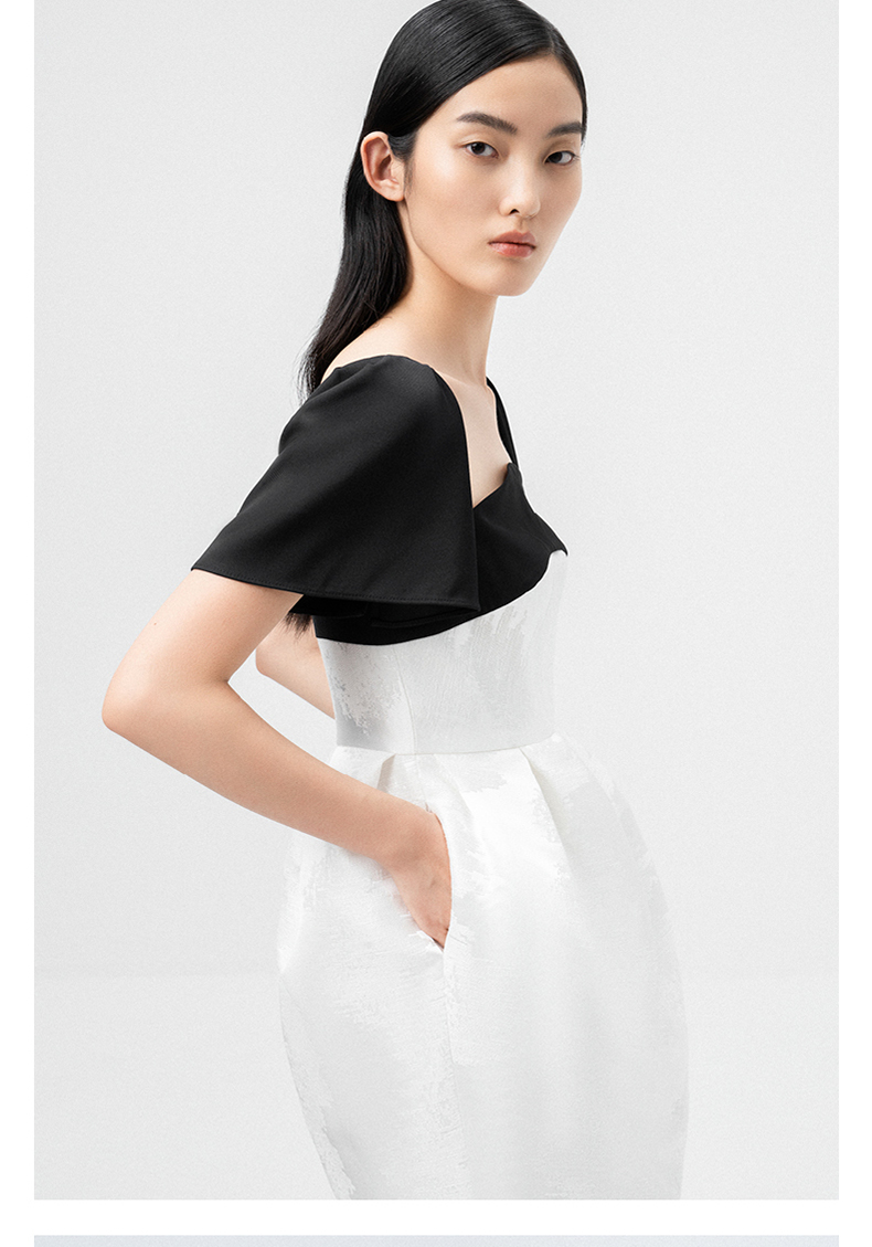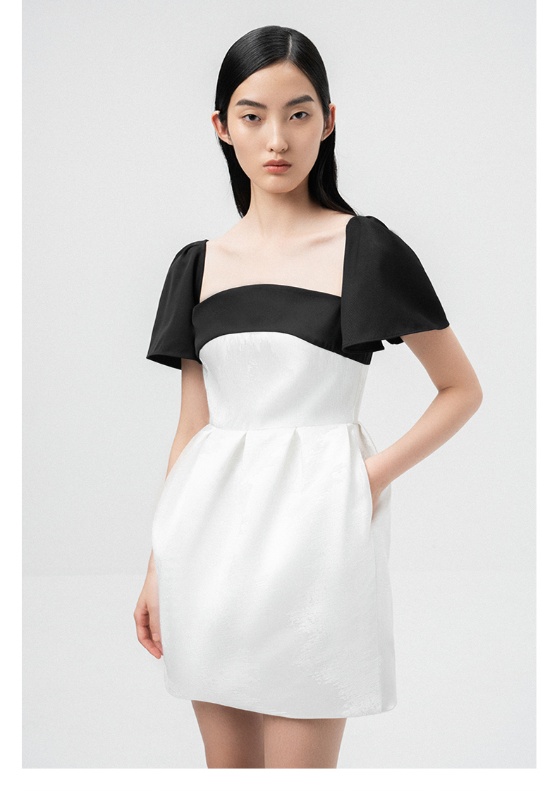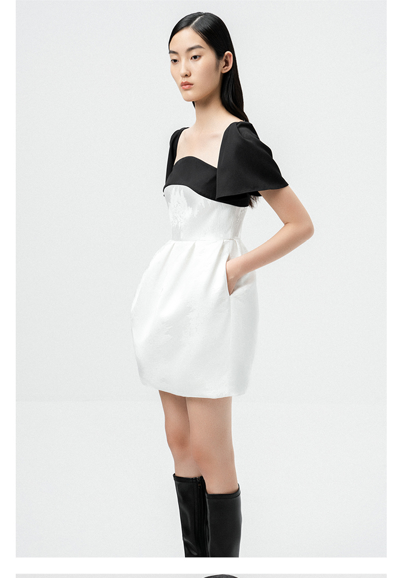【一件倾心】半圆领黑拼贝母白肌理面料飘袖花苞连衣裙/0000733