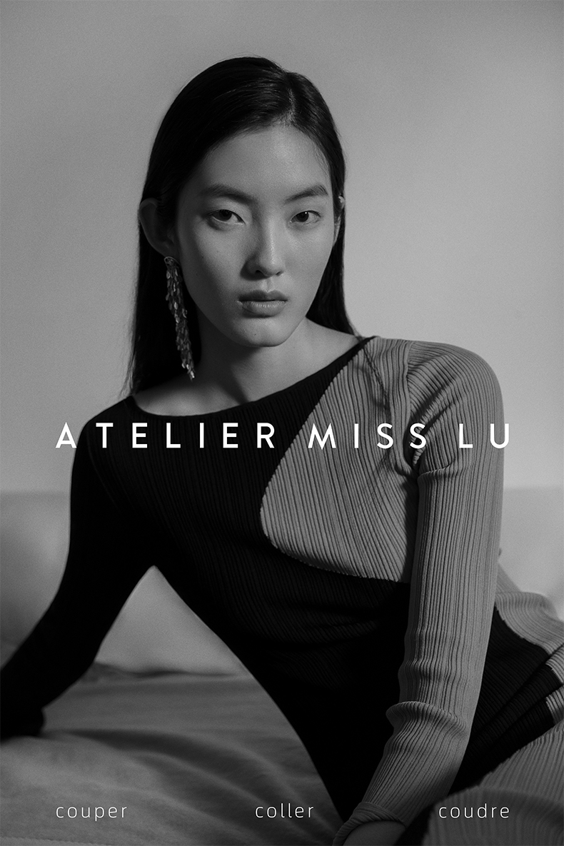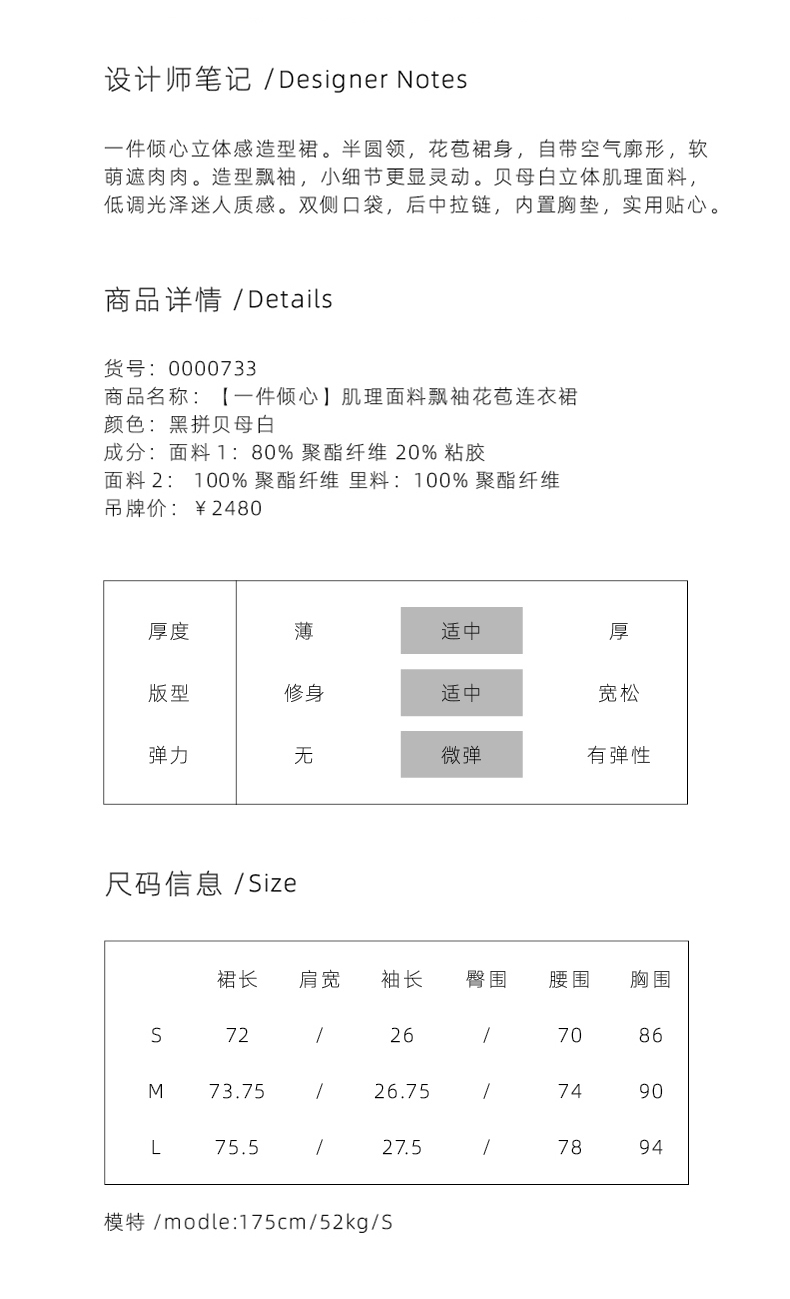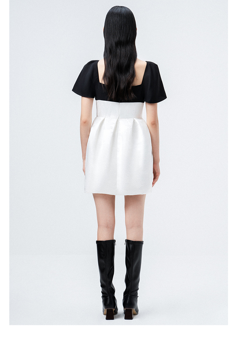 【一件倾心】半圆领黑拼贝母白肌理面料飘袖花苞连衣裙/0000733