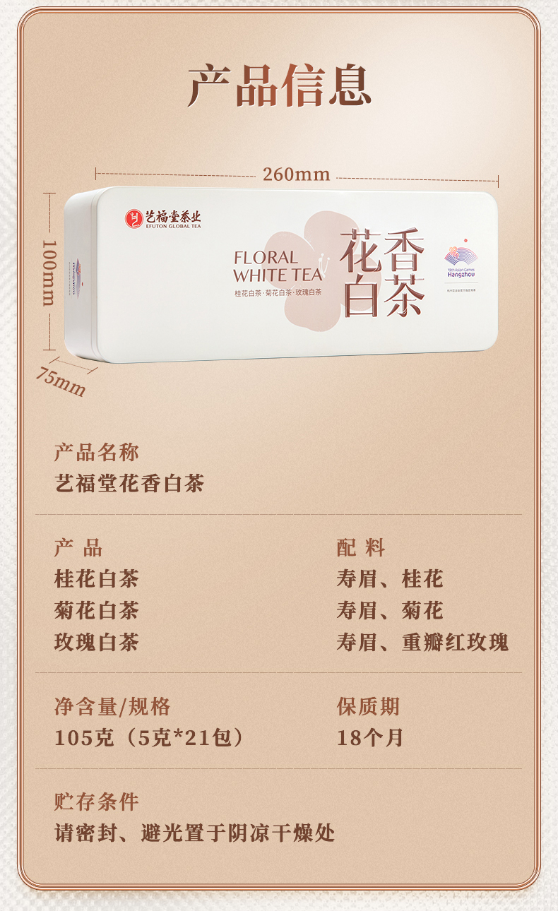 艺福堂花香白茶105g/盒 福鼎原产白茶寿眉 枣香蜜韵