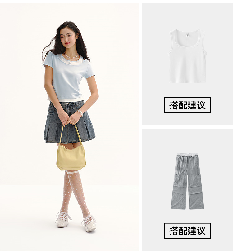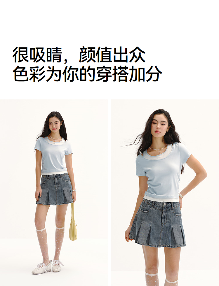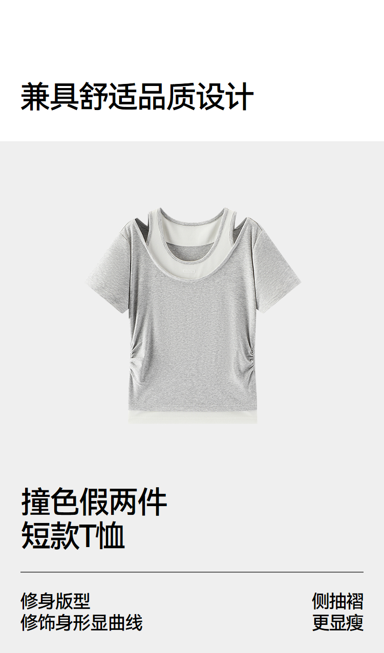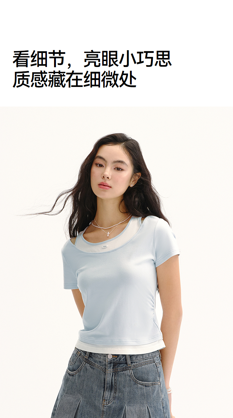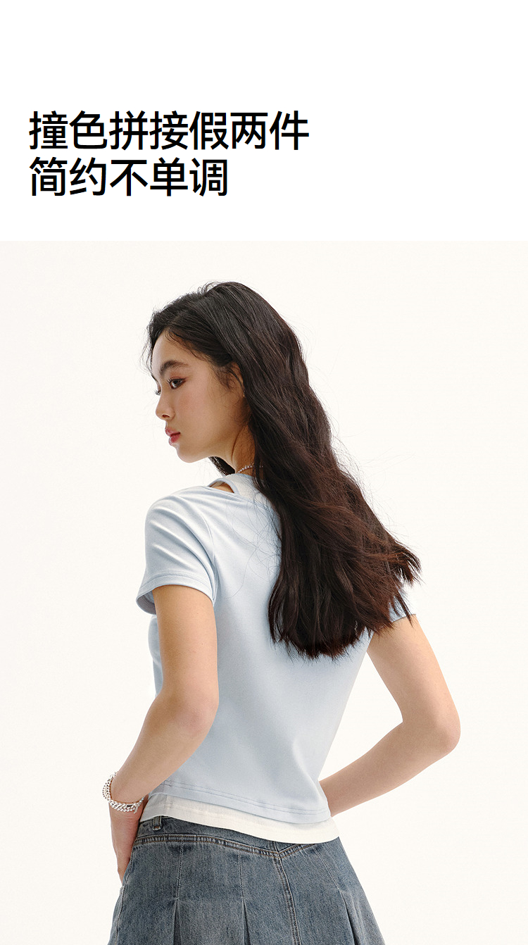 商场同款|森马短袖T恤女夏季短款修身假两件2026新款百搭显瘦上衣