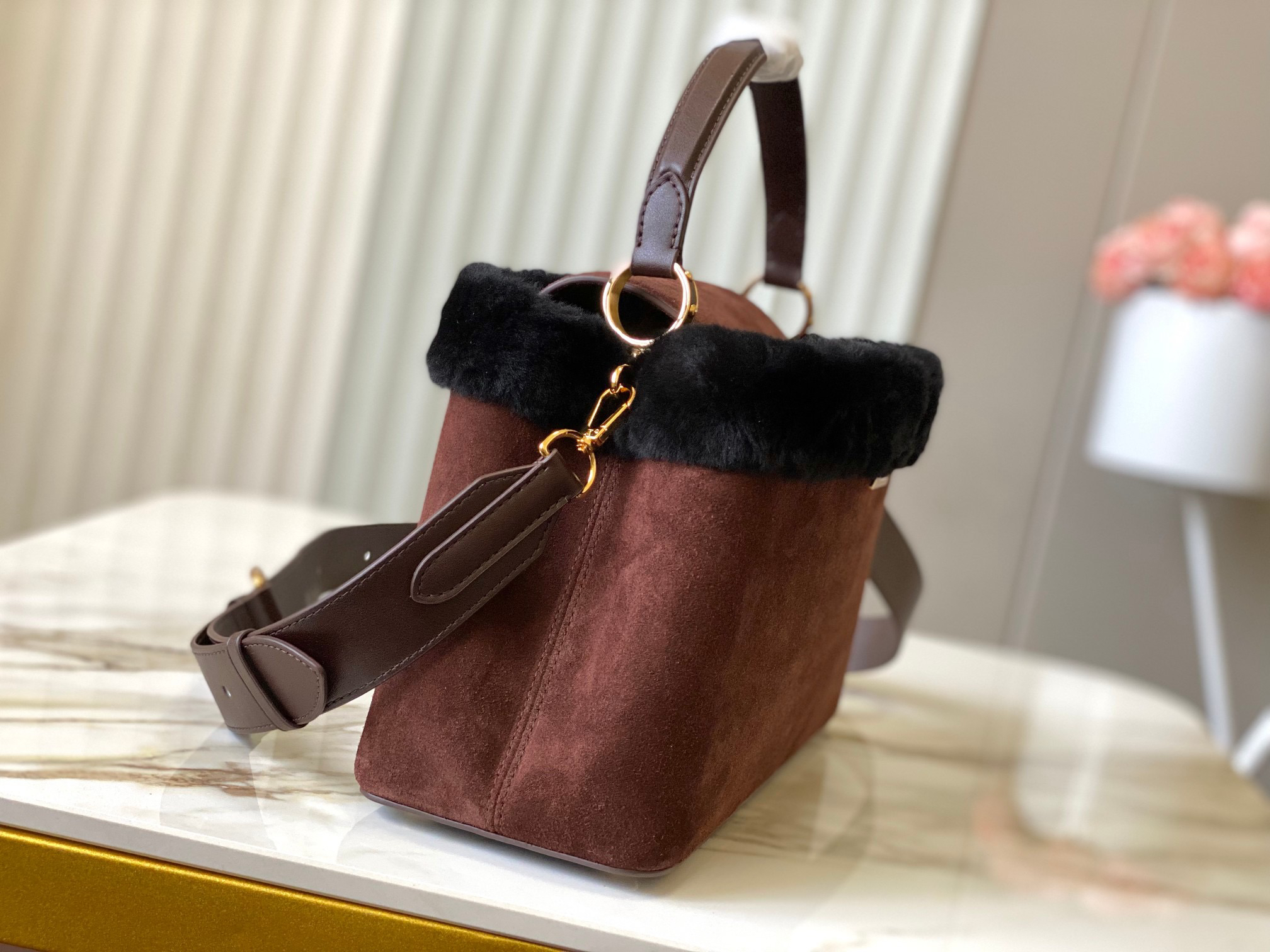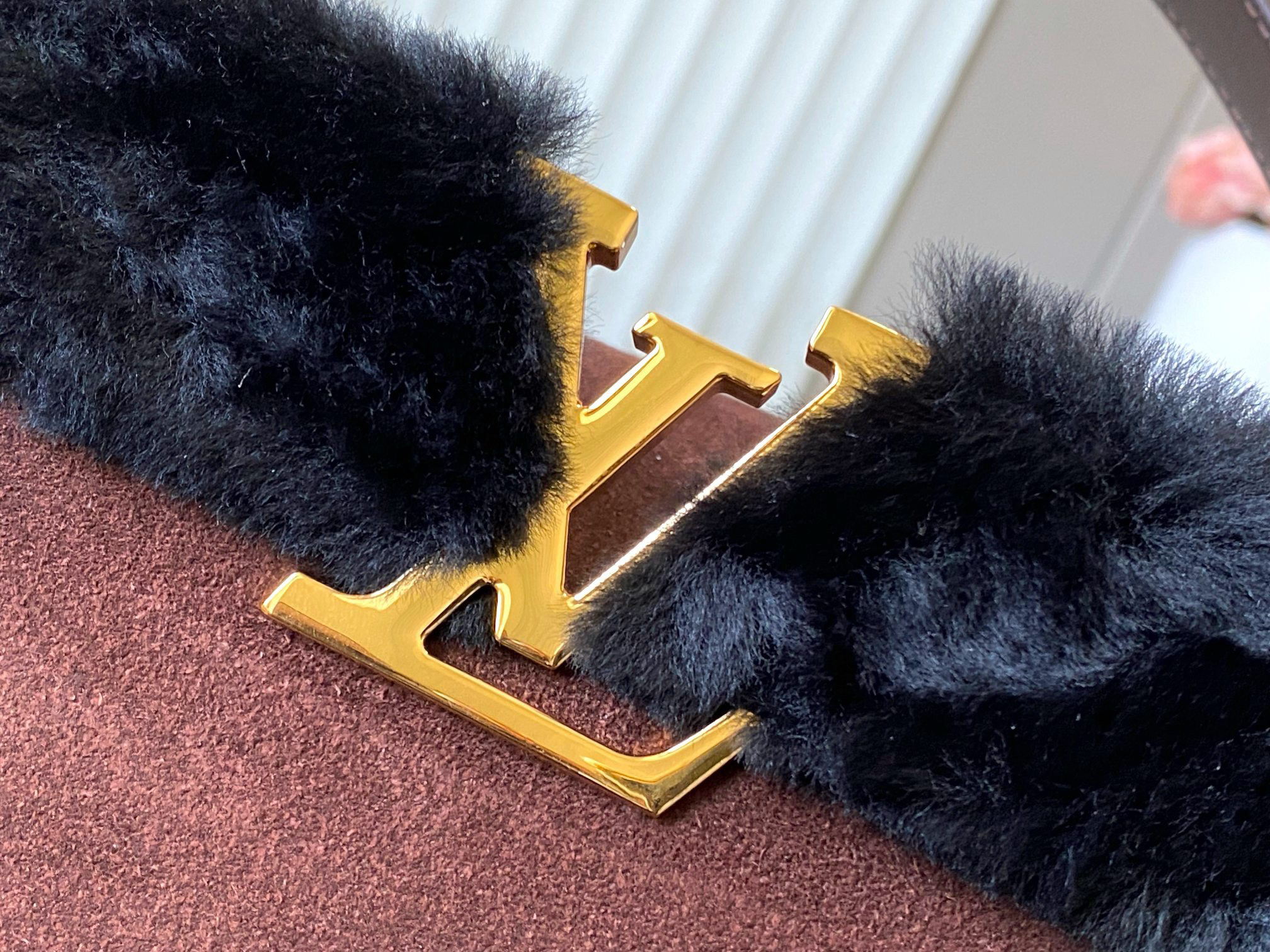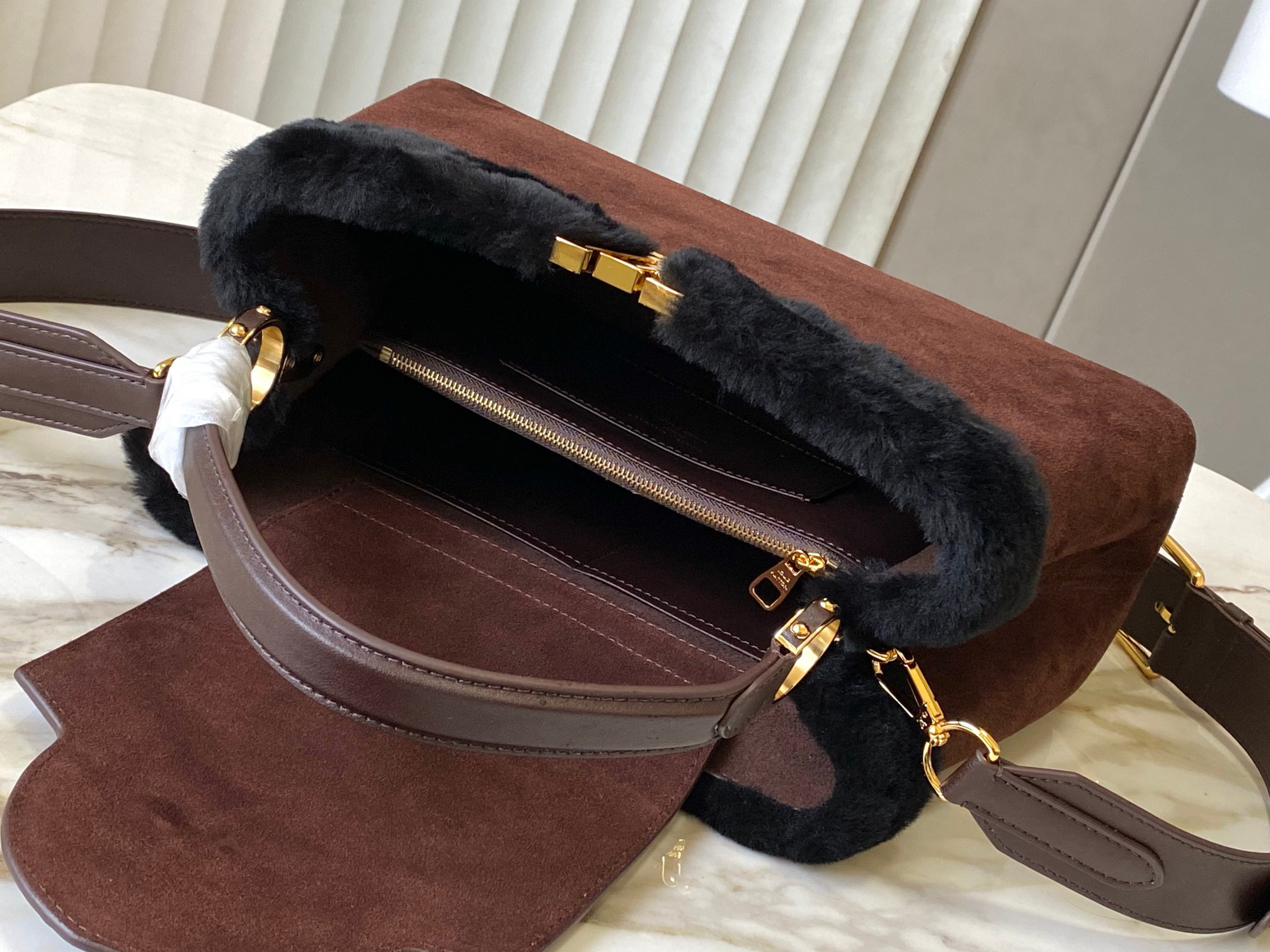秋冬特惠💰1600 渠道级LV 新品 te级LV 动态芯片 M26323/M48865棕拼黑绒毛 作为 Cozygram 系列的一部分 优雅的 Capucines MM Souple 现已焕新 专为滑雪胜地及其他场合而设计 这款 LV 滑雪版是一款时尚且独具特色的单品 采用精选的麂皮和羊毛混料制成 呈现出浓郁的巧克力色调 与金色调的 LV 字母标识完美相映成趣 Size : 33 * 24 * 12 cm