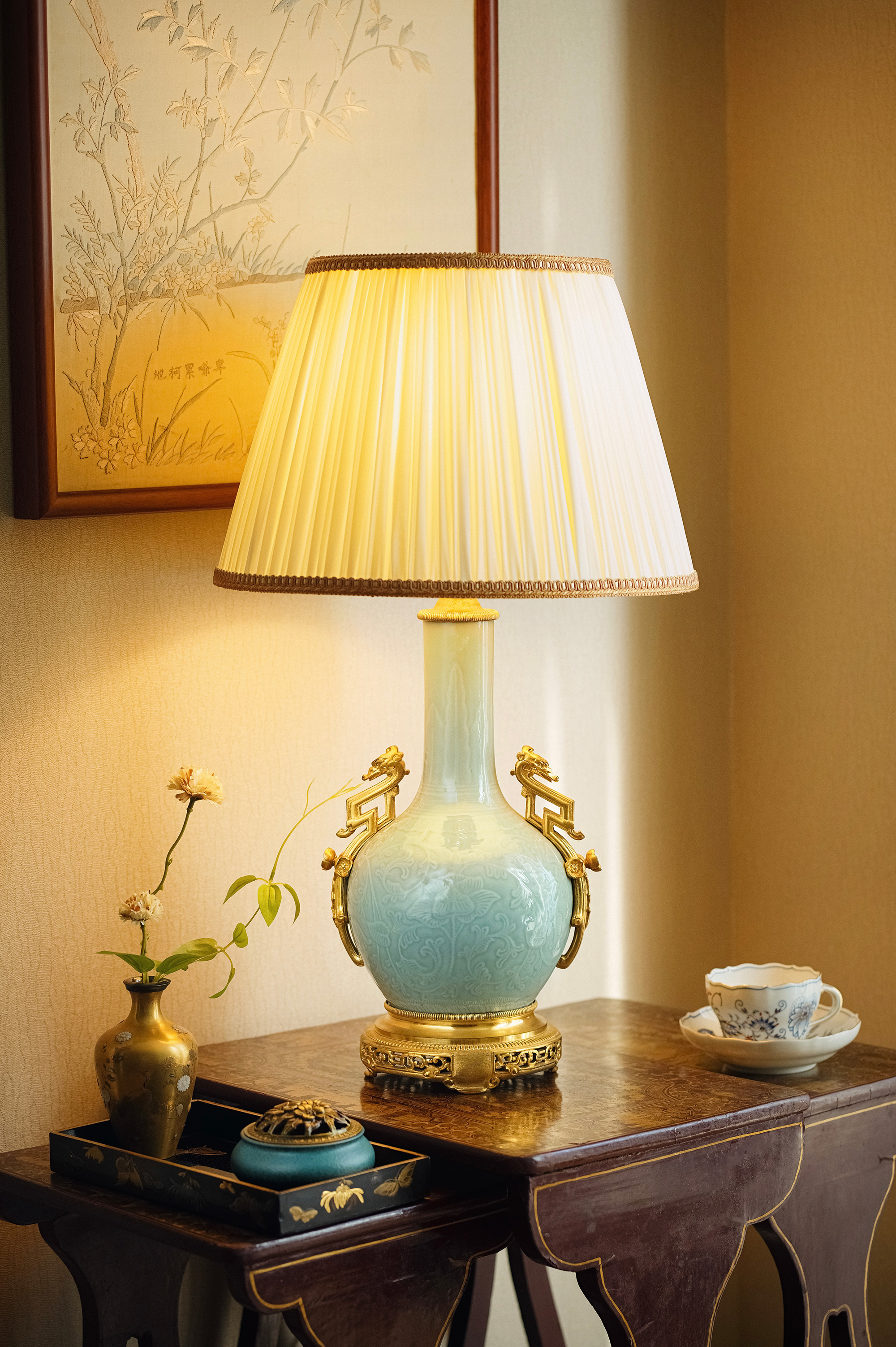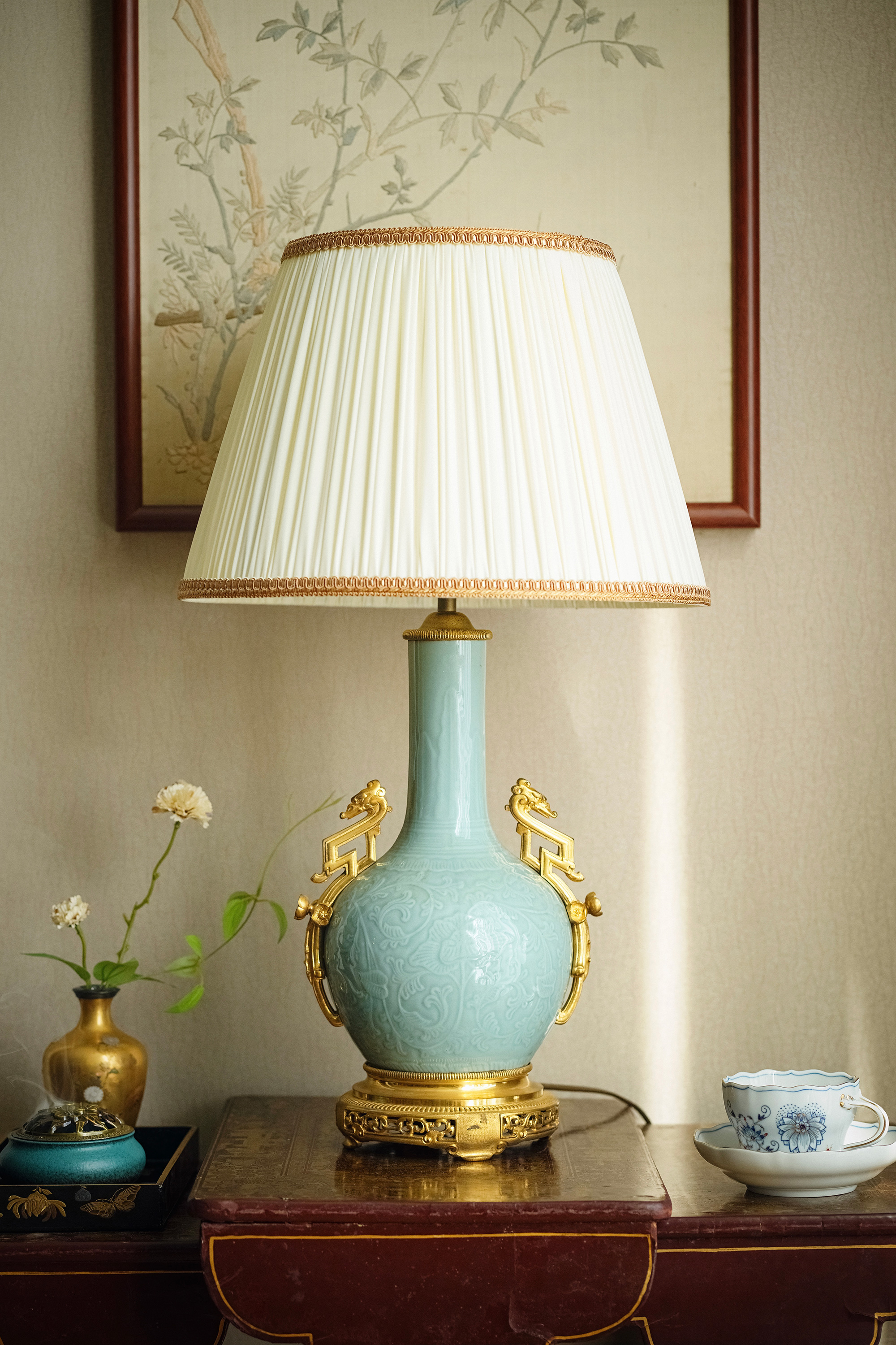 独角鹿西洋古董20世纪法国出品东方风格祥云盘龙主题铜鎏金精雕底座装饰中国粉青釉花卉纹浅浮雕瓷瓶台灯