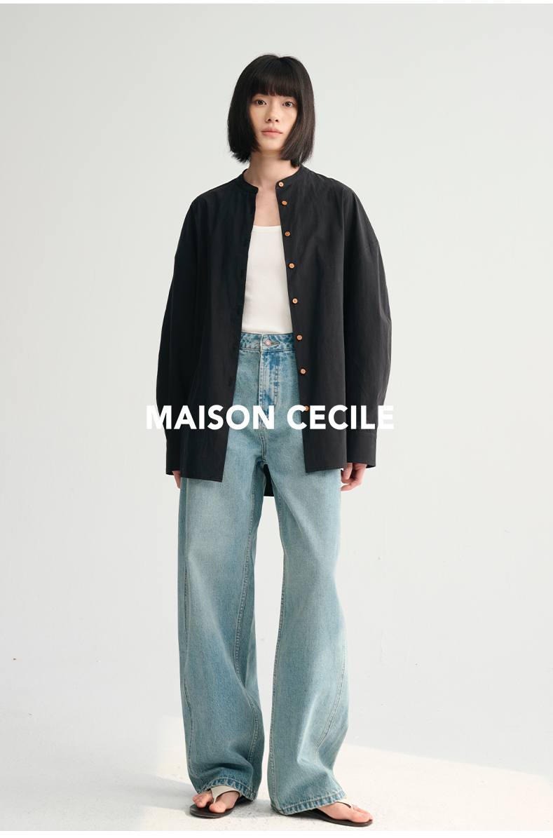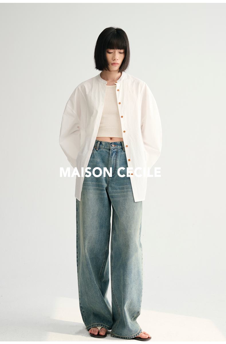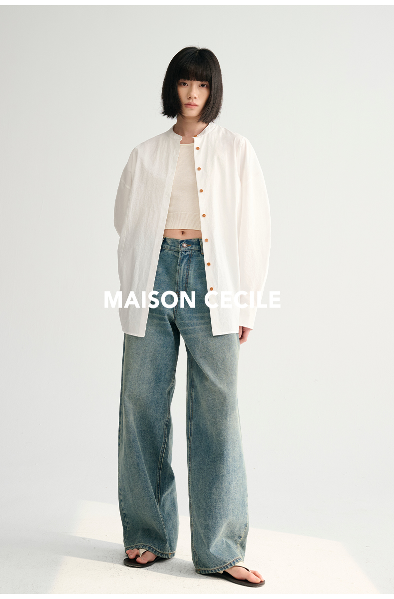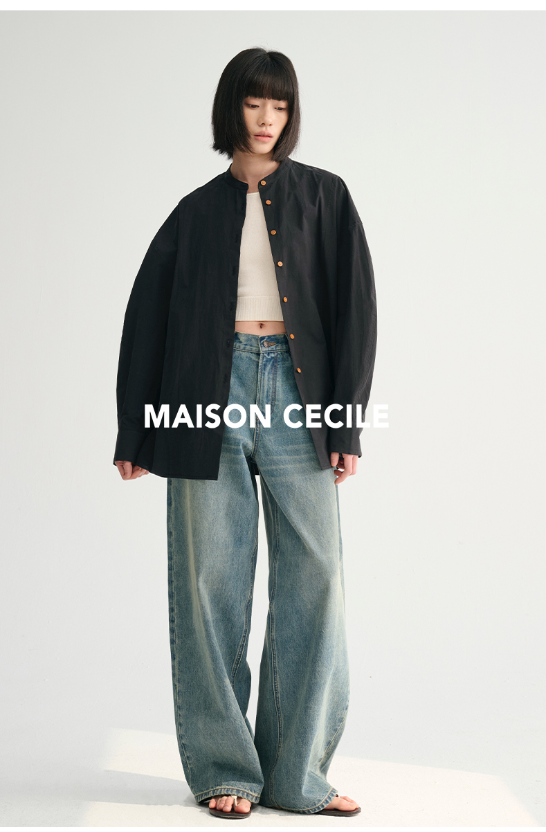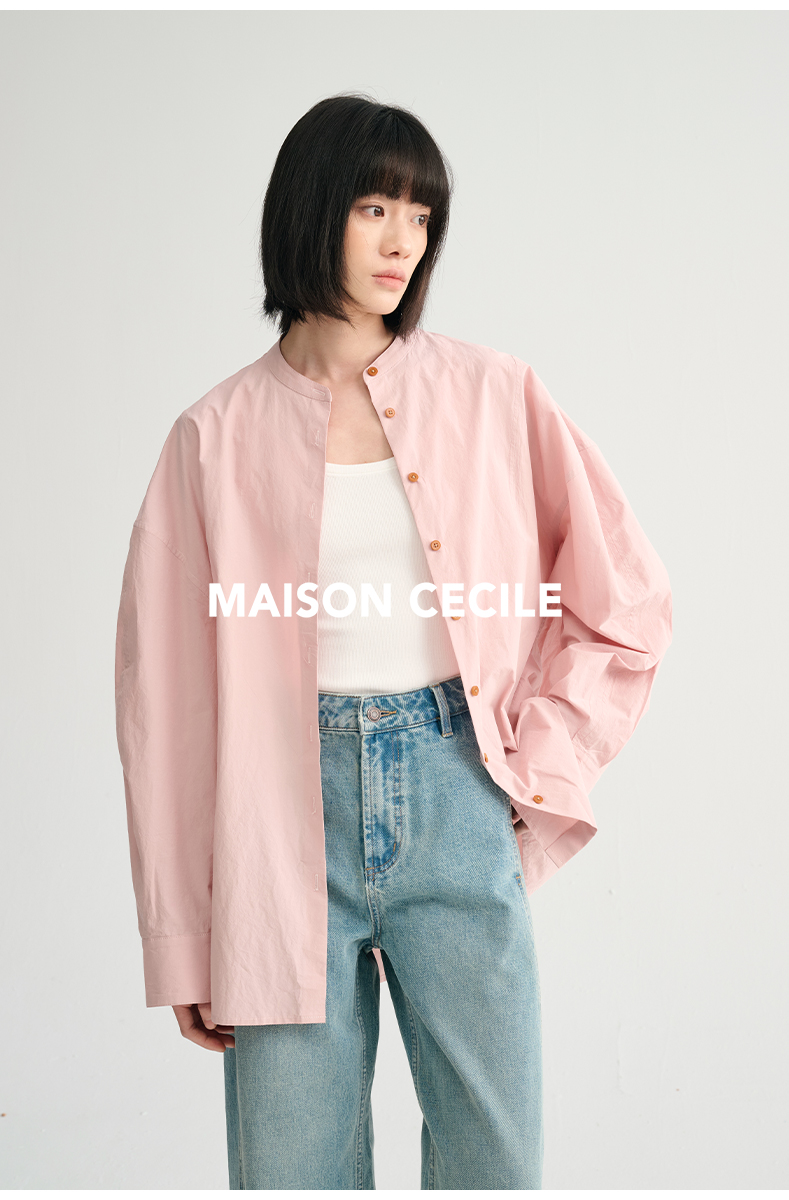 MAISON CECILE三色/弧形袖全棉圆领宽松随性风衬衫