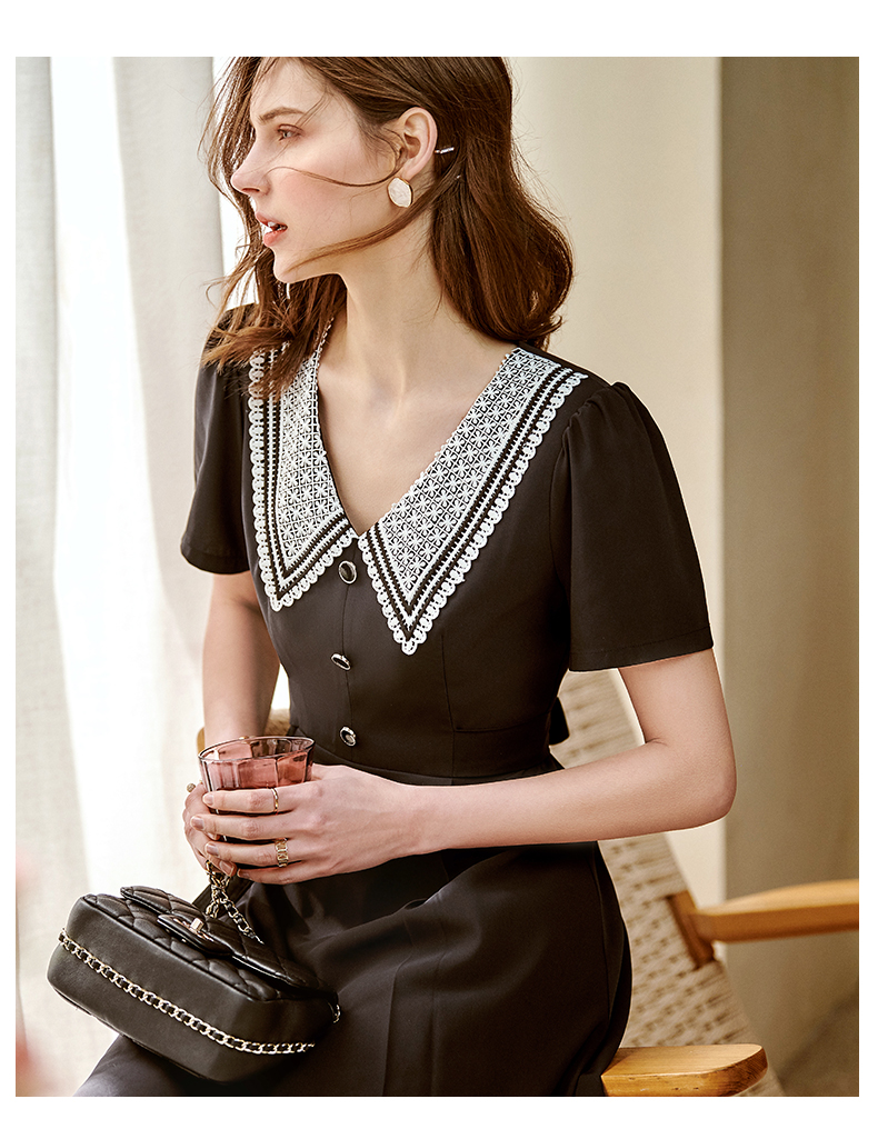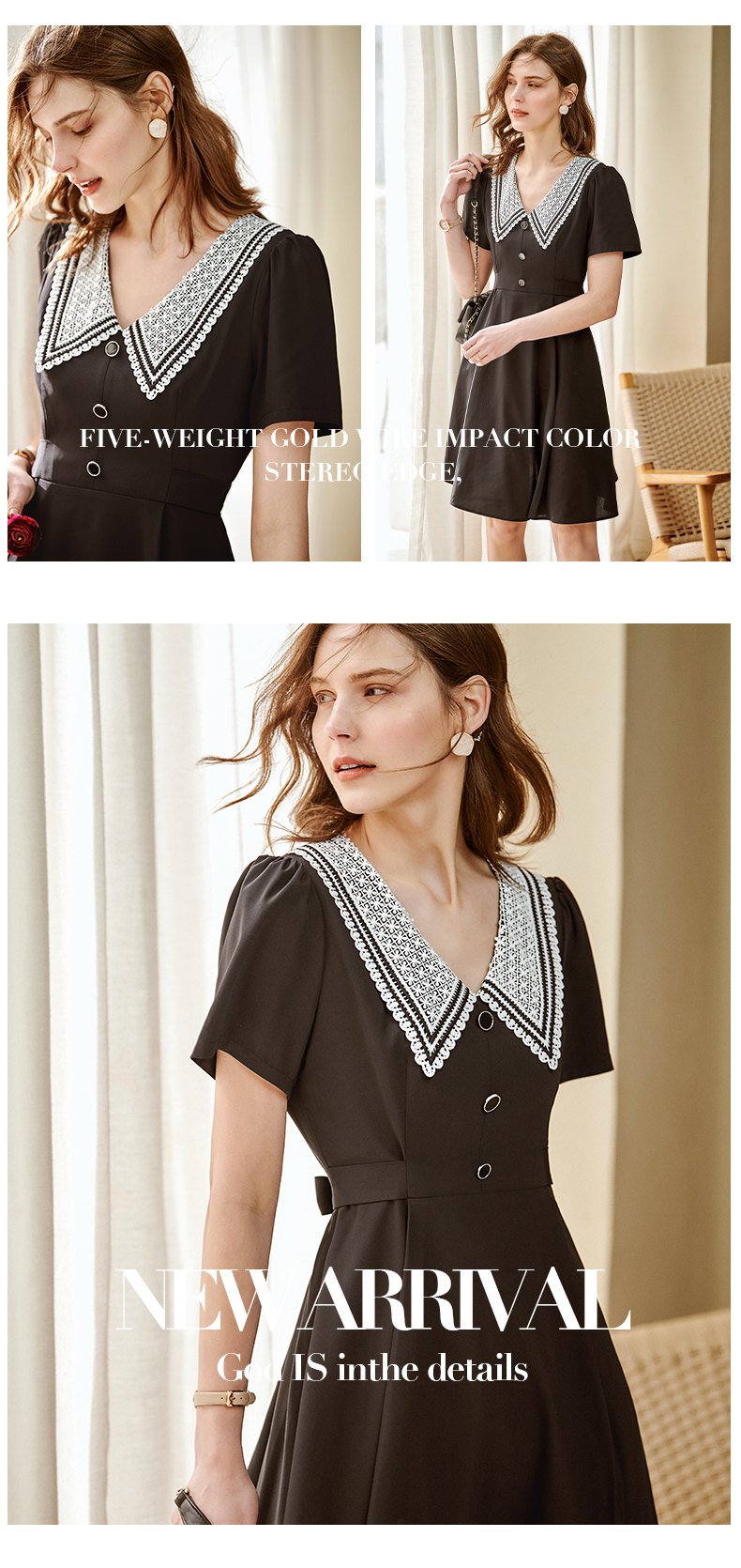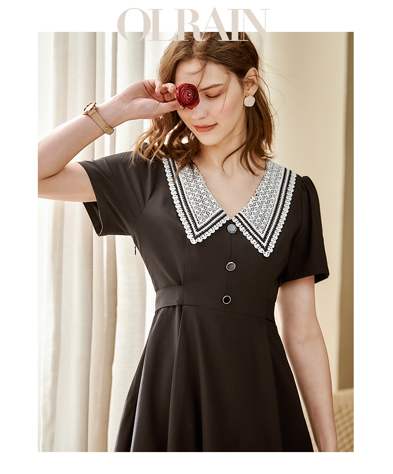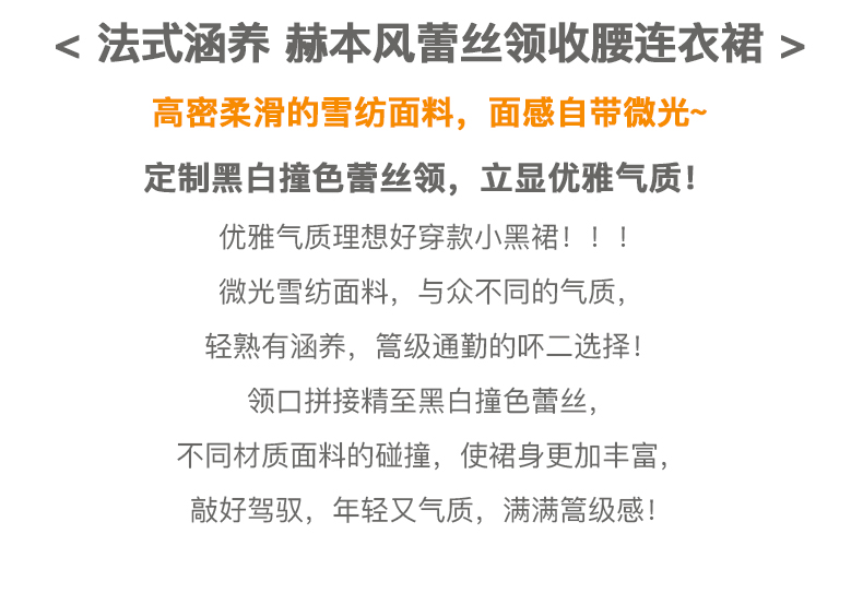 欧芮儿赫本风法式连衣裙2021春夏新款蕾丝方领复古收腰雪纺小黑裙